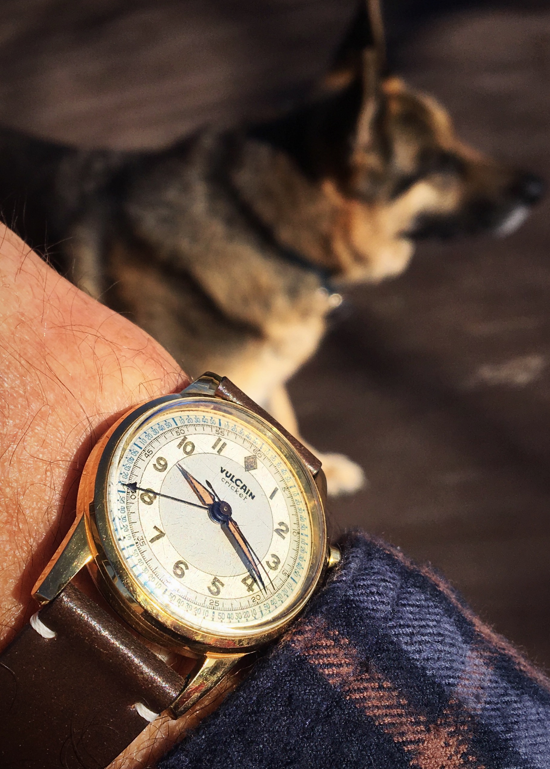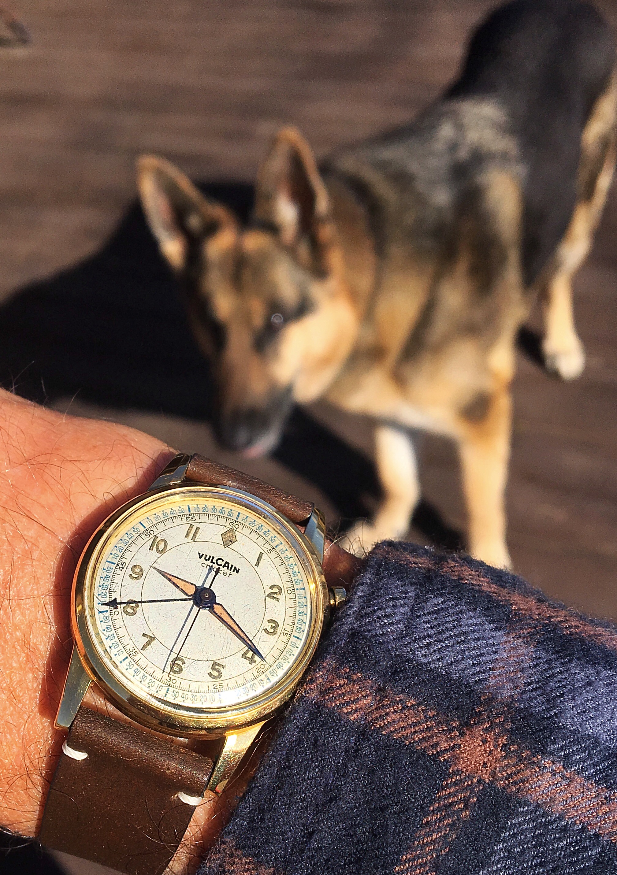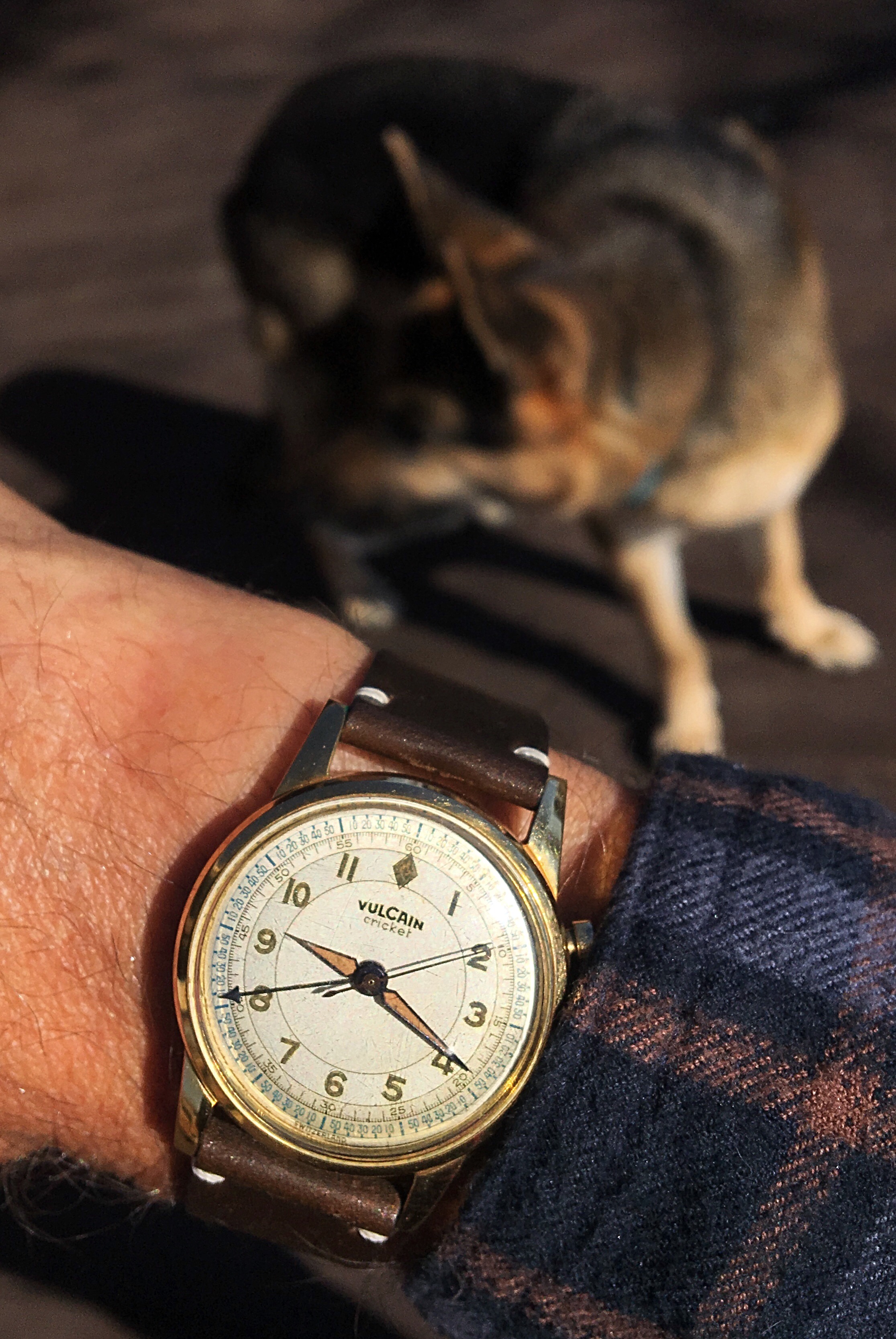 The other pup at sister’s, ‘Kaiser’. He prefers more modern watches than this 50’s Vulcain Cricket because he’s obsessed with chasing sapphire crystal reflections 😁...