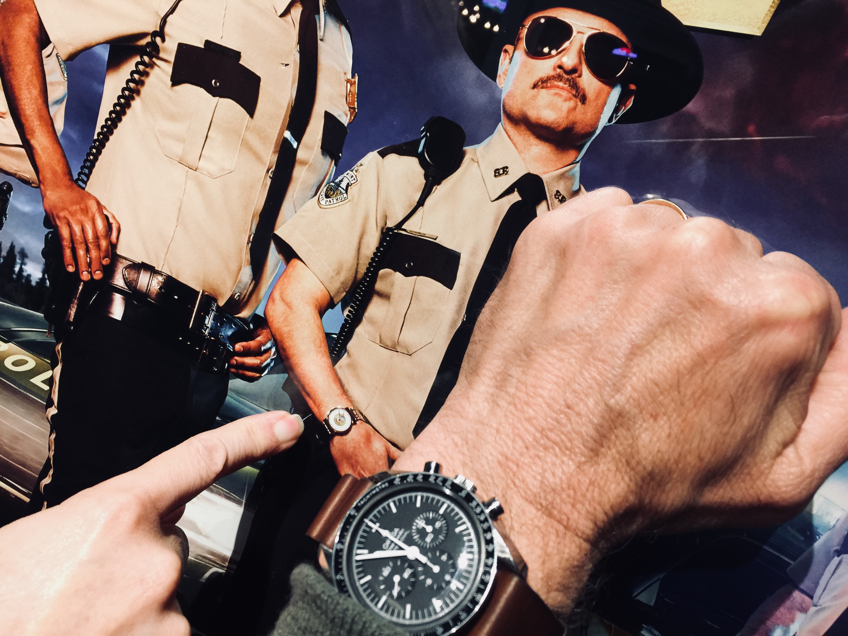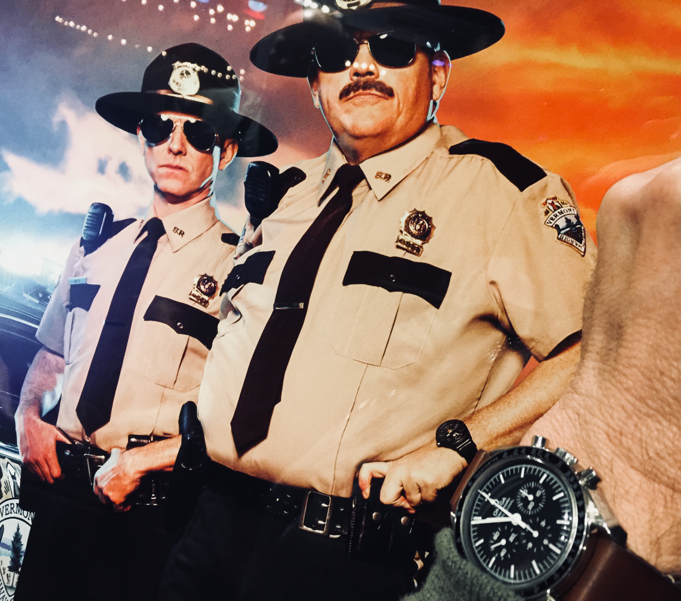Posts 6,584 Likes 78,290 Mad Dog 路Apr 20, 2018 Speedy Gonzales Moonwatches on Omega Barenia leather NATOs today for @ChuckMK23 and myself at Super Troopers 2... ...and then at Hooters where a Super Troopers 2 poster was on display...we attempted [unsucessfully] to identify Mac and Farva鈥檚 watches...