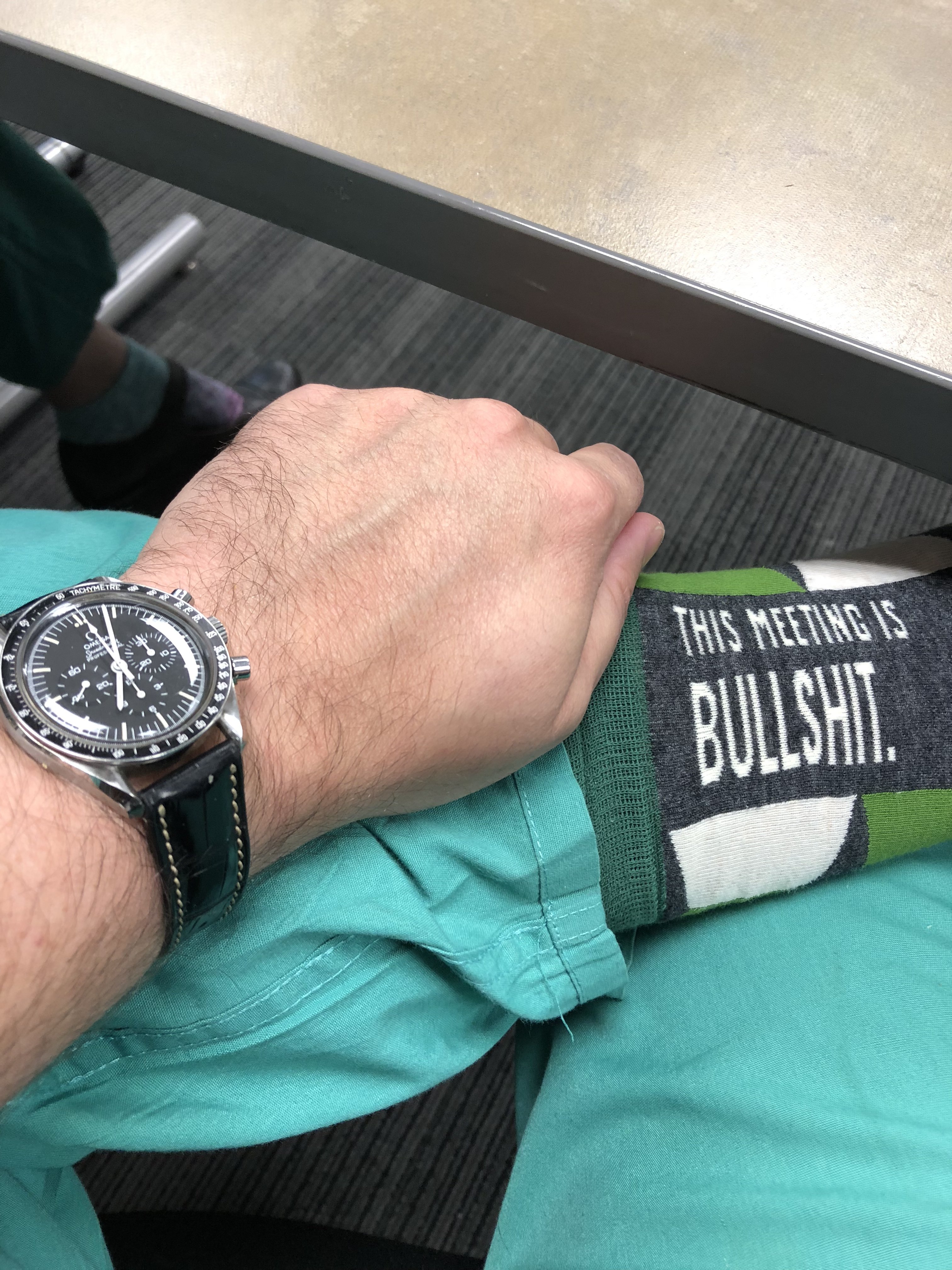 Wearing ‘78 speedy during my 6:30 AM meeting about how the institution is charging us substantially more for our benefits package without increasing the benefits. The socks say it all. On a brighter note, my first patient’s husband noticed and complimented my watch today, so that was nice.