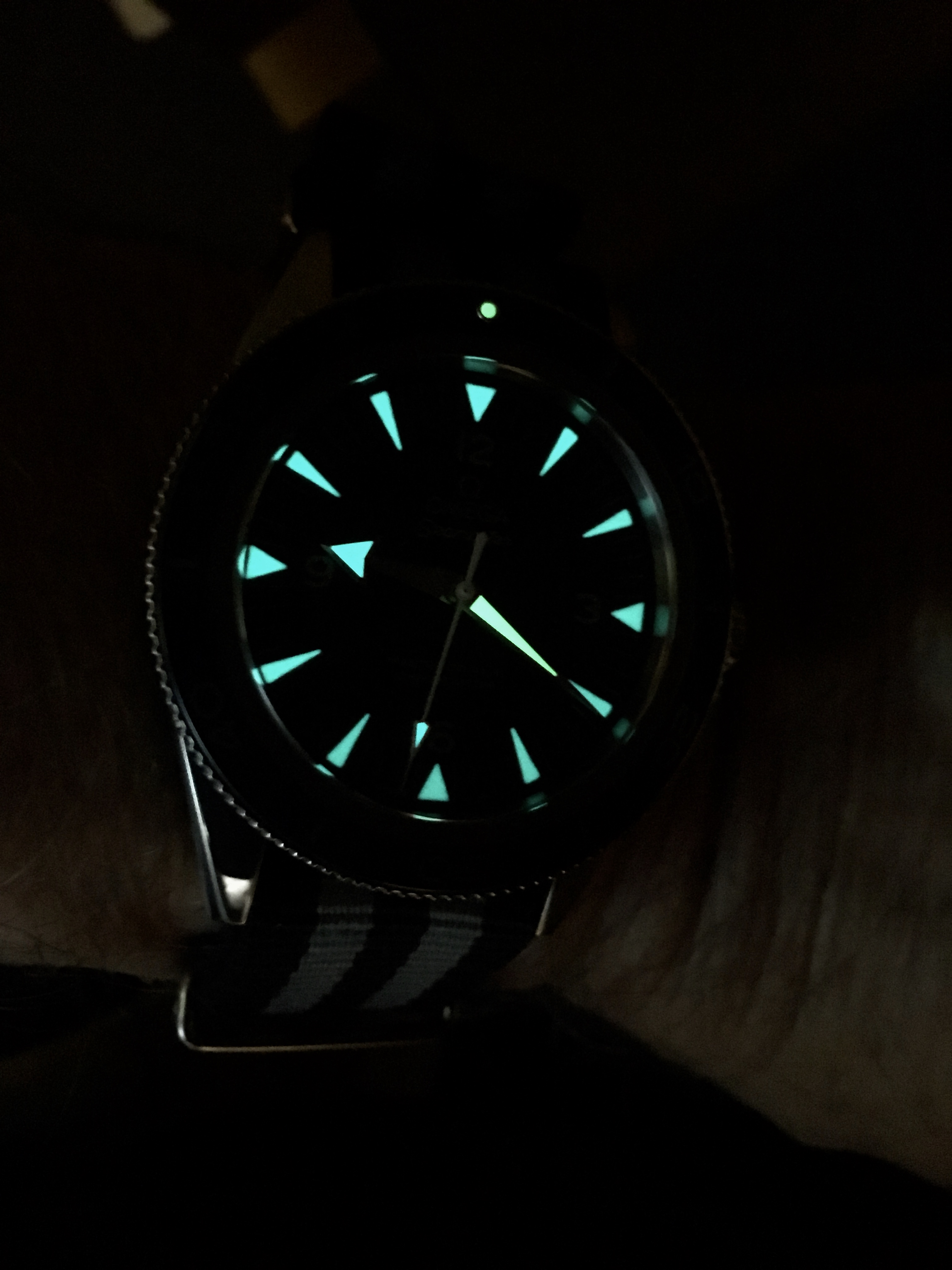 Posts 6,700 Likes 52,753 noelekal ·May 5, 2018·Home For Wayward Watches Alpha No change this evening, Lume shots are always fun. Wish I had a watch with big lume. Nary a watch on the place has any noteworthy lume. The Speedmaster's lume is gasping its last as is an early 80s Seiko diver recently acquired. The rest are deader'n virginity.
