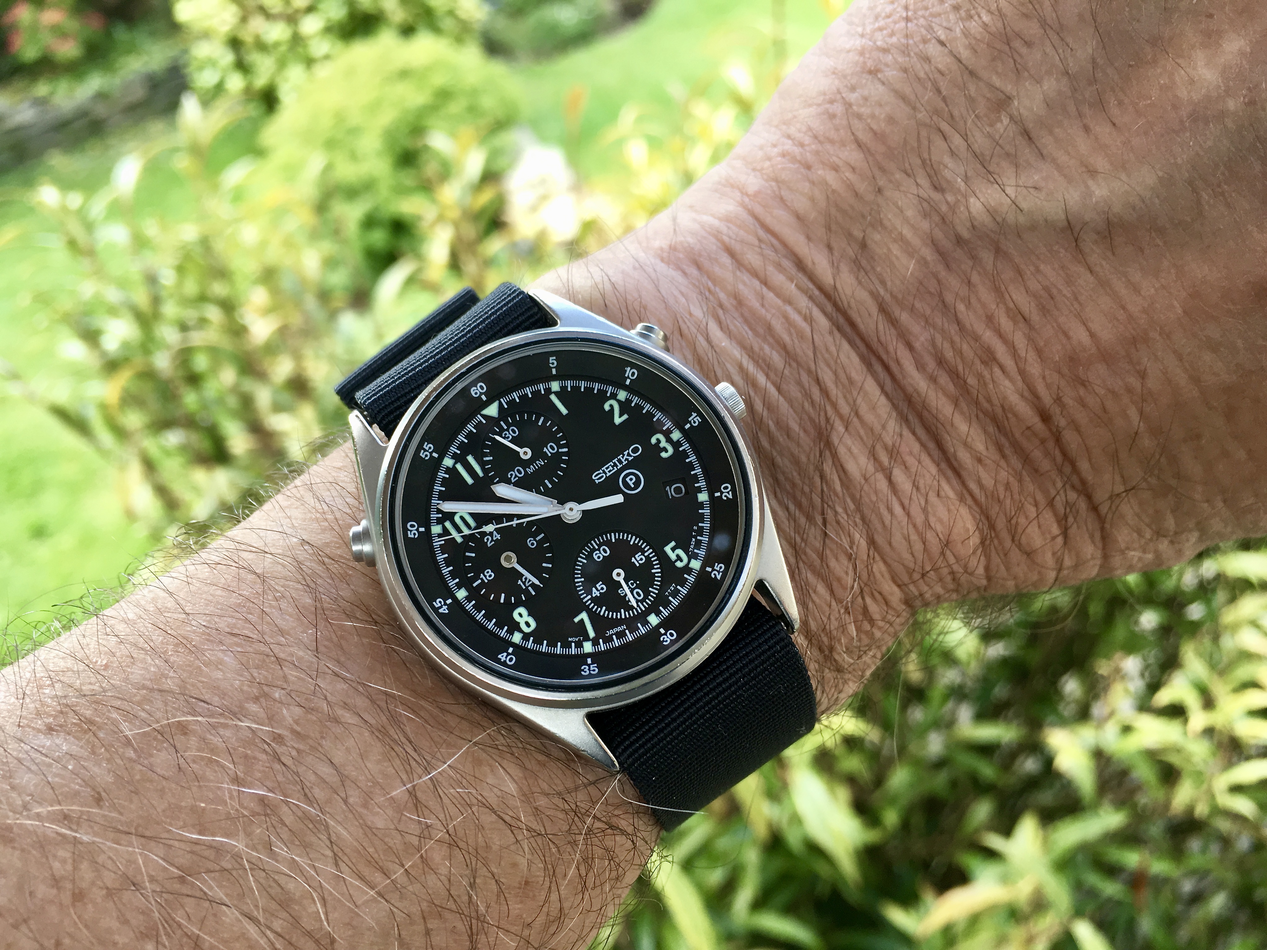 Wearing my new to me, early '69, maybe just pre-moon, minus the bezel, Speedy. Because my Panda is still at the spa, I am using it to time my walks. 2 miles in 31 mins and 2 seconds today. Down to 202 pounds from 216 now and I have shaved a good minute off my time. Hope everyone has a great day!