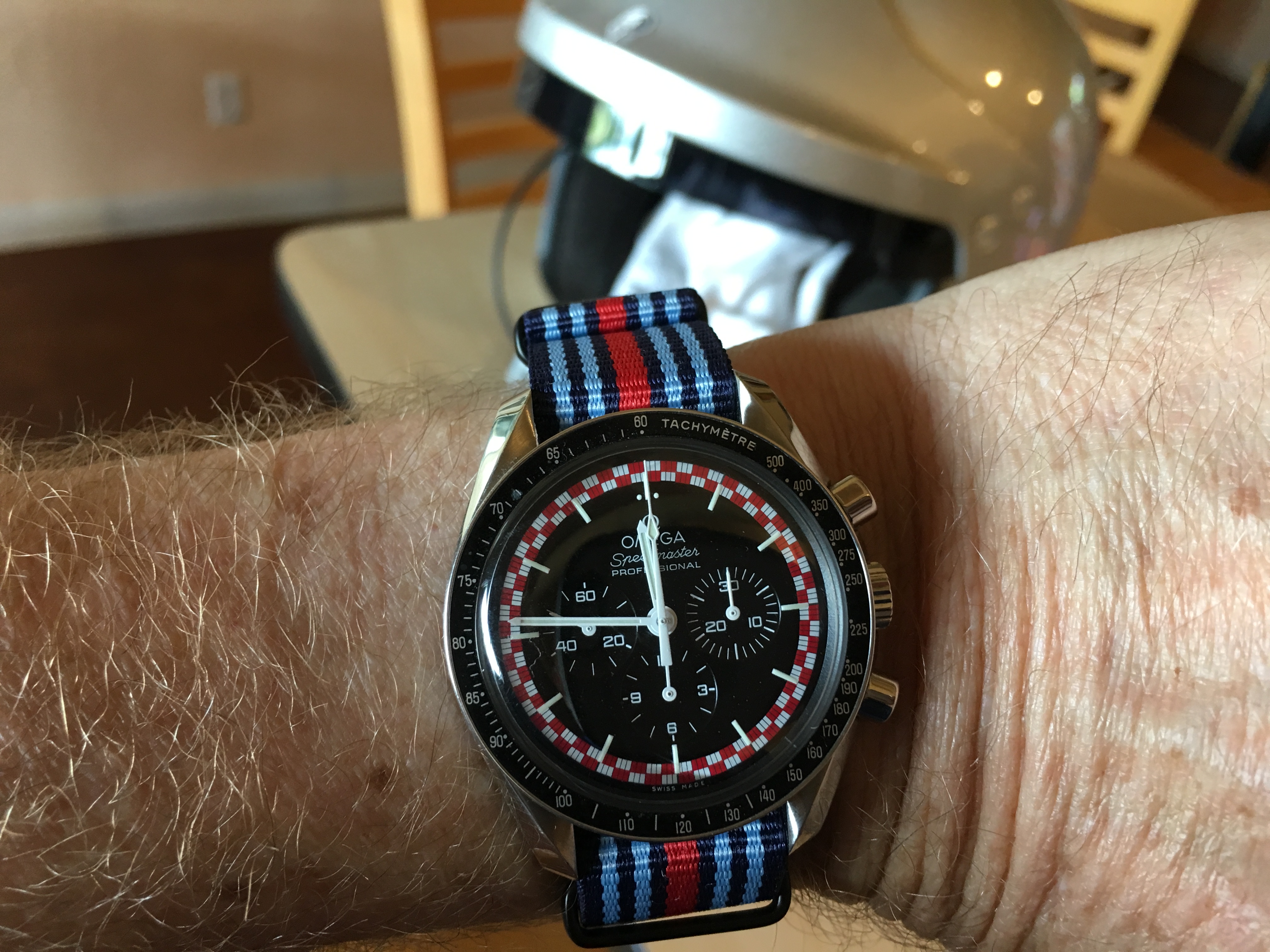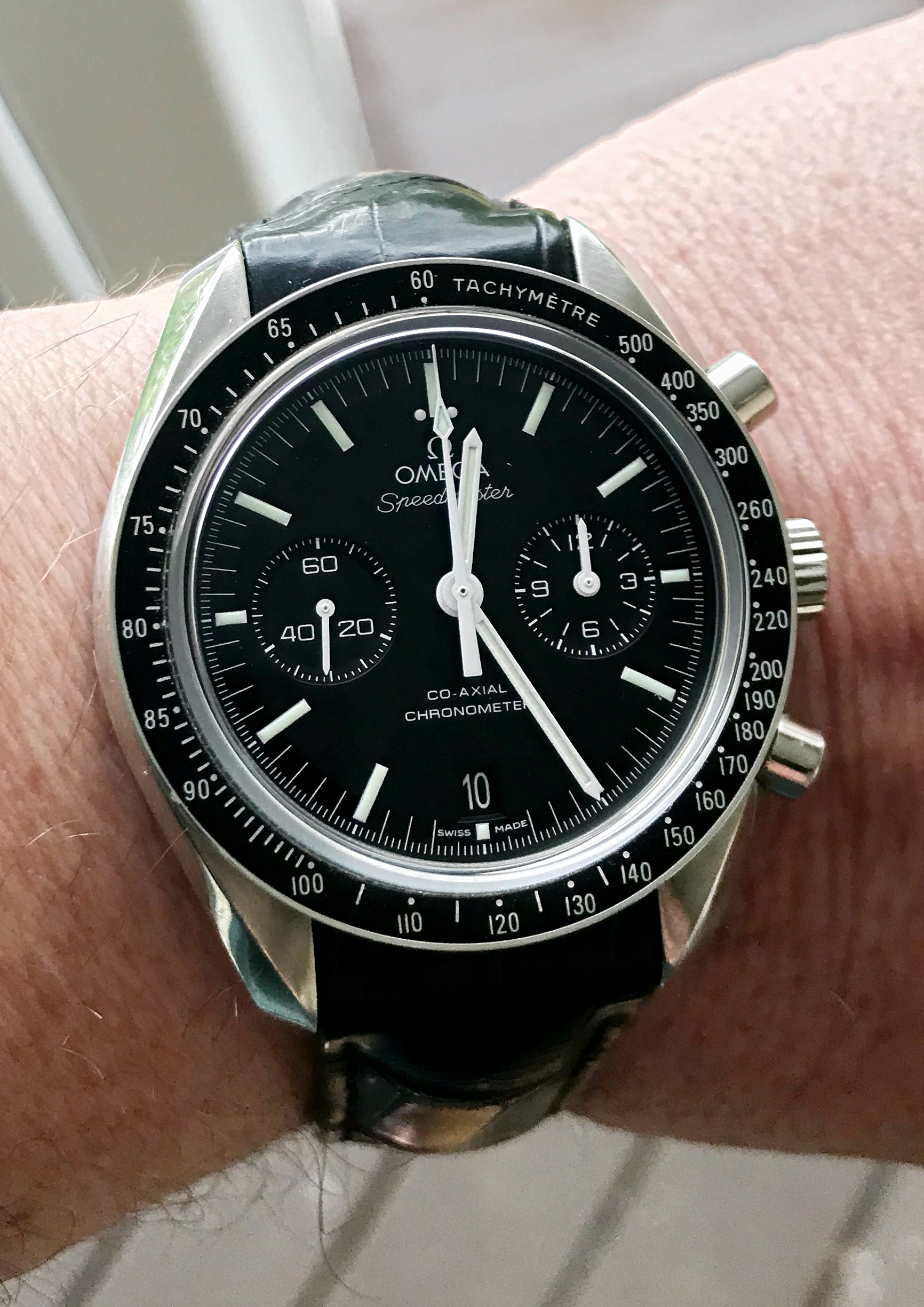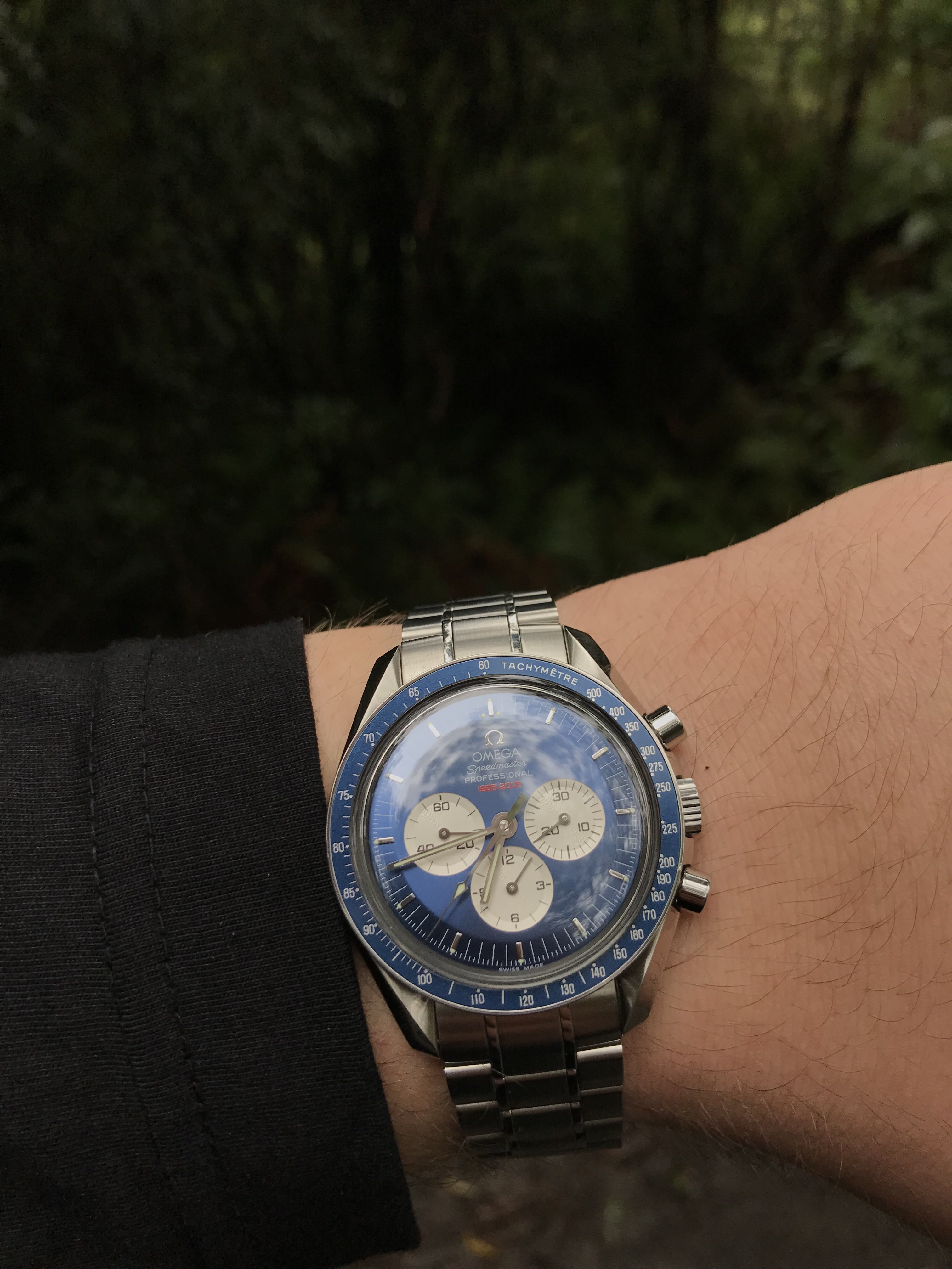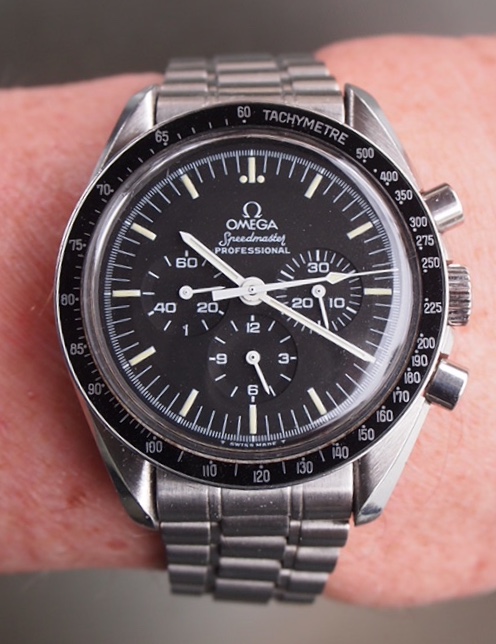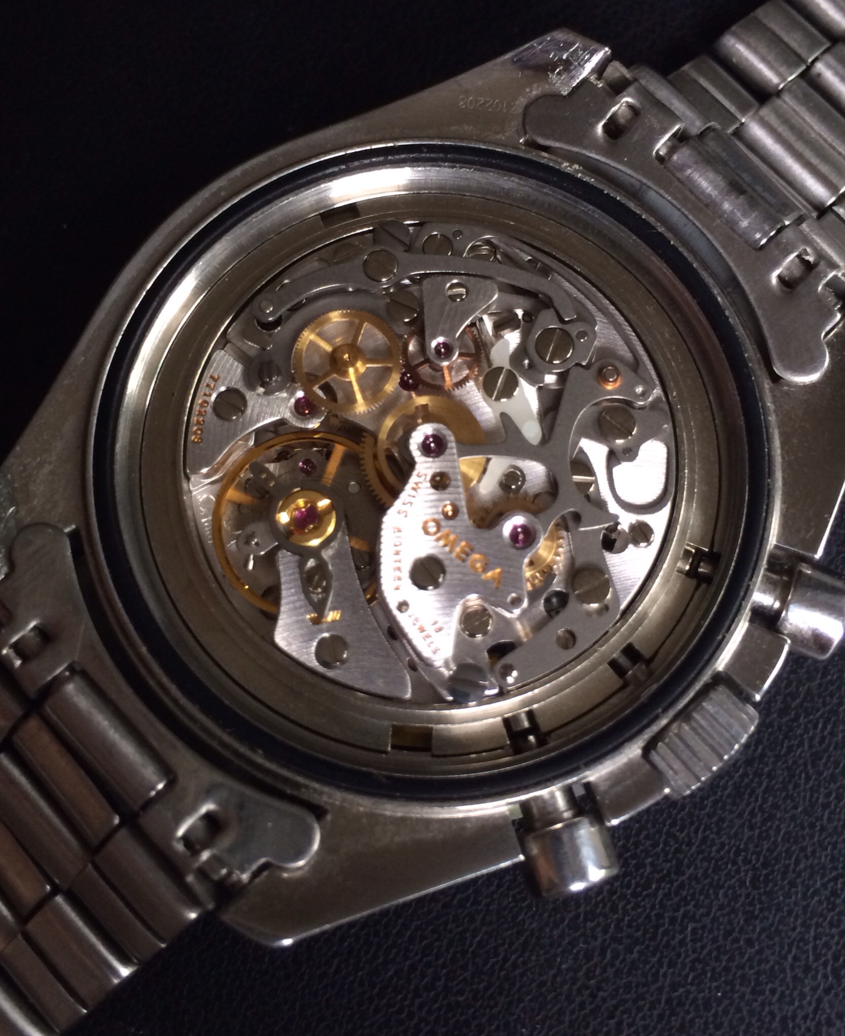 Yet another Speedmaster. My 29 year old one, not the limited edition model, but one also commemorating the 20th anniversary of the Apollo XI mission, landing on the moon. Model 345.0808, shown as introduced in 1980. This one with the sapphire case back, and the gold plated caliber 863 movement, marked in Ranfft as the “Jubilee” model.
