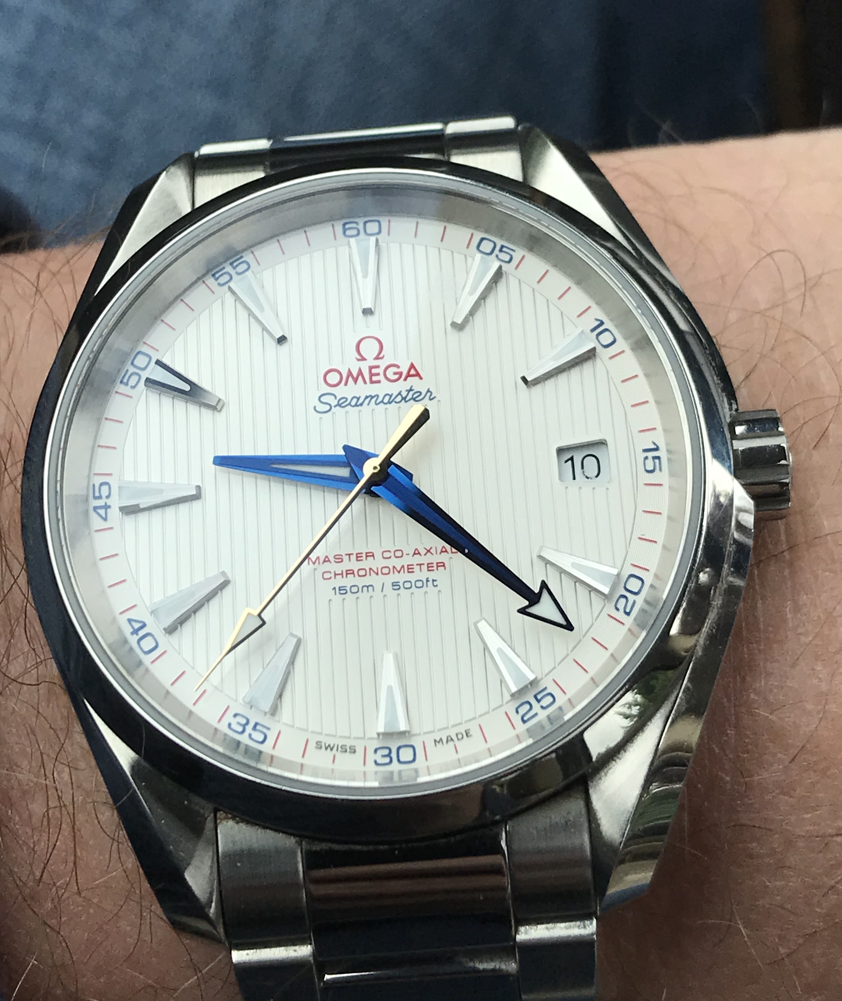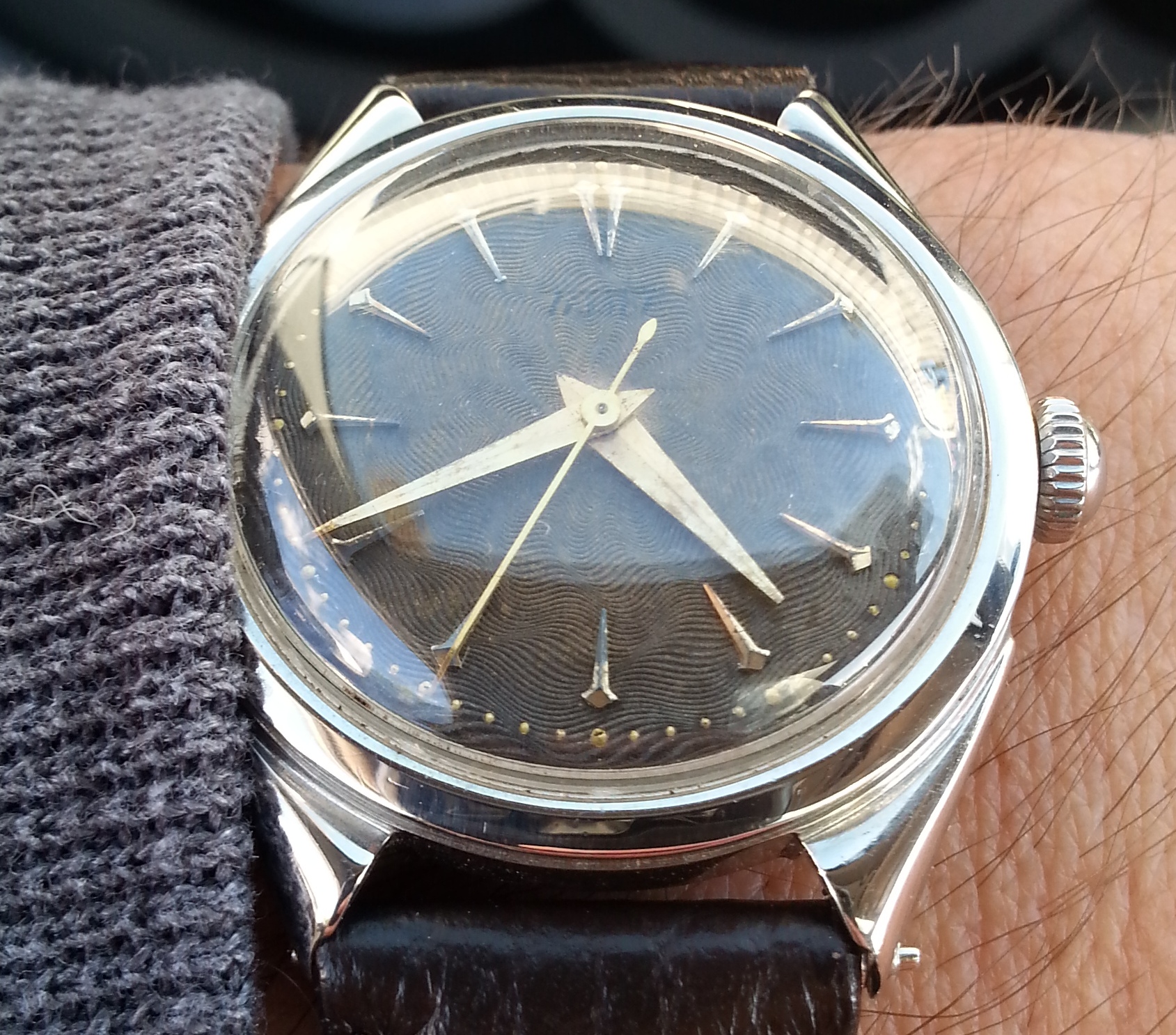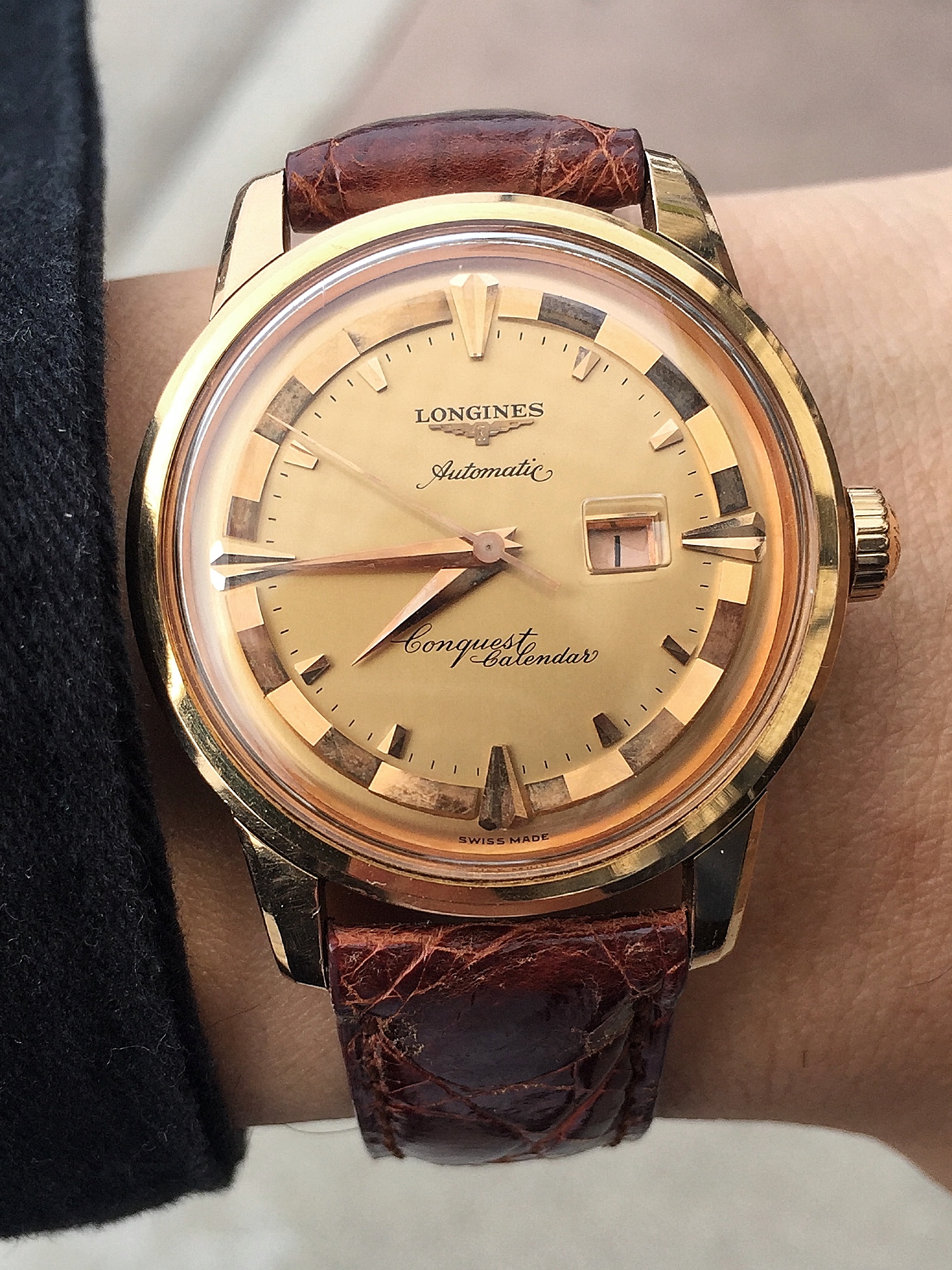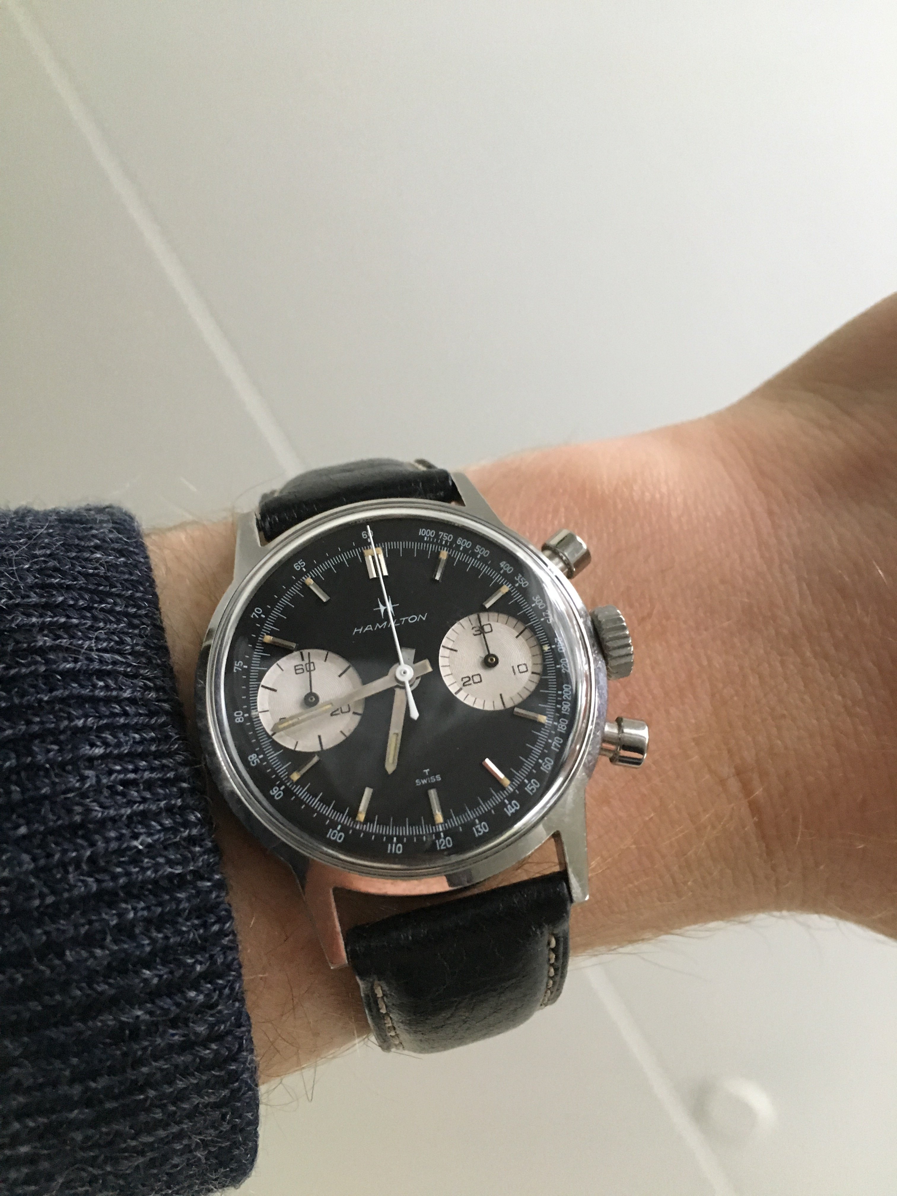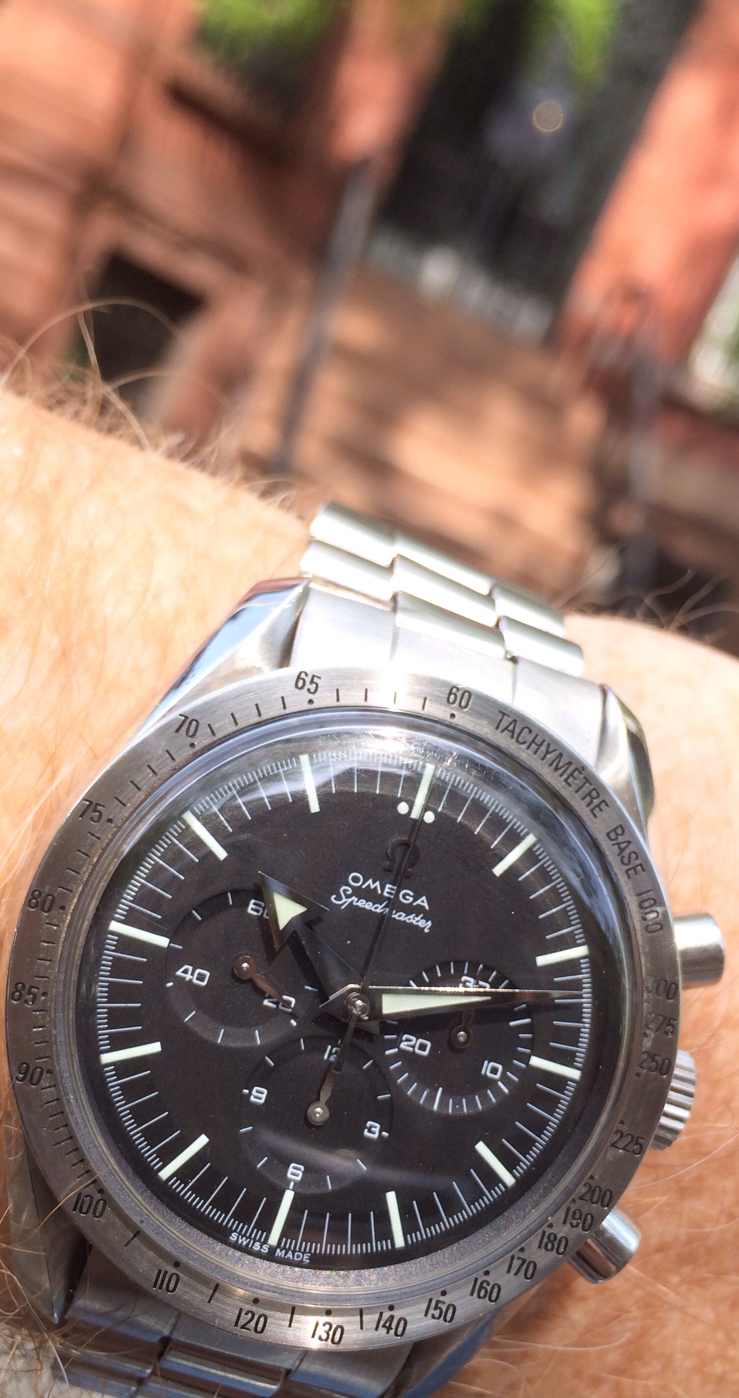Yet another Speedmaster. My 29 year old one, not the limited edition model, but one also commemorating the 20th anniversary of the Apollo XI mission, landing on the moon. Model 345.0808, shown as introduced in 1980. This one with the sapphire case back, and the gold plated caliber 863 movement, marked in Ranfft as the “Jubilee” model.