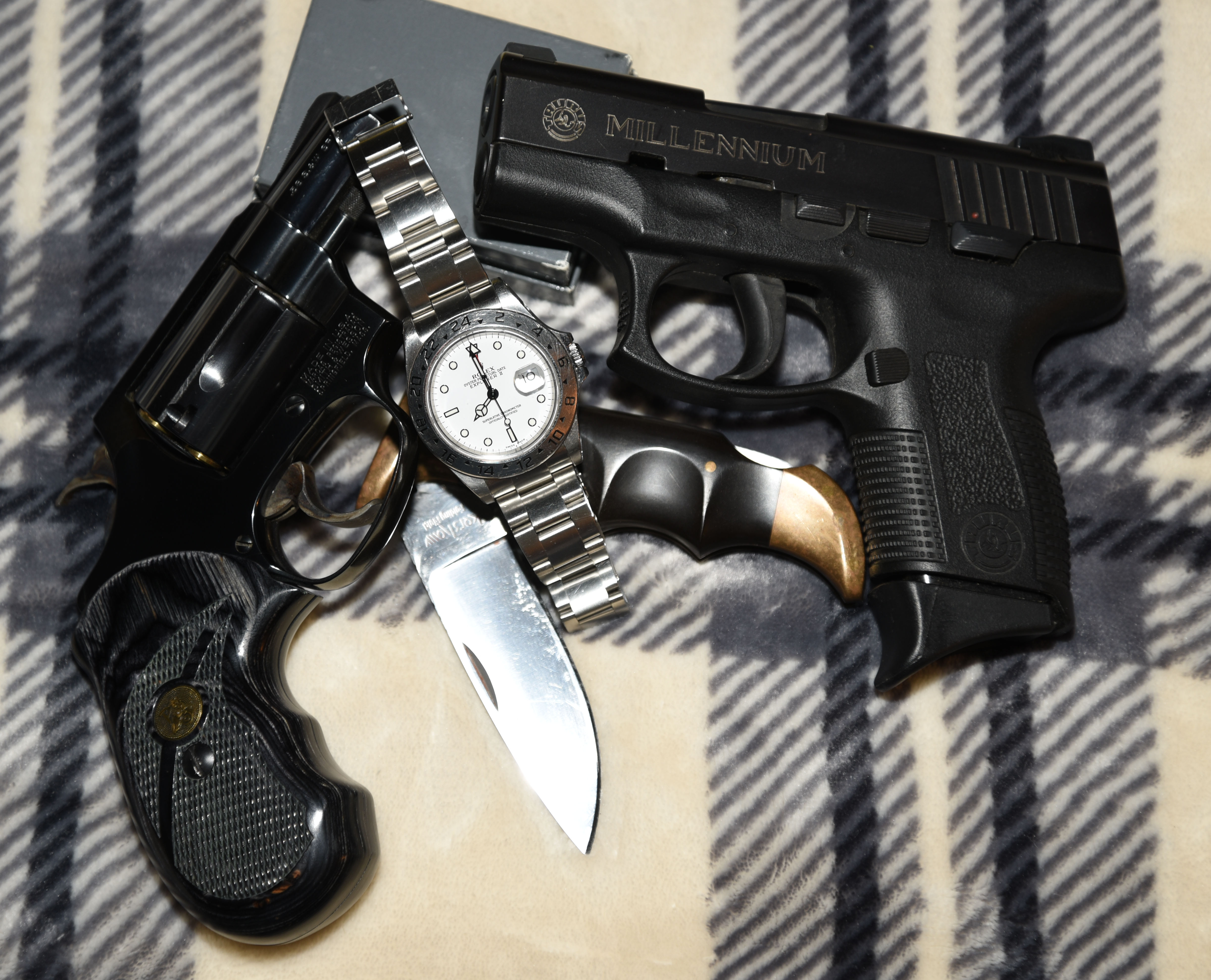 Well since it won't leave me alone thought I would show it with my everyday carry stuff yes every day I carry a .38 chief special a 9mm Taurus a Kershaw folding field while wearing an Explorer II I am well protected and on time and never get the cops called on me in Wal-mart