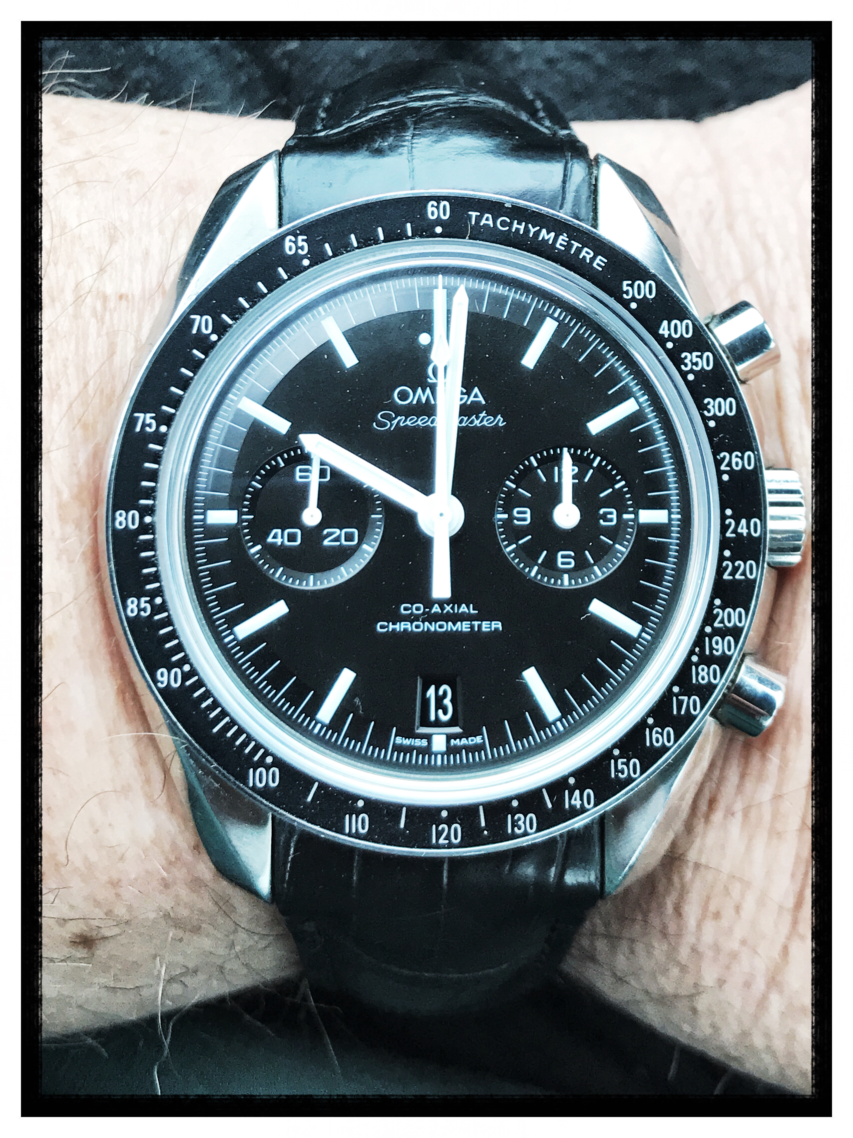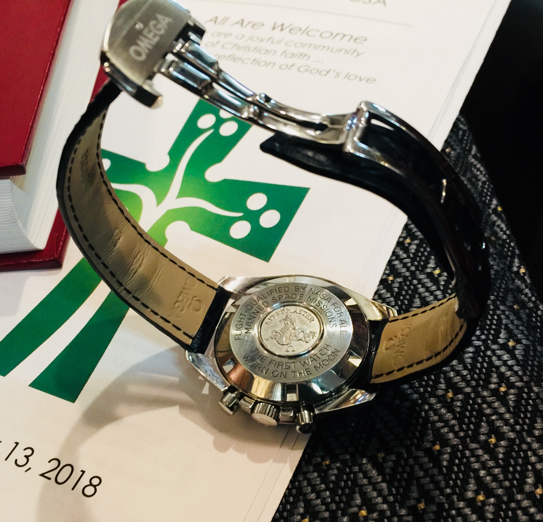 I love the strap with deployment clasp on my Speedy. Especially with the ginormous co-axial models, the metal bracelet makes the watch look even larger and a bit grandiose. Plus the black leather or crocodile goes beautifully with the Speedmaster black face. I鈥檇 also love a solid metal caseback for my Speedy, but alas, no good options yet.