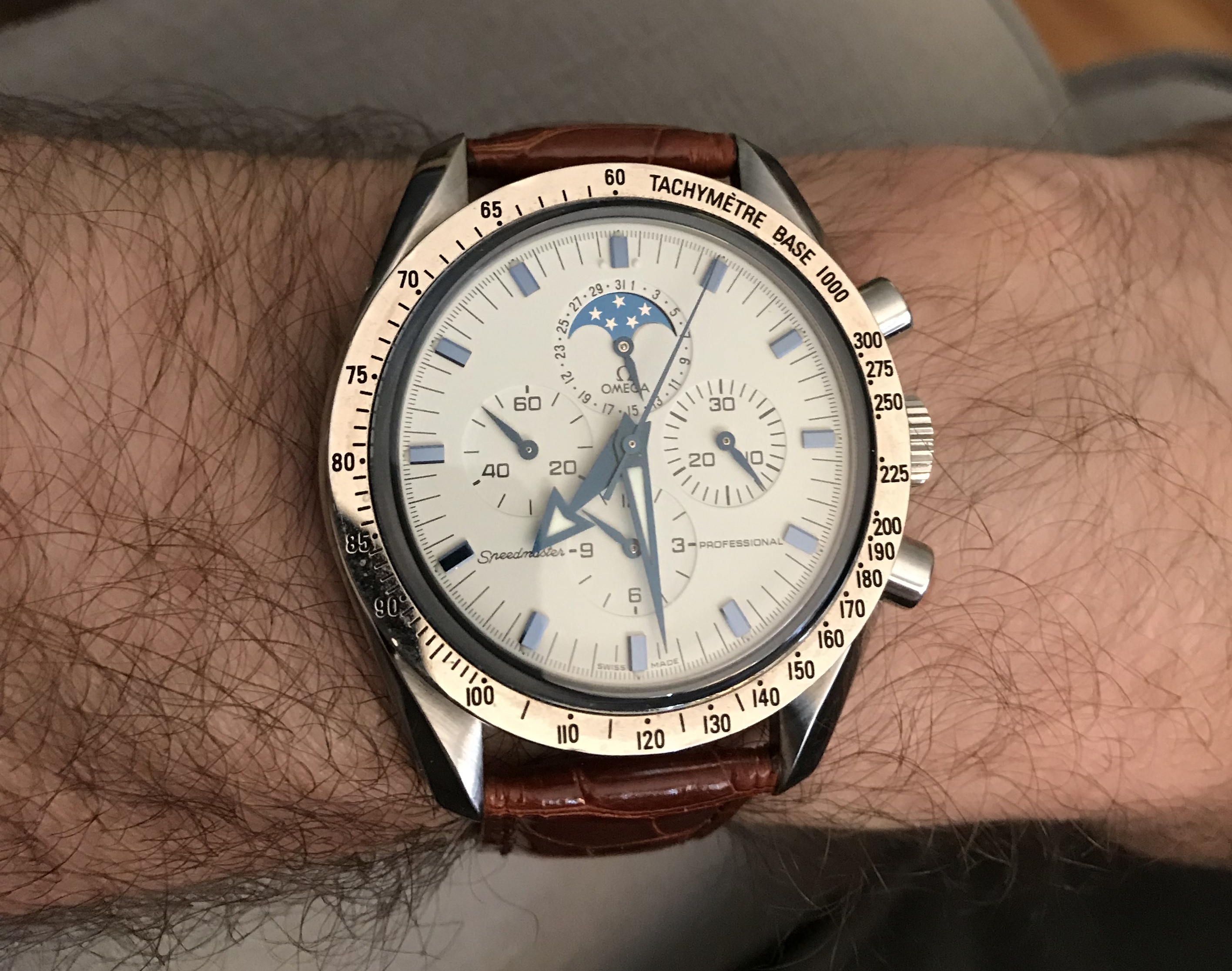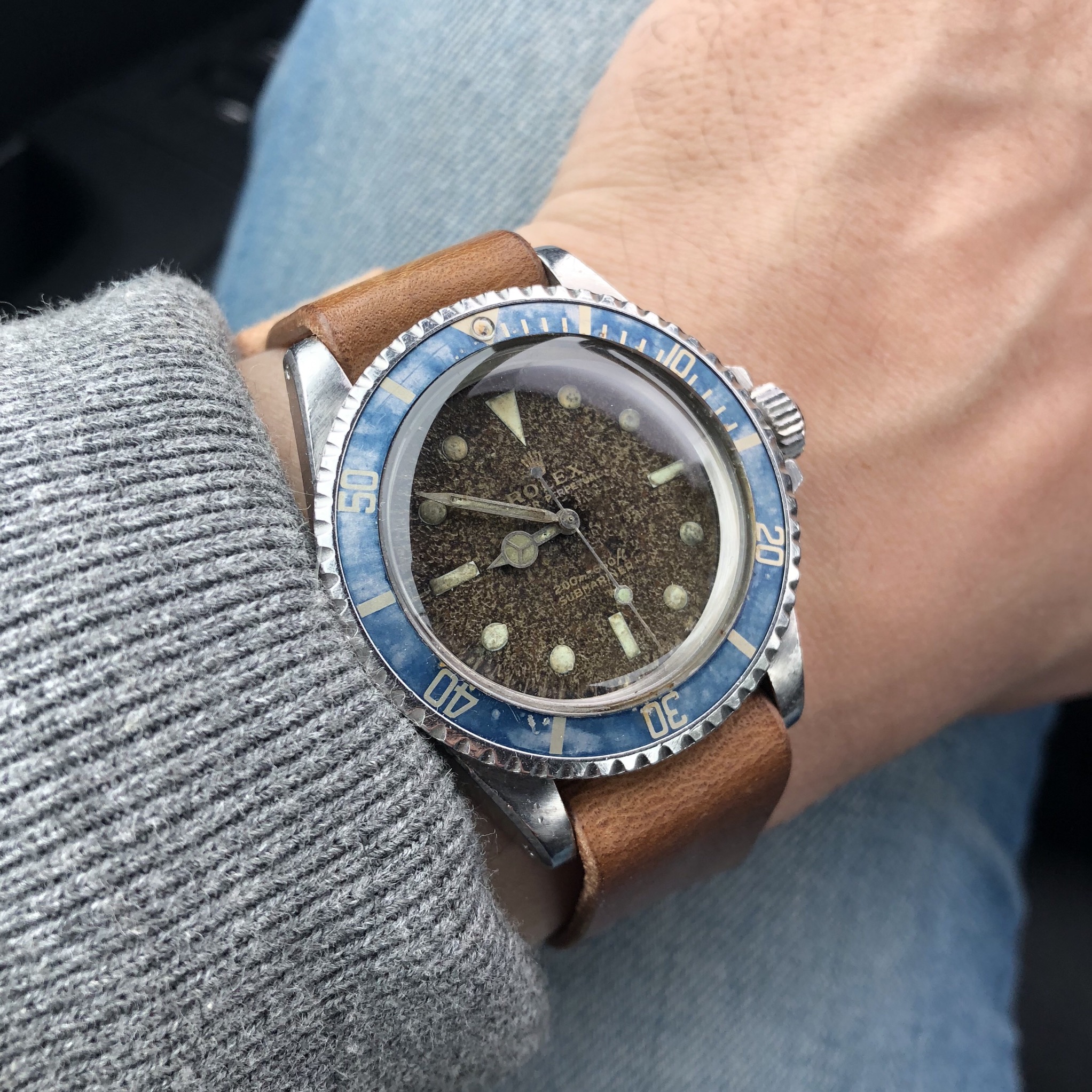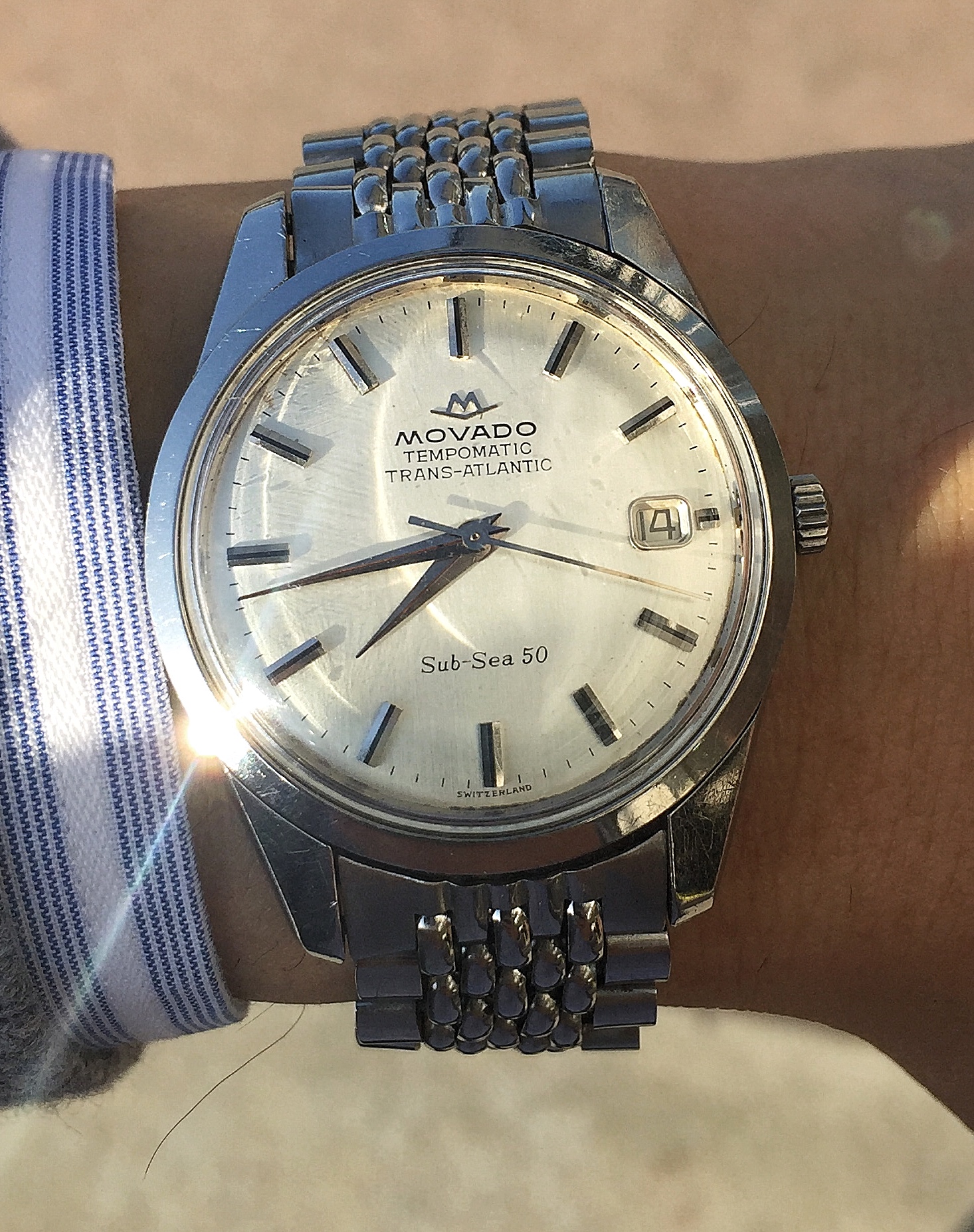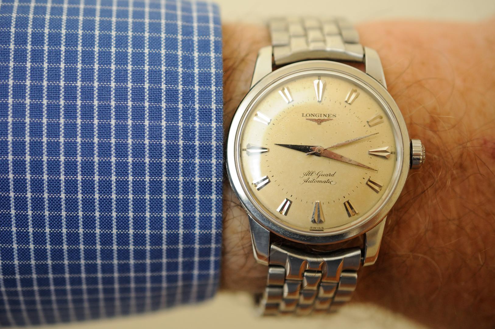 This one has been feeling neglected. Haven’t worn it for a year or so. Caliber 341, circa early 1950s. This one is a survivor. Condition when it came to me was such that many would have considered it as a donor, useful only for parts. Gold shell case on it was destroyed. Beyond doing anything with. Dial was equally bad. A quick check in my stash, and I discovered that I had a steel case, and much better dial. With a hand-made case clamp, new mainspring, recondition, replace sad hour hand, non-genuine crown, and voila. Here is the result. An excellent runner. Considering the terrible abuse it had endured, I was delighted that the movement survived in quite good condition.