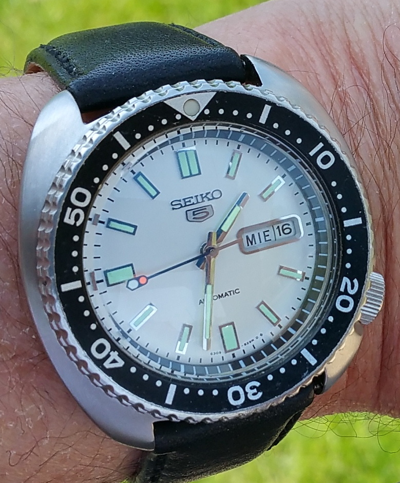 Still jerk'n around with the this 6309 after the strap change the watch looks better to my eyes. On the bracelet too much silver color. In the sunlight the lume on the indices have a nice green hue.