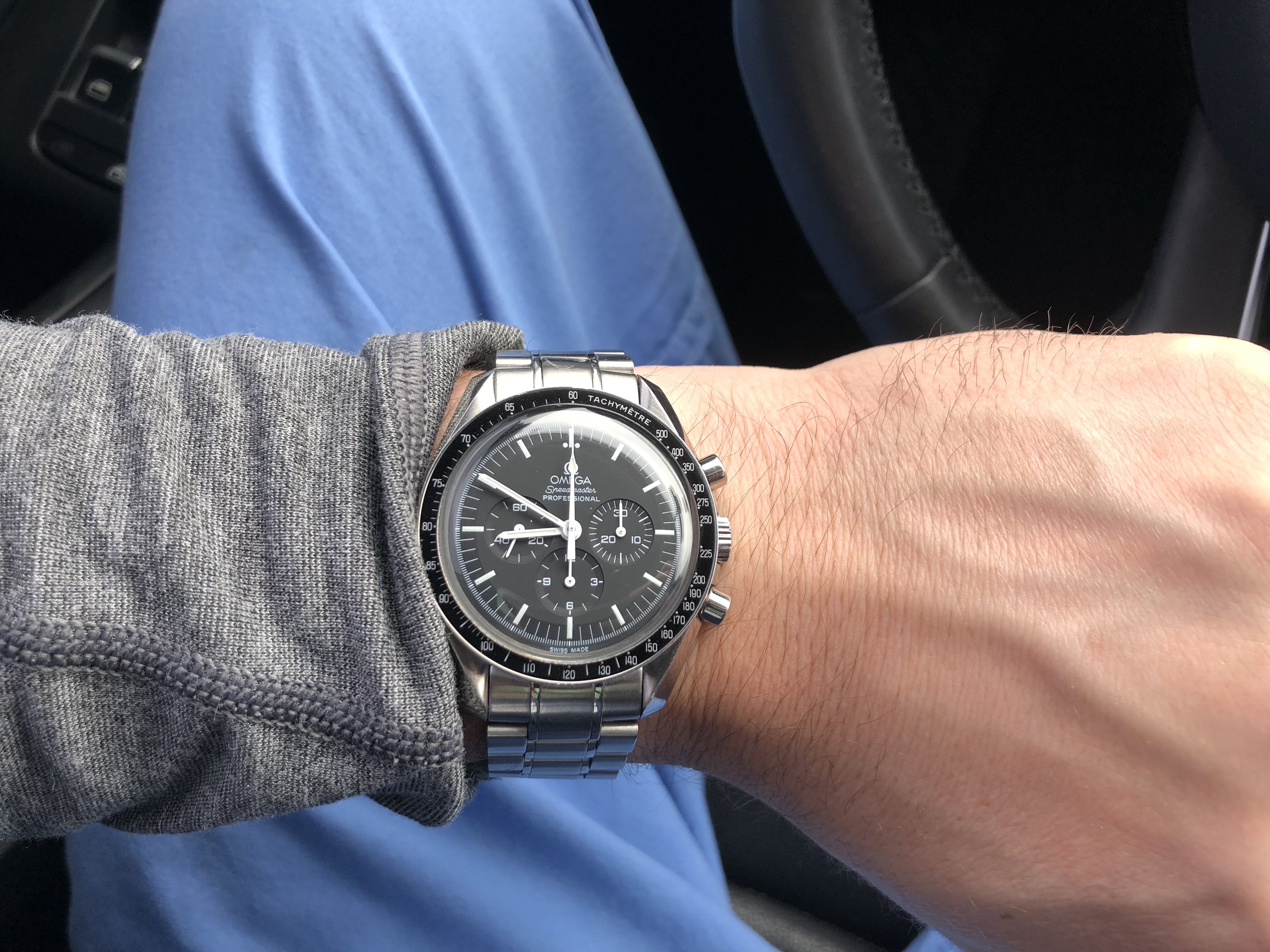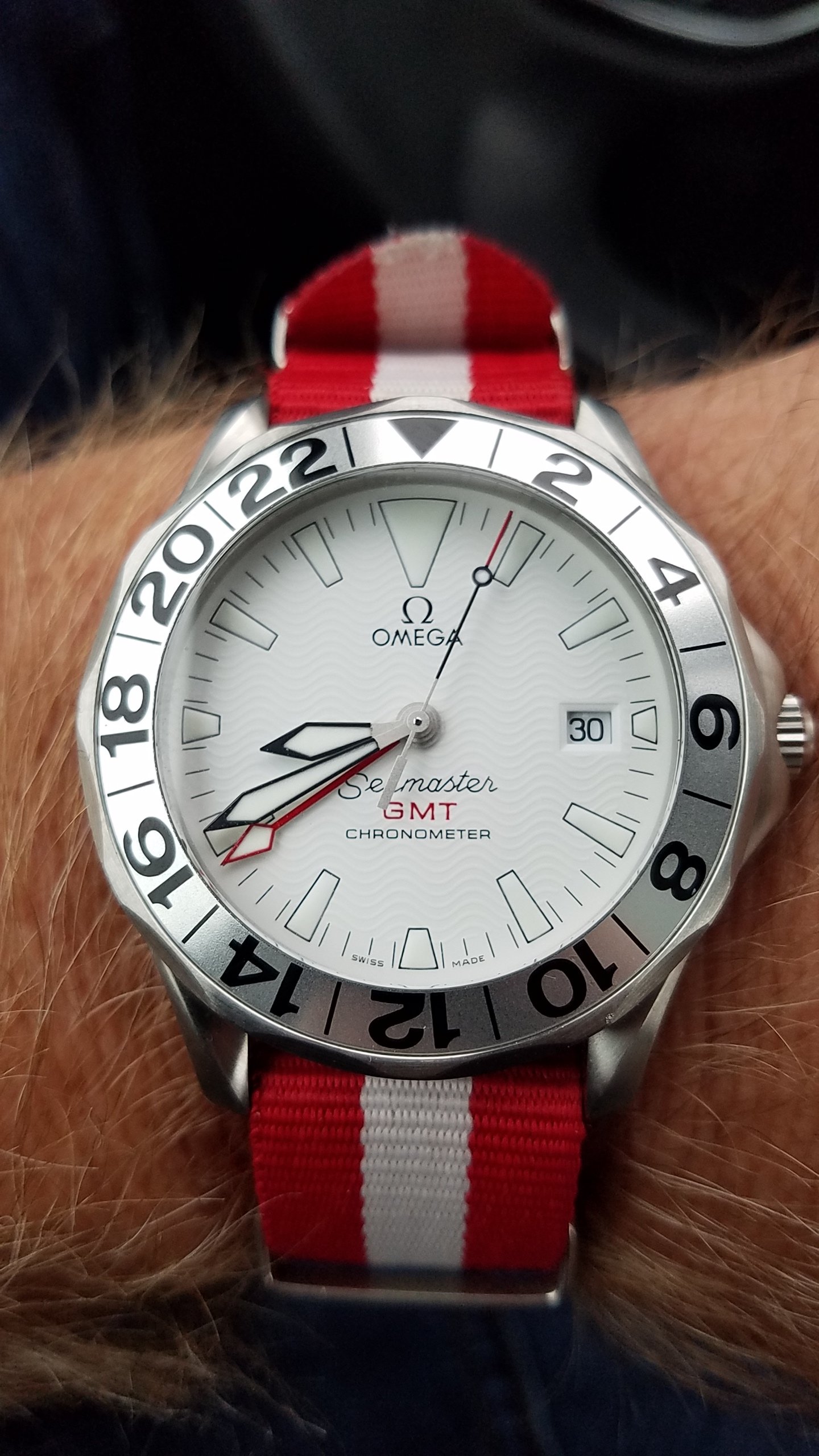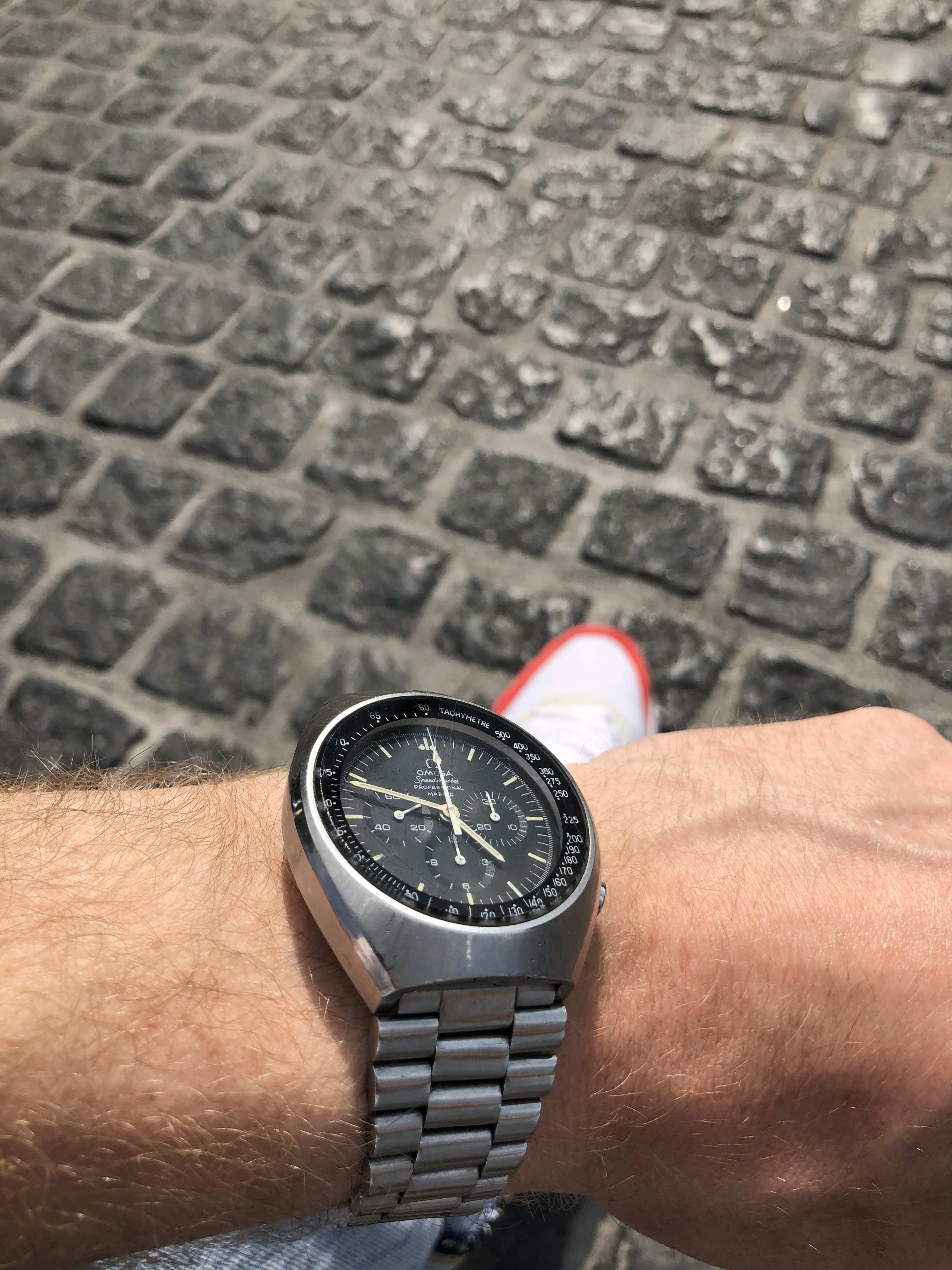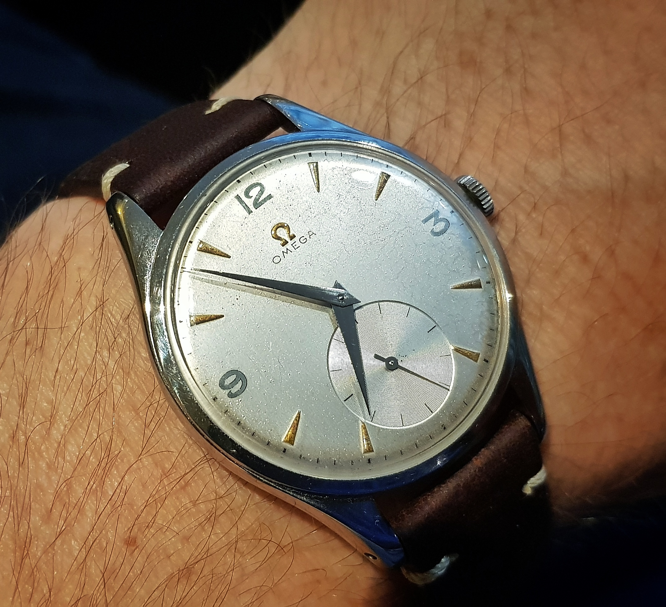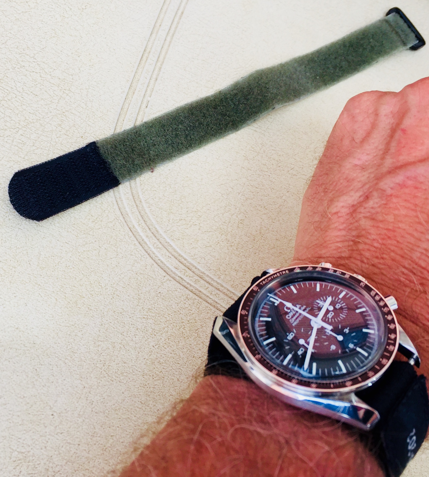 Unusually warm weather in Northern Europe today drove me into a watch shop just because of their air conditioning.....seemed right to buy a strap to my Omega. Simple clean and nice size