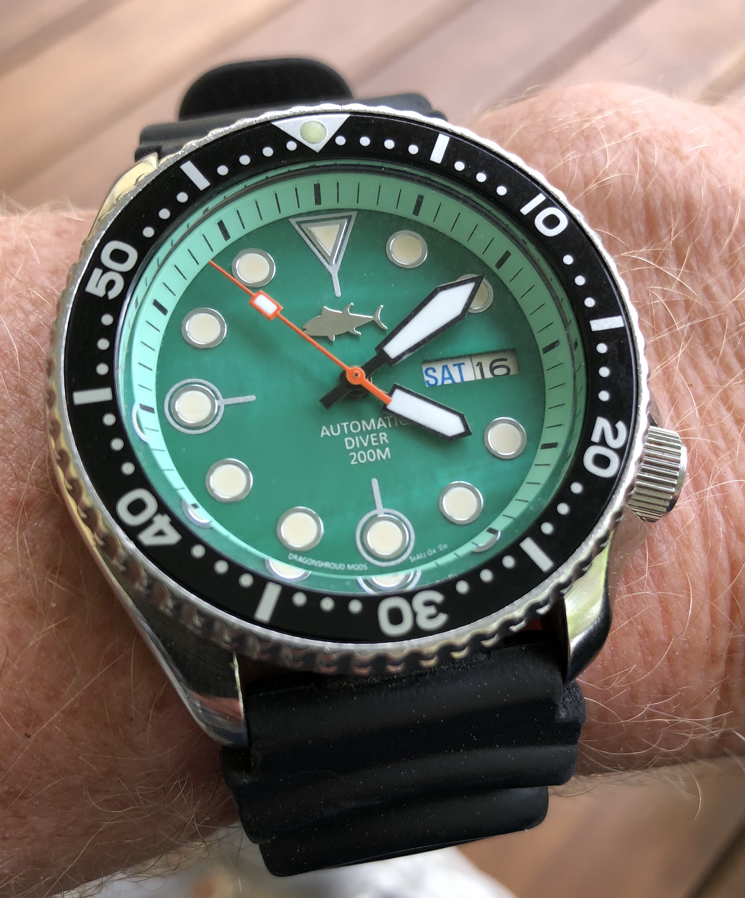 Work day today since 7 AM, opening up a summer place. Lots of "buggy lugging" of chairs, tables, outboard motors, etc. - plus flower pots for my wife. Been wearing this bulletproof Seiko supermod, tweaked up with ploprof hands and "Summer" green colors. A favorite for rough duty. Or any duty, for that matter.