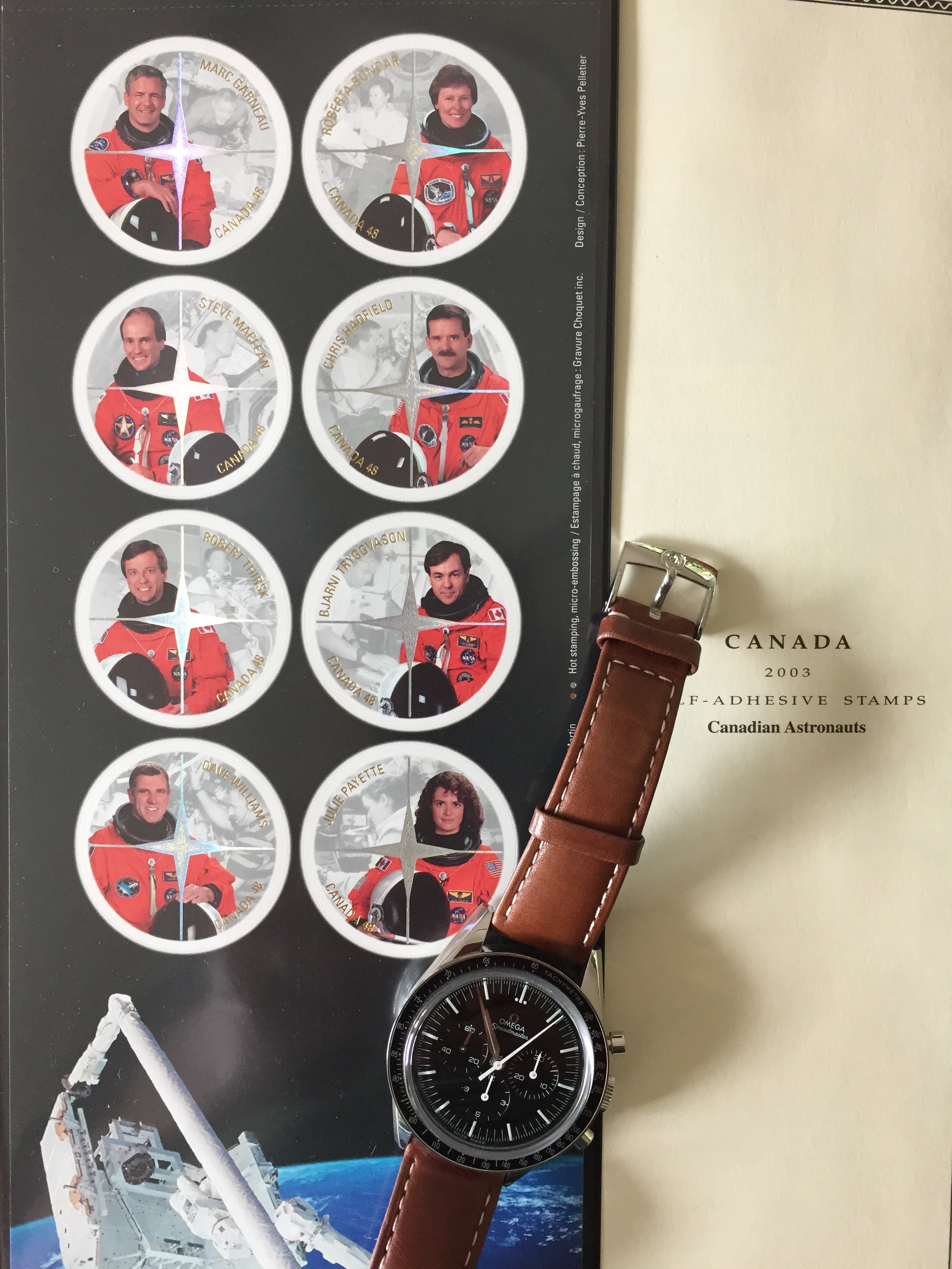 Posts 300 Likes 860 KAP ·Jul 15, 2018 I’m a stamp collector and I like watches! Here’s my omega First Omega in Space Chrono watch with 2003 Canada Post stamps of Canadian astronauts.