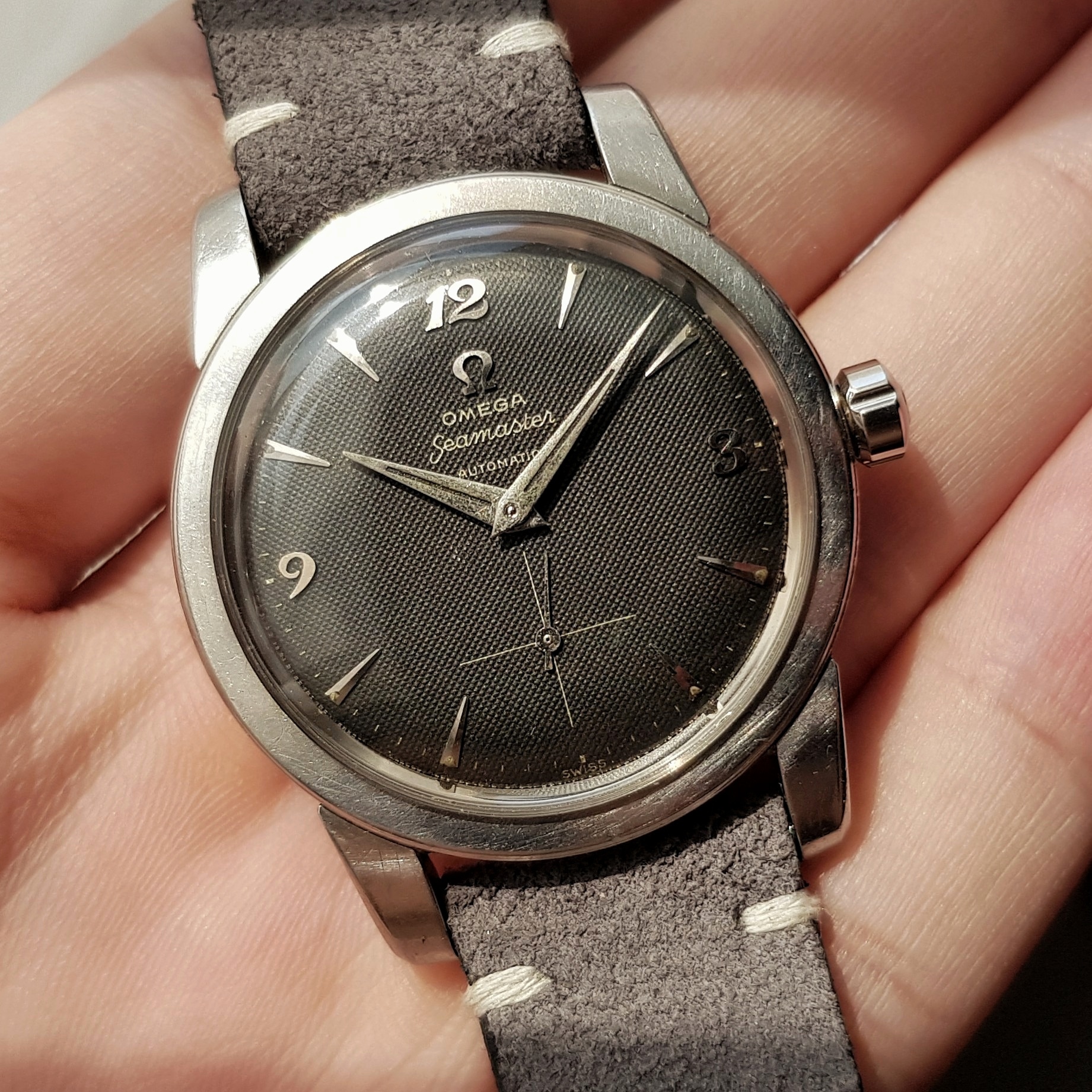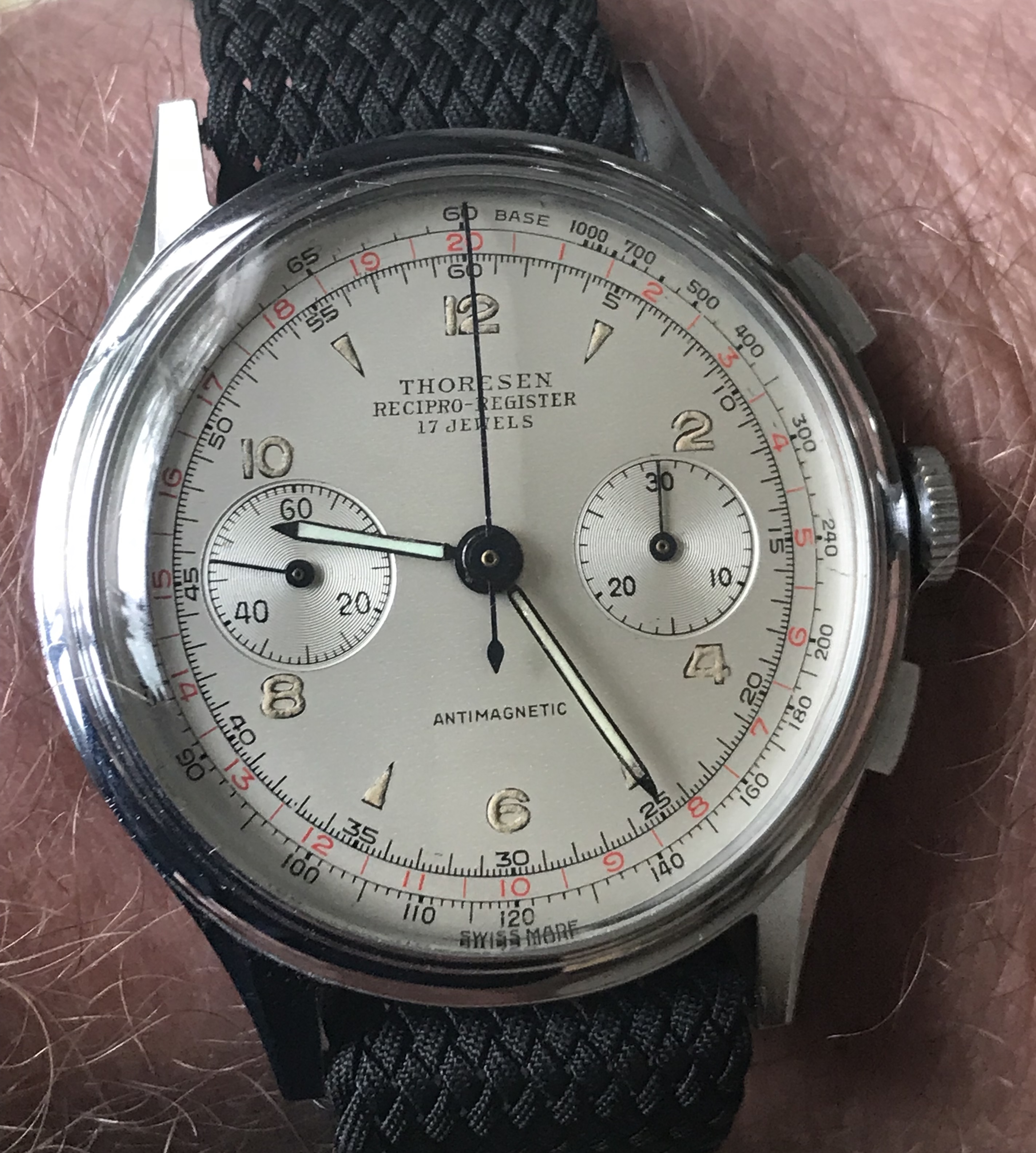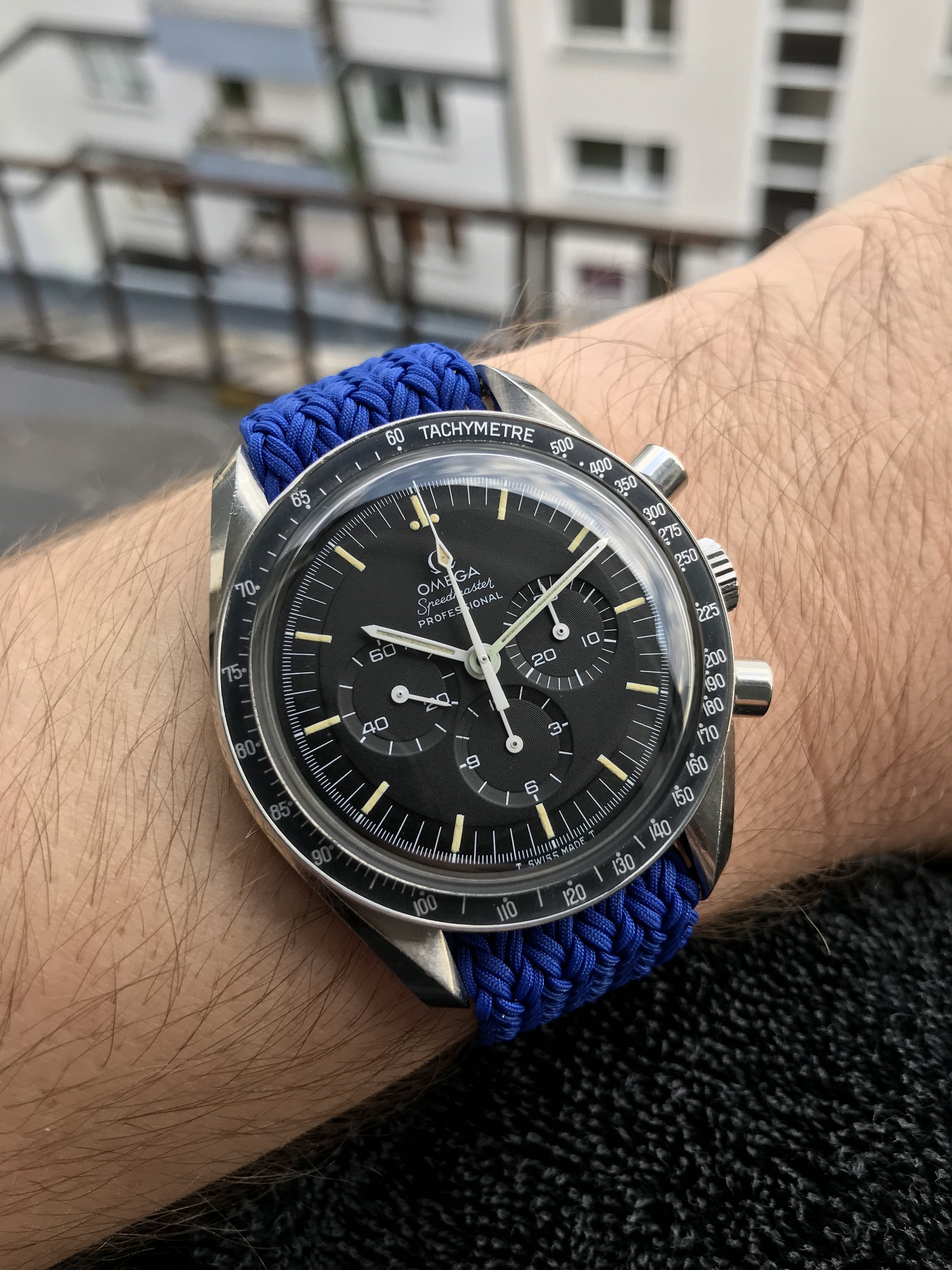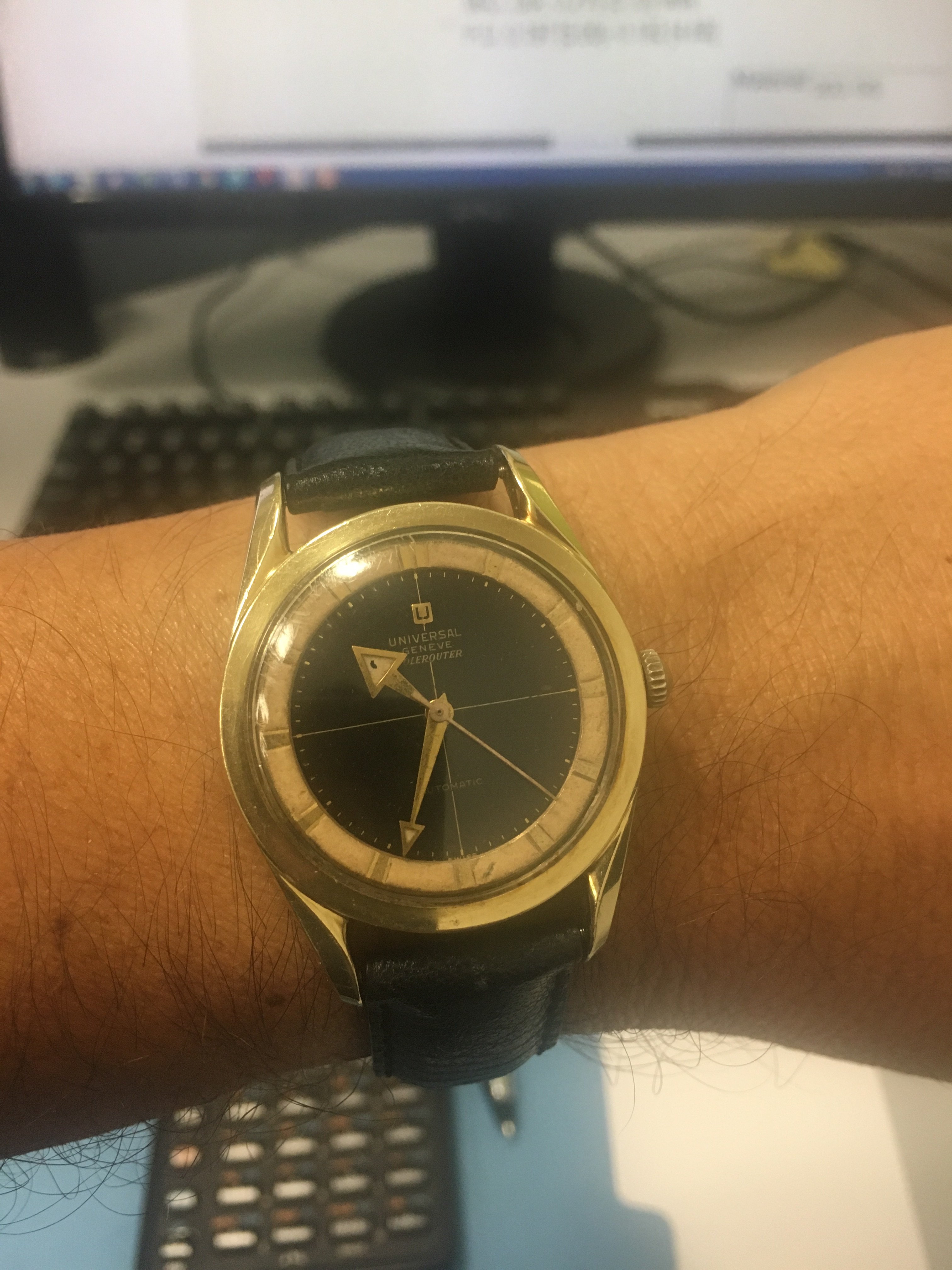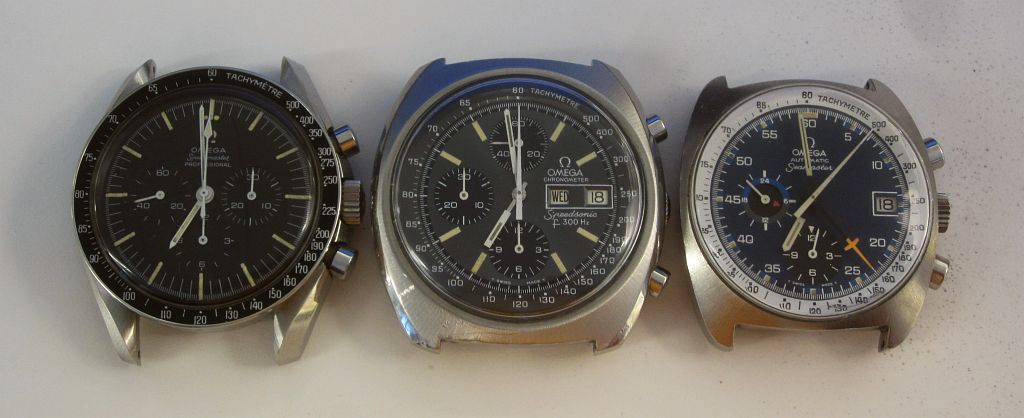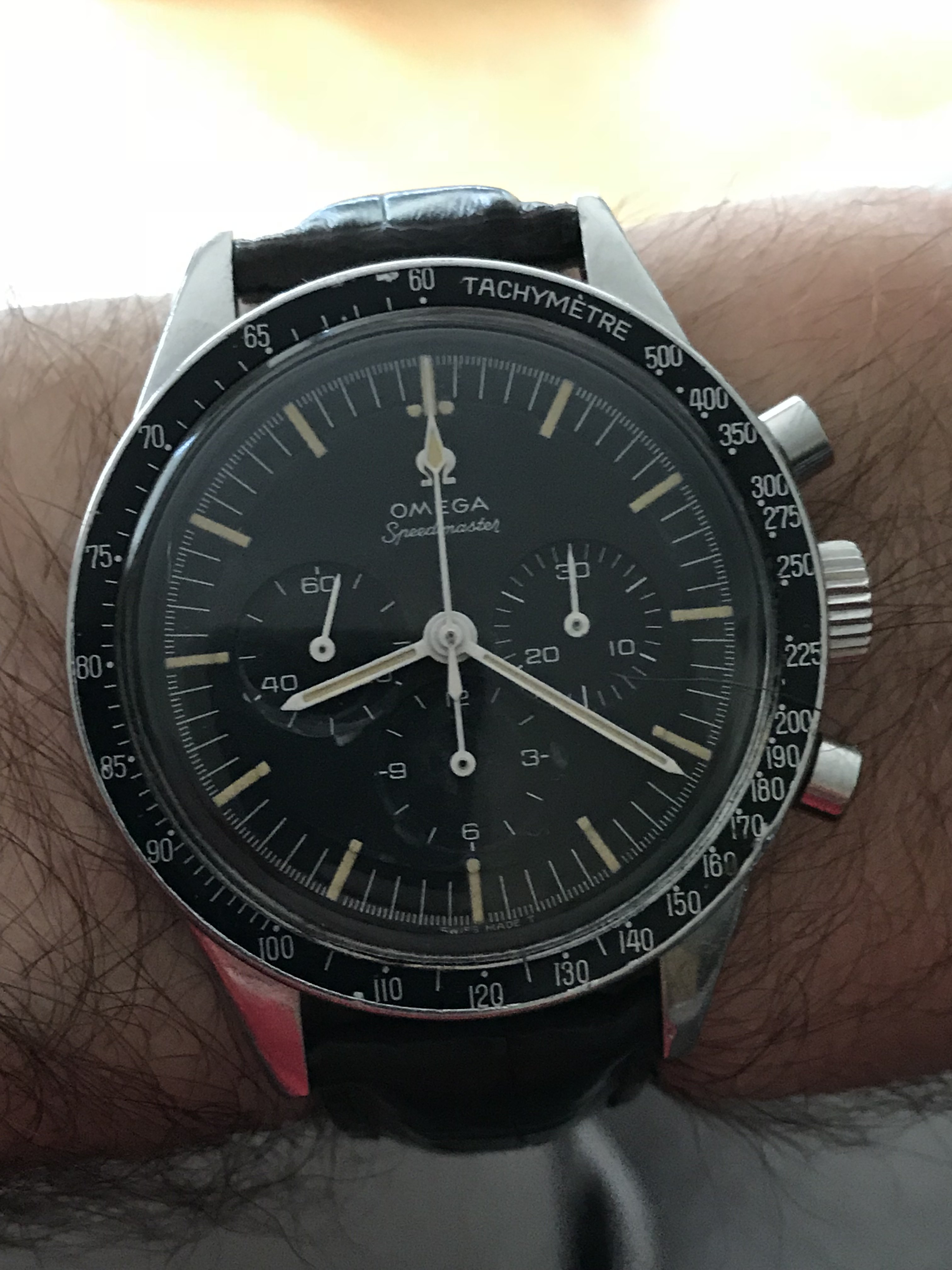 A surprisingly large and heavy watch. Sorta looks like a 176.007 C-case, but much bigger in real life. Here thrown in with a Moonwatch for reference (42, 43, and 38.5mm case widths):