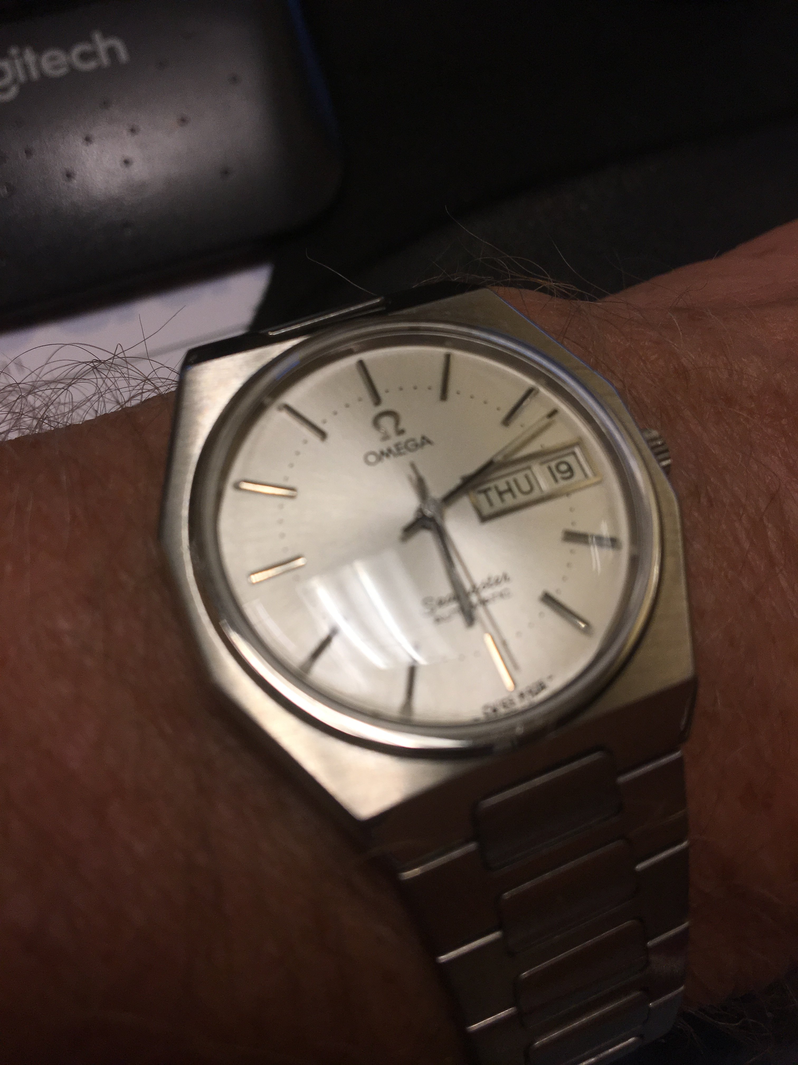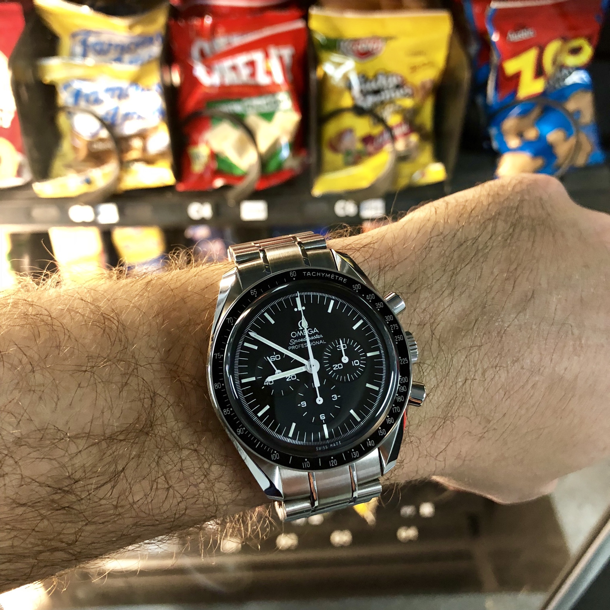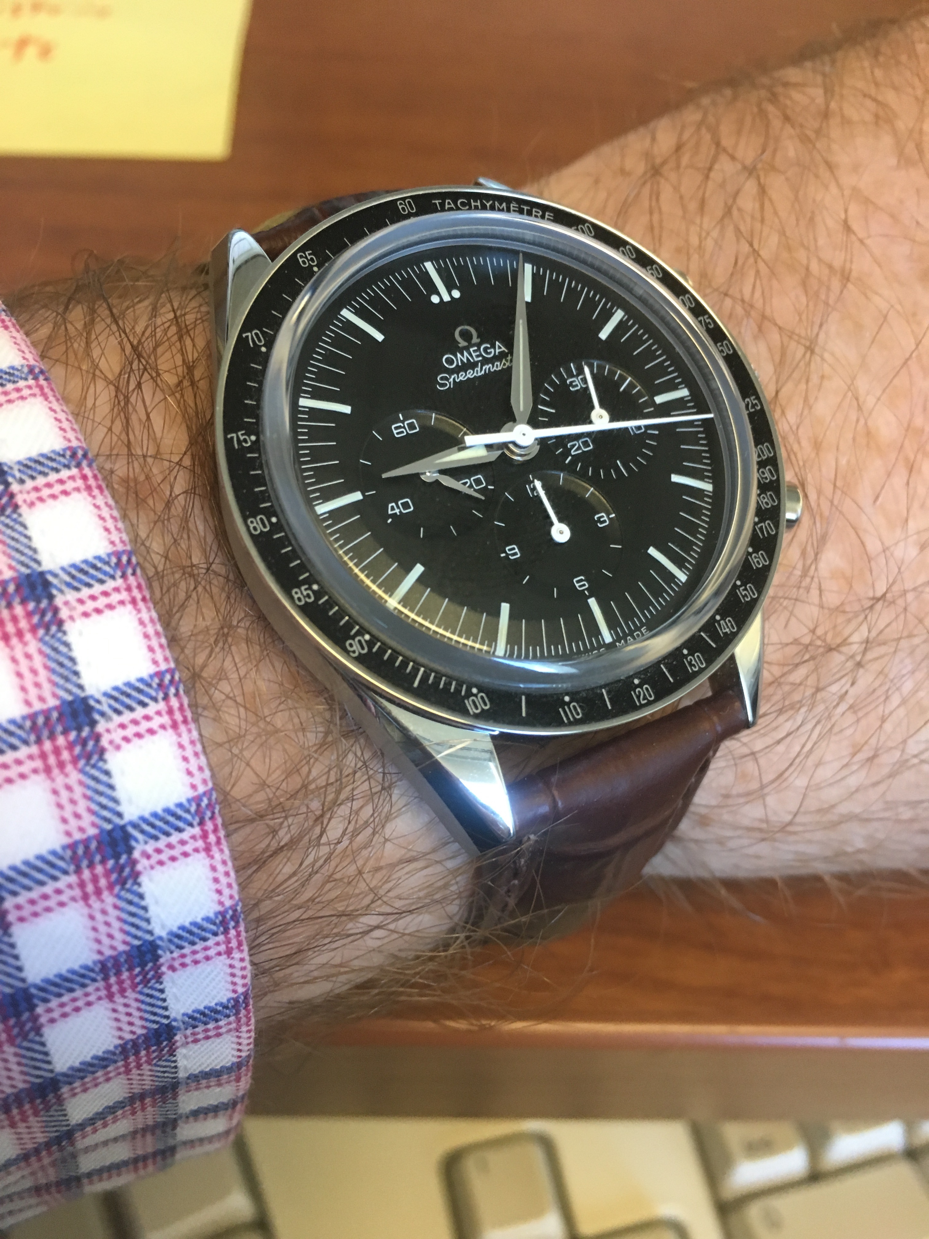A surprisingly large and heavy watch. Sorta looks like a 176.007 C-case, but much bigger in real life. Here thrown in with a Moonwatch for reference (42, 43, and 38.5mm case widths):