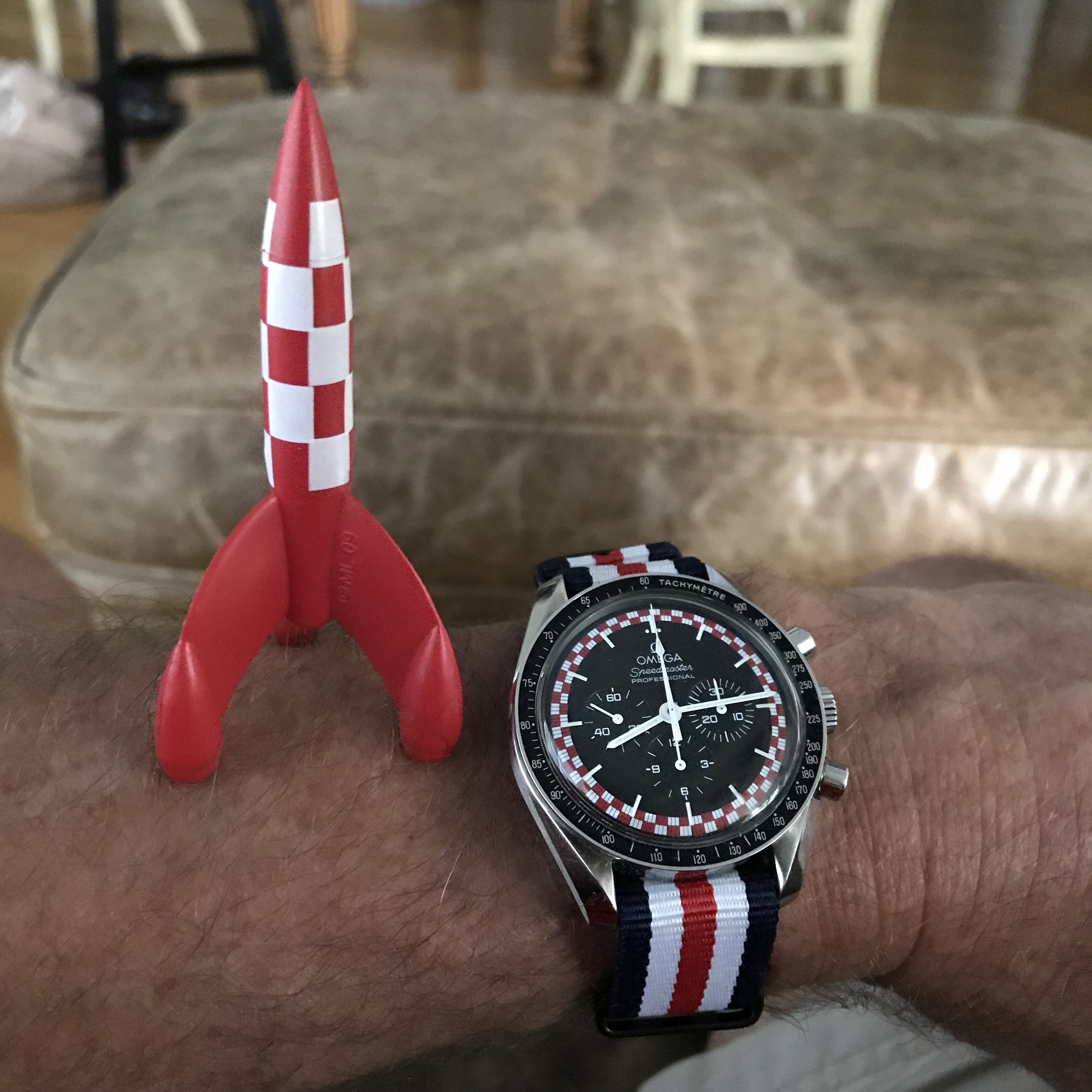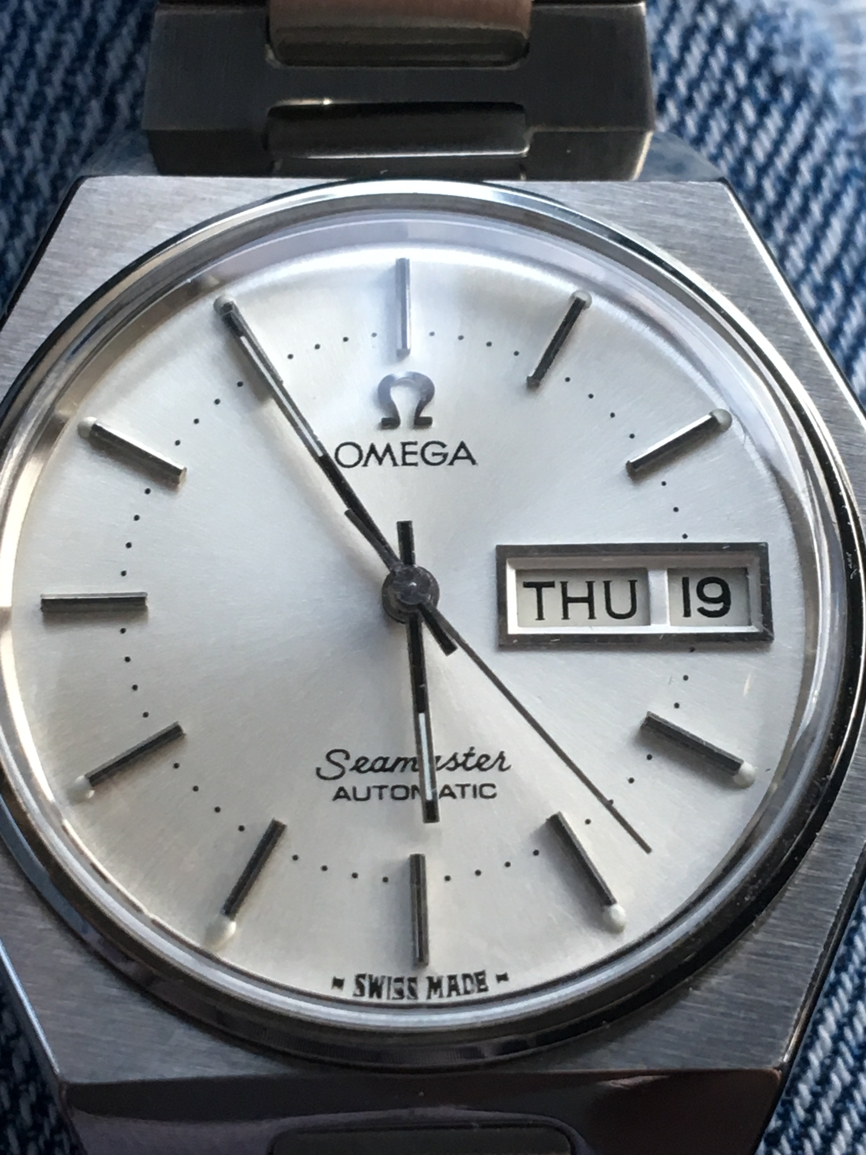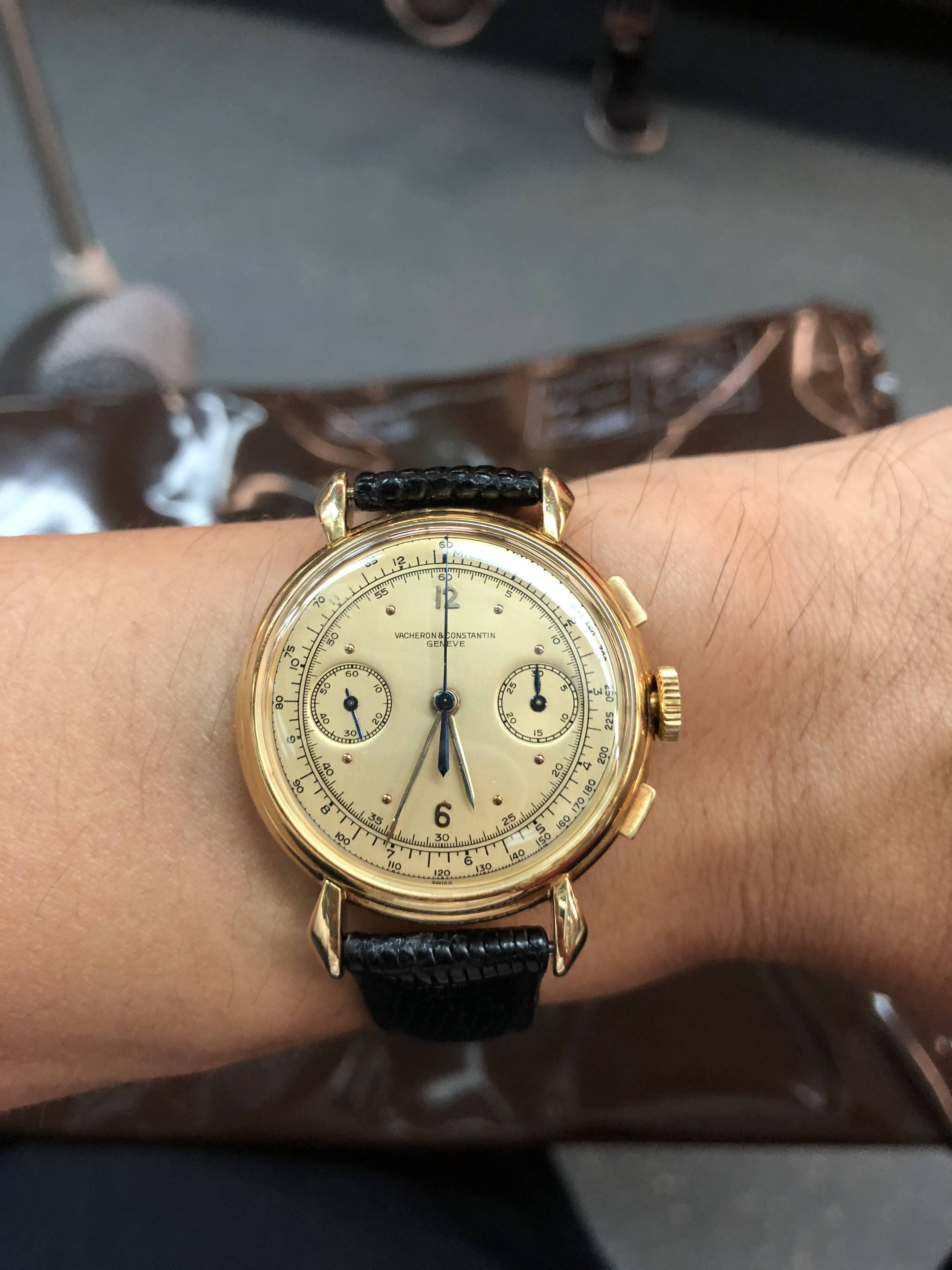 A surprisingly large and heavy watch. Sorta looks like a 176.007 C-case, but much bigger in real life. Here thrown in with a Moonwatch for reference (42, 43, and 38.5mm case widths):