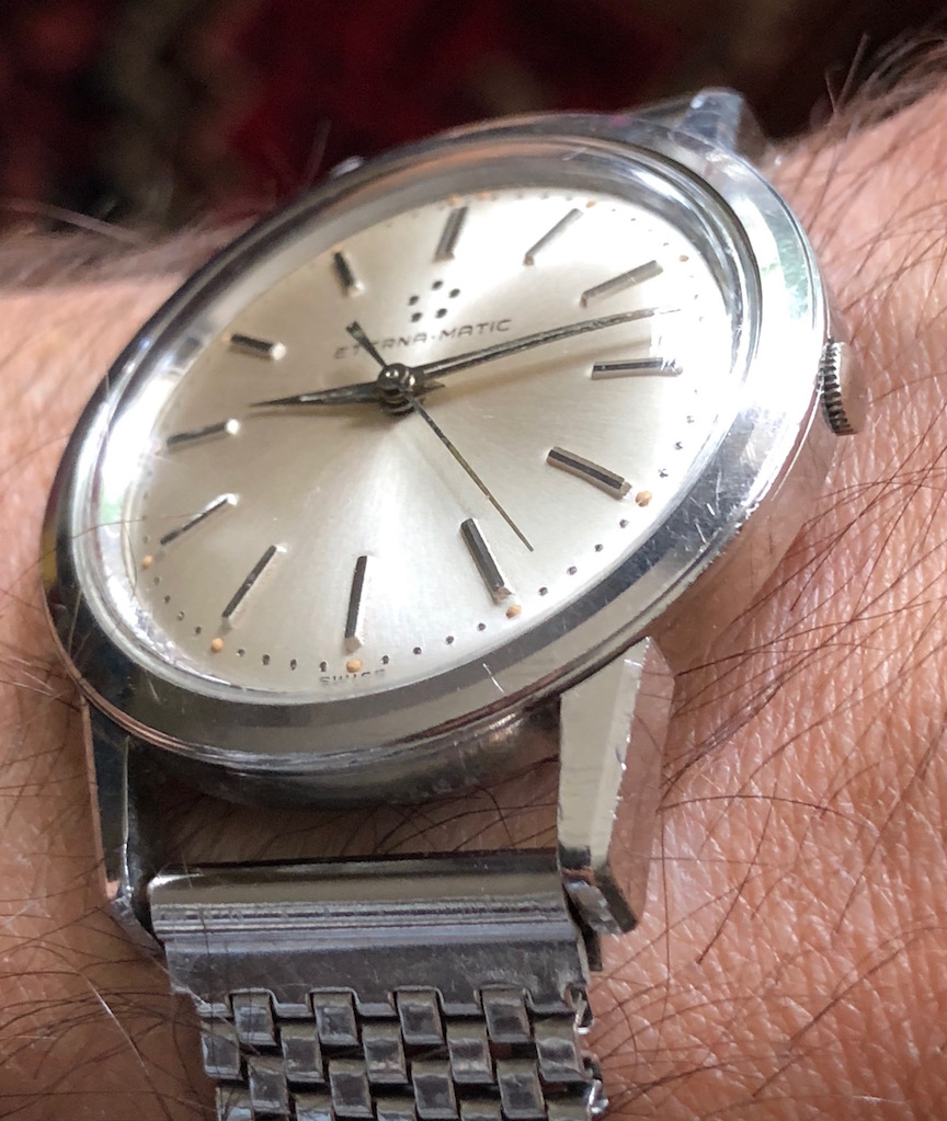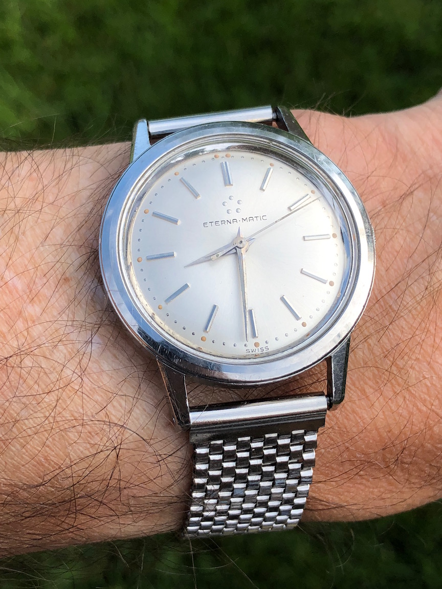 Well-cared-for 1961 Eterna-matic in a 35mm SS case. These were better-than-average Swiss watches in their day, and a good entry-level vintage value in my opinion. High-quality, well-finished, with excellent in-house movements and a classic vintage style.