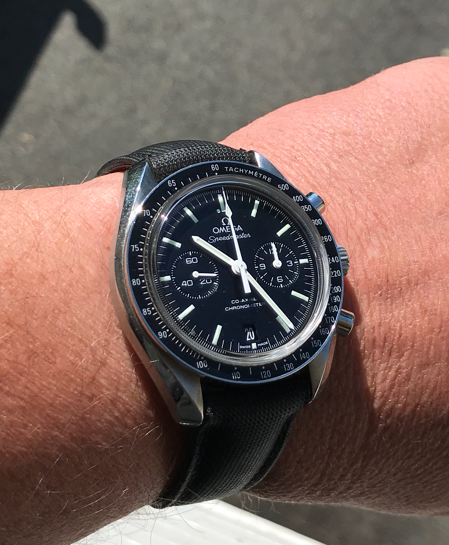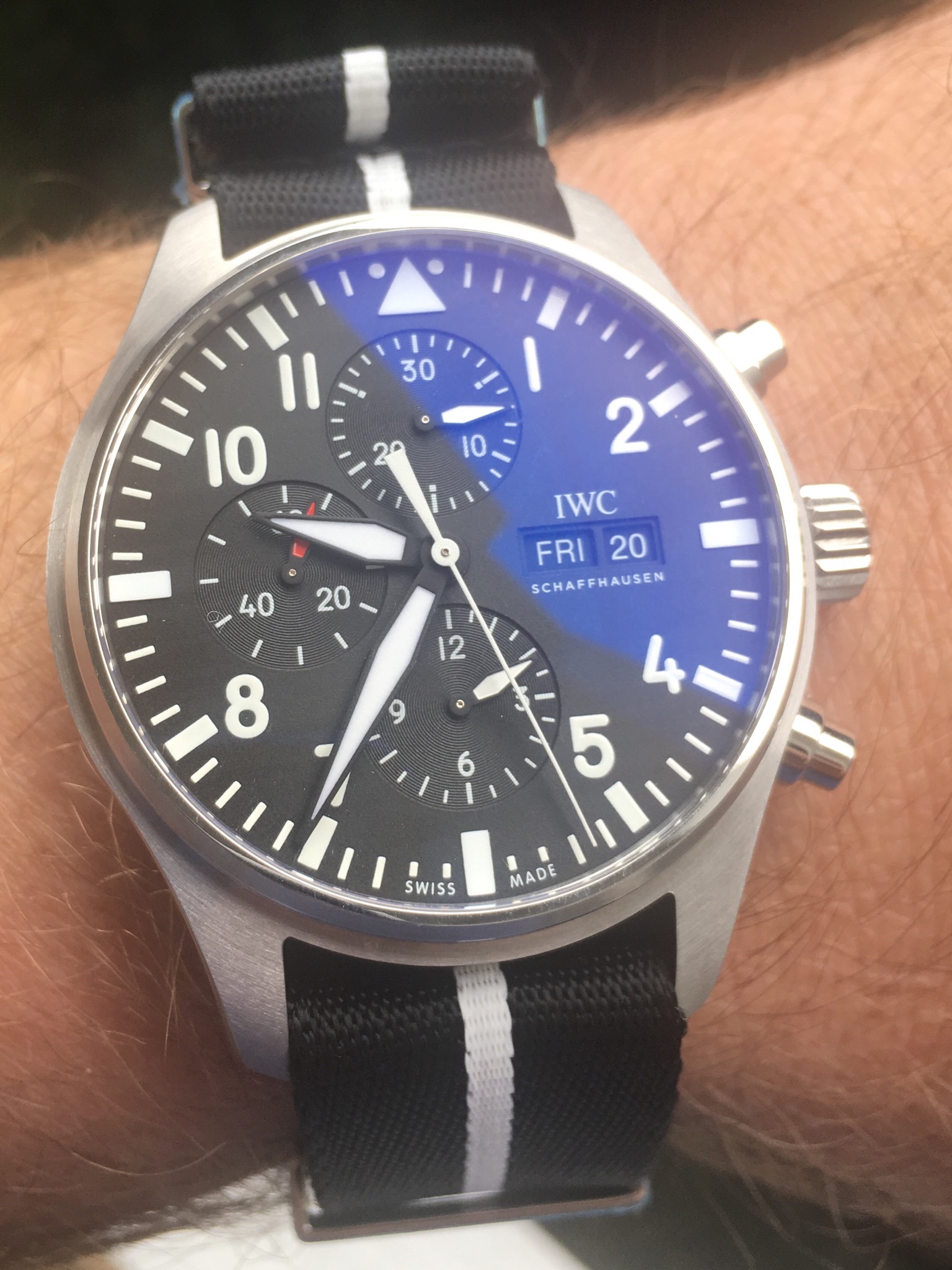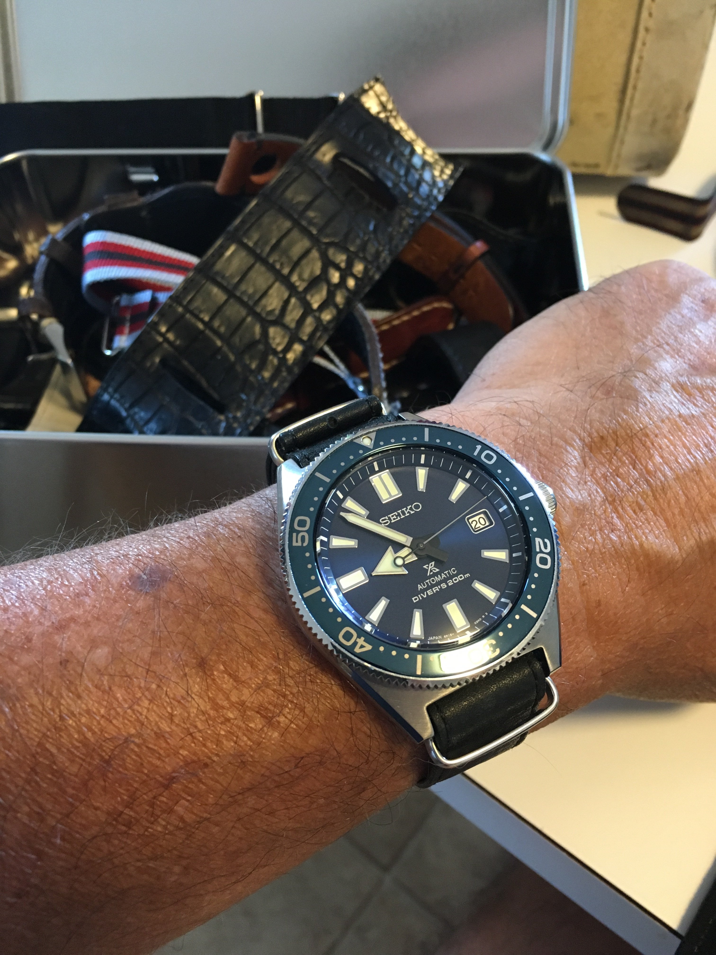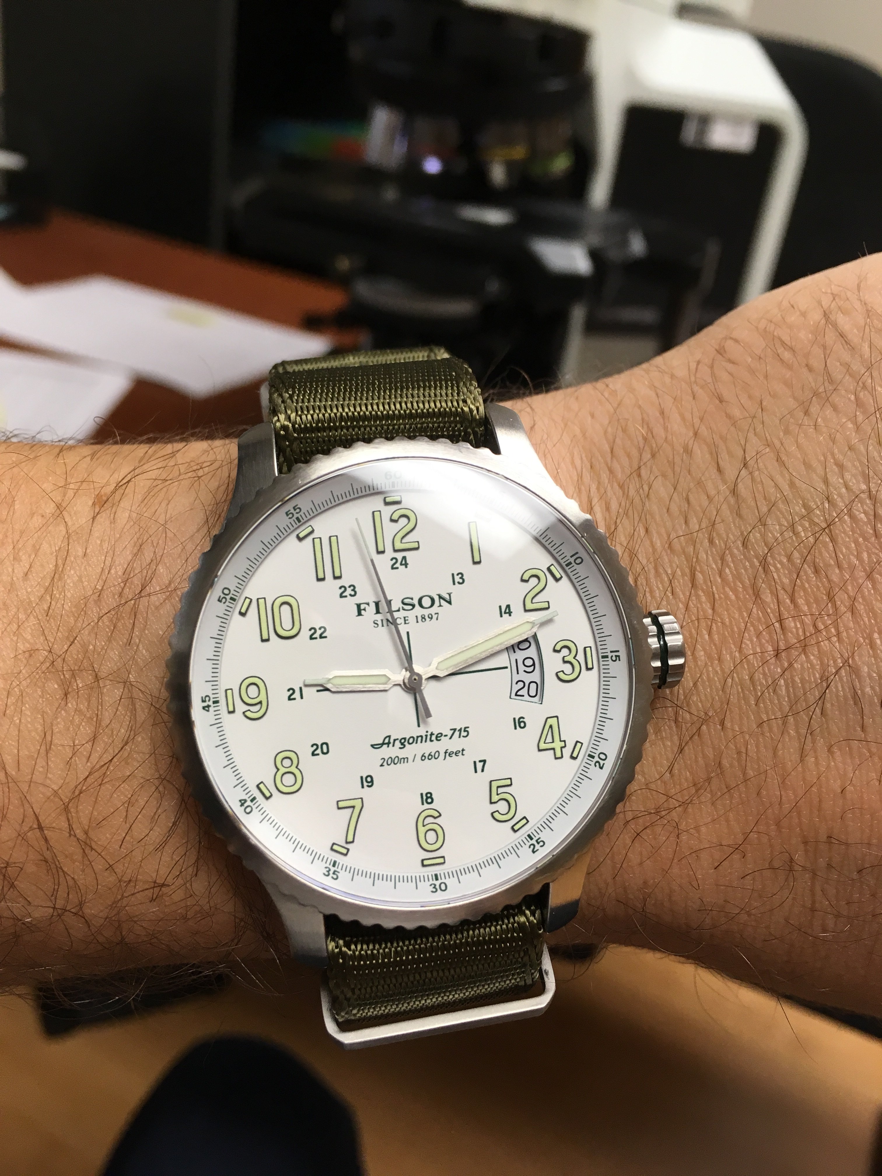 Shinola watch in Filson branded case; there are better watches for the price Shinola retails for but on sale they’re quite cheap...and they’re essentially always on sale, ubiquitous on retail clearance racks...“made” (assembled) in US; a bit large—44 wide and 14 thick.