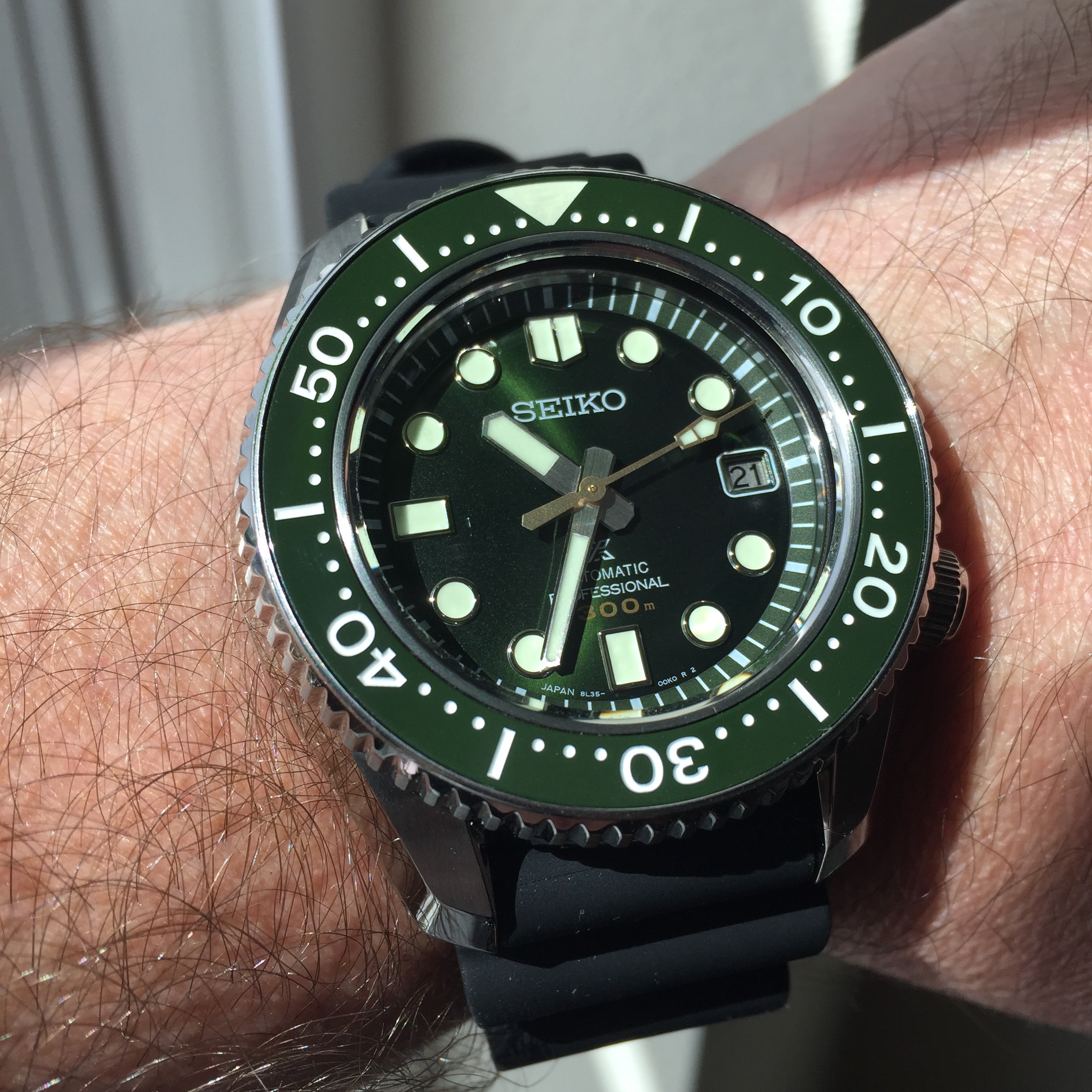 Seiko Prospex / Marinemaster 300 - SLA019 "Yakushima" LE of 1968. I love the forest green and all of the varying ways it looks in different light; sometimes matte, sometimes bright and a bit blingy, but always with the bezel and dial in complementary fashion. Seiko did a great job with this piece!