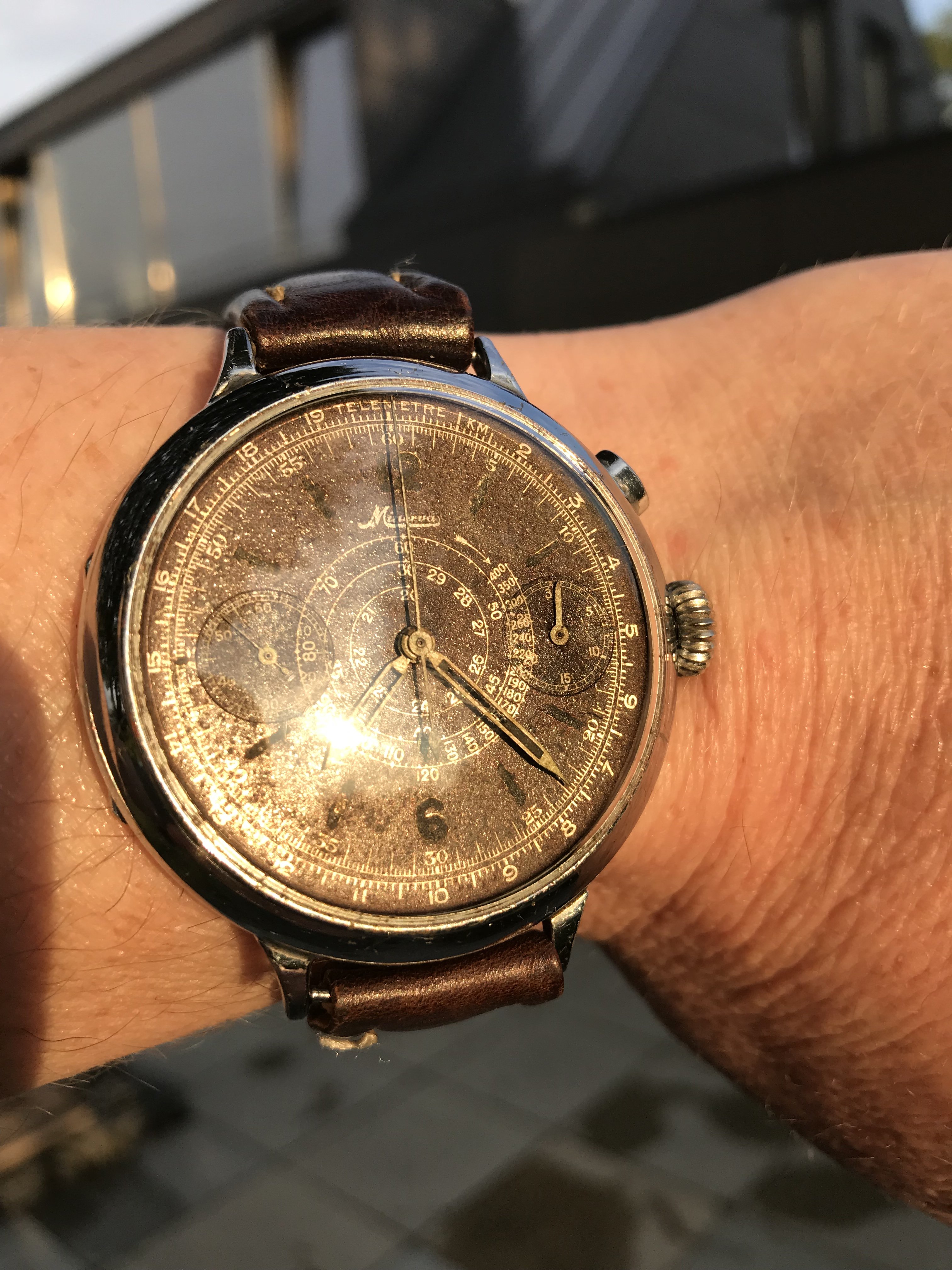 Posts 1,441 Likes 11,971 chronoboy64 ·Jul 25, 2018 With Minerva Flieger Chrono from ca. 1935 in the evening sun