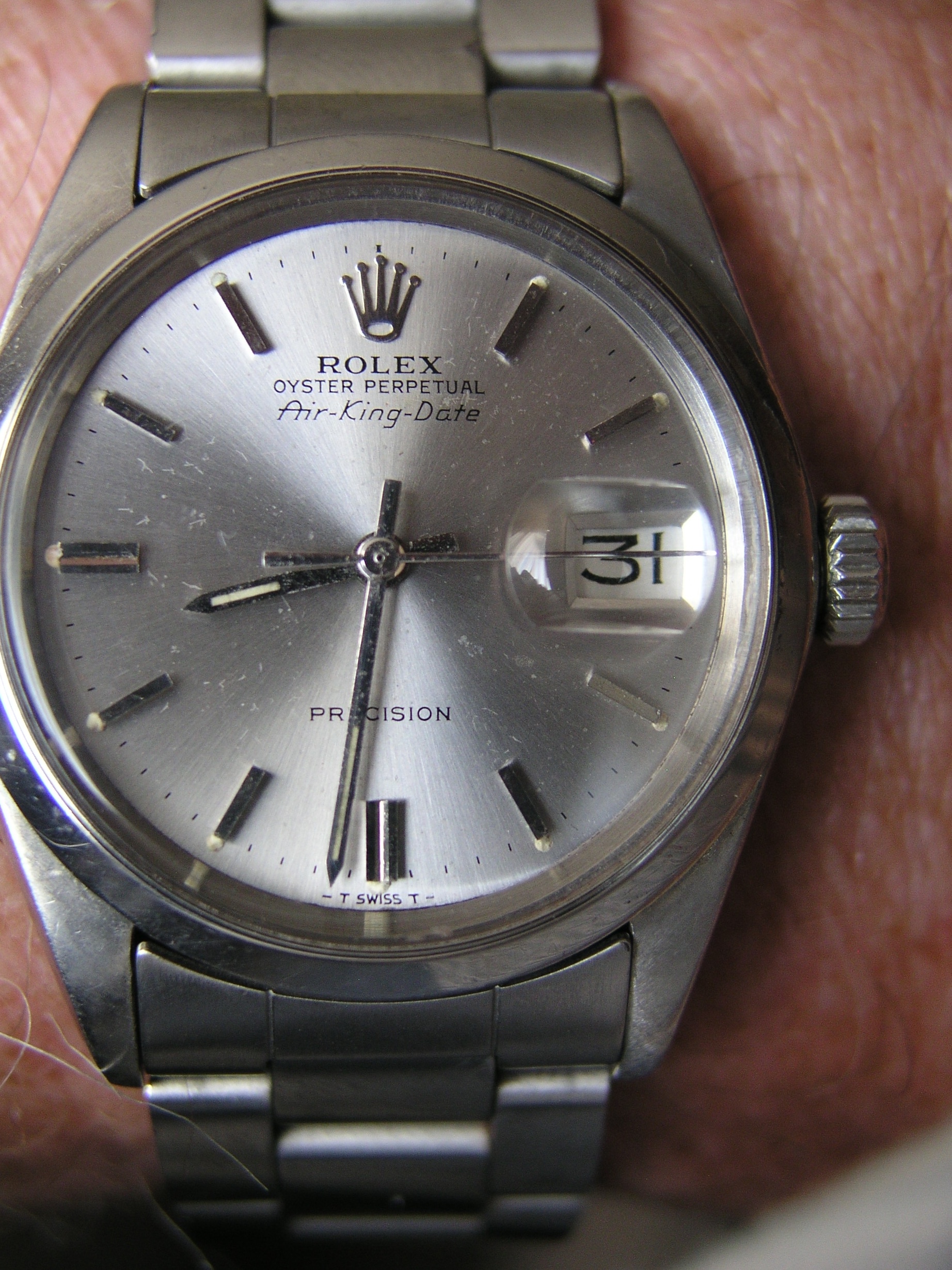 My 48 year old Rolex Oyster Perpetual Air-King date is chosen for the next few days. Off to the mountains again for a few days R & R with a few friends. This is not a “beater”, but I need a watch that has proven it can stand up to active wear, and one that already has a few battle scars. And, no! That is not lint you are seeing. The finish on the 48 year old dial is beginning to check a bit. After market Oyster bracelet. I won this watch in a sales contest in 1970. The retail price on the hang tag that came with it was $215.00. Read it and weep!