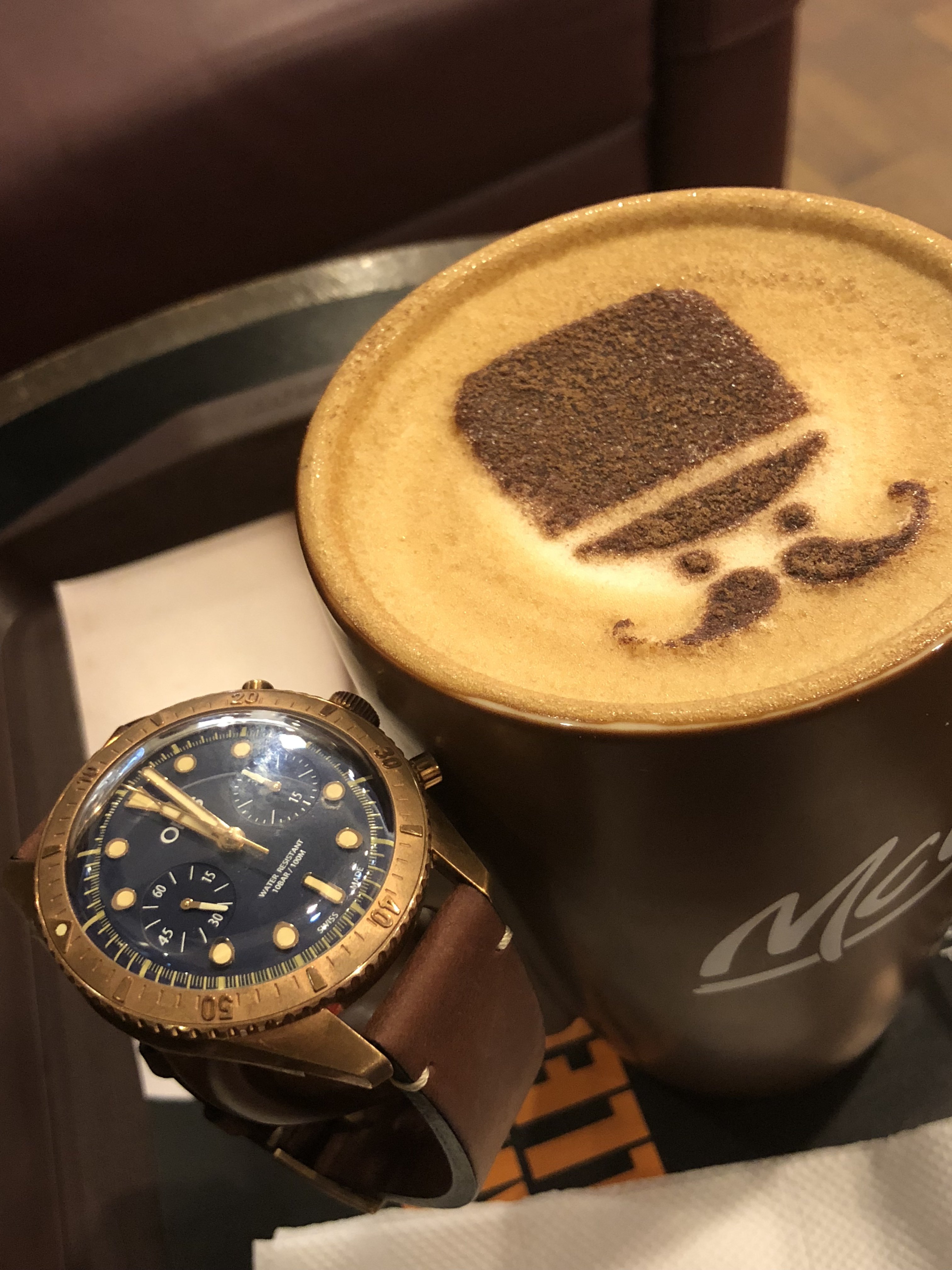 Posts 78 Likes 584 zimmerit5 ·Aug 14, 2018 Having my first cappuccino of the day with my bronze Oris chrono.