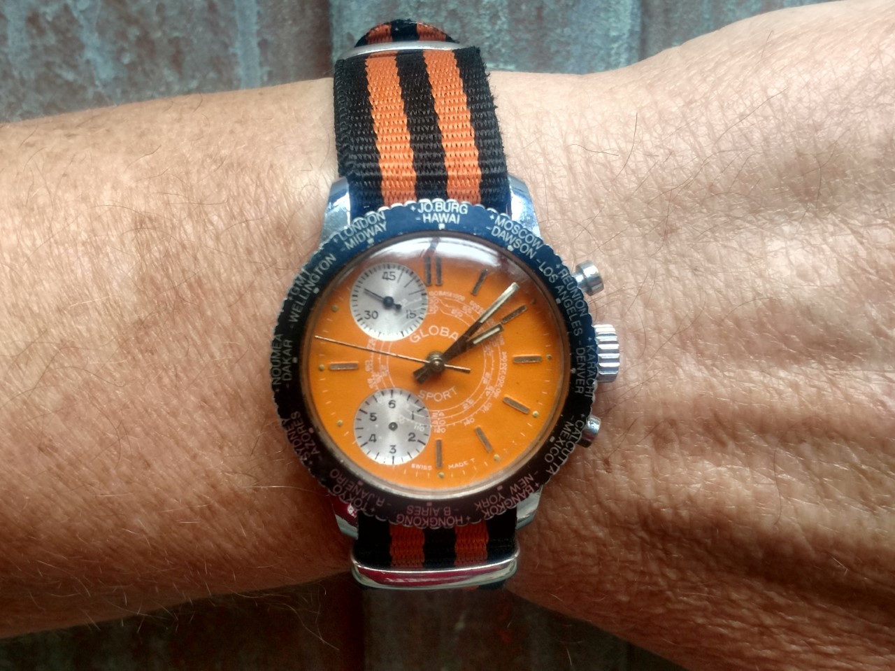 A work in progress....a 17 jewels Globa Sport World Time that was missing its bezel, but I loved its case back, so I bought it. I recently found a roached Globa Sport for parts, and swapped out the bezel. Off to Mac on Thursday to install the missing hand on the lower subdial, and a good cleaning.