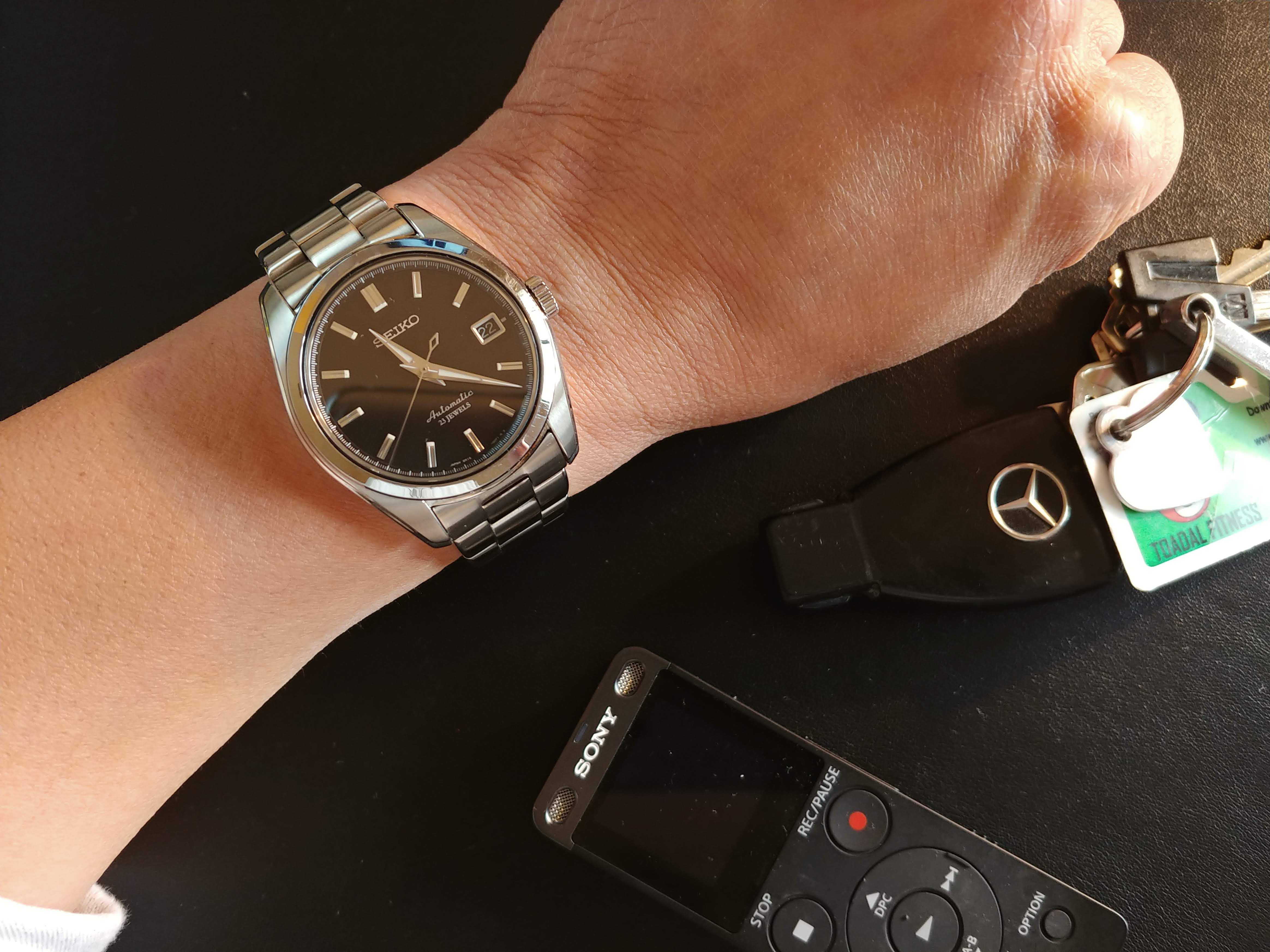Switched it up after wearing my Connie-C for about a week. Here's my little Seiko, the pedestrian SARB. It's kind of funny how this watch, which counts as small these days, feels like a dinner plate after wearing a vintage watch for a while.