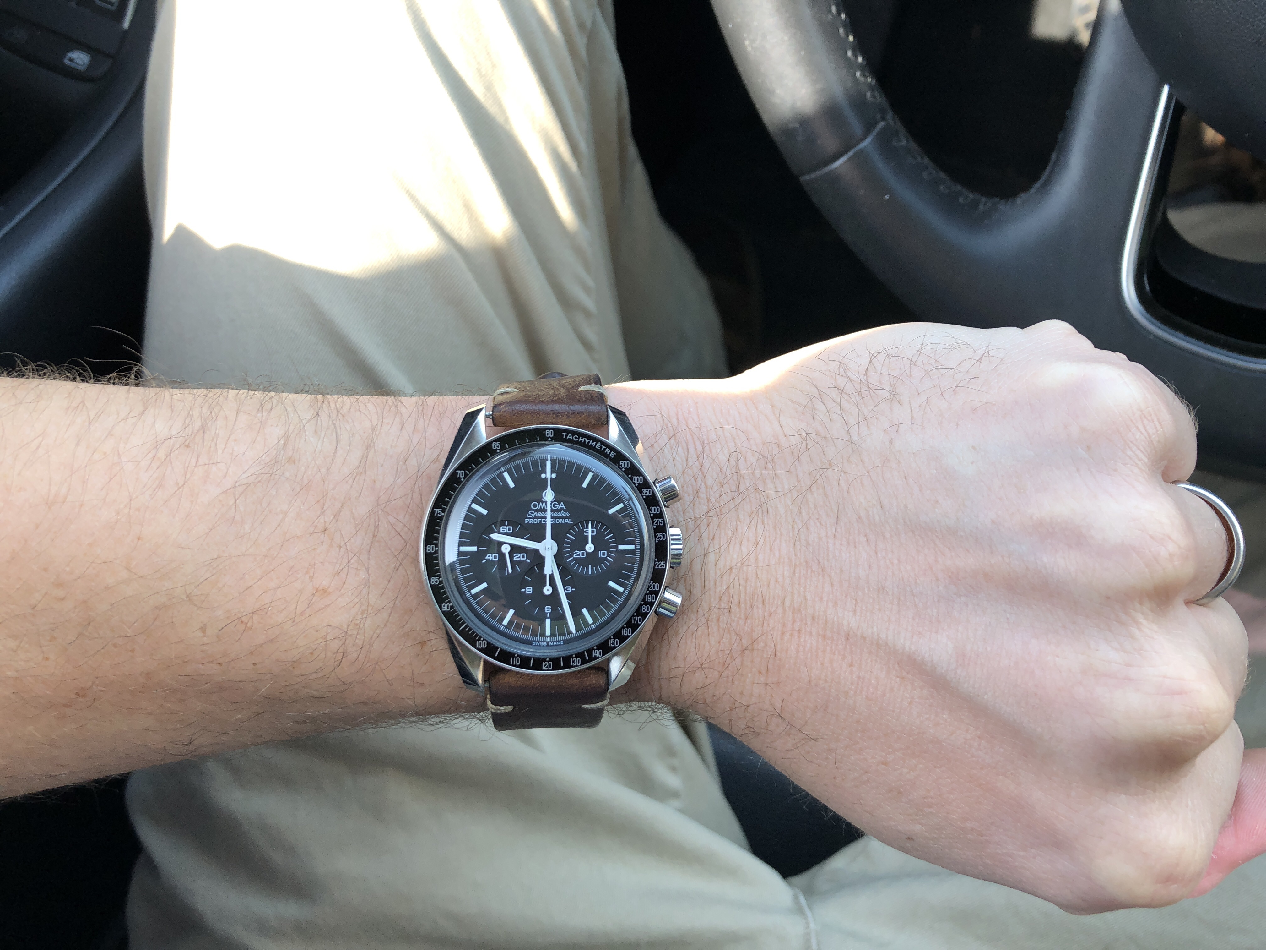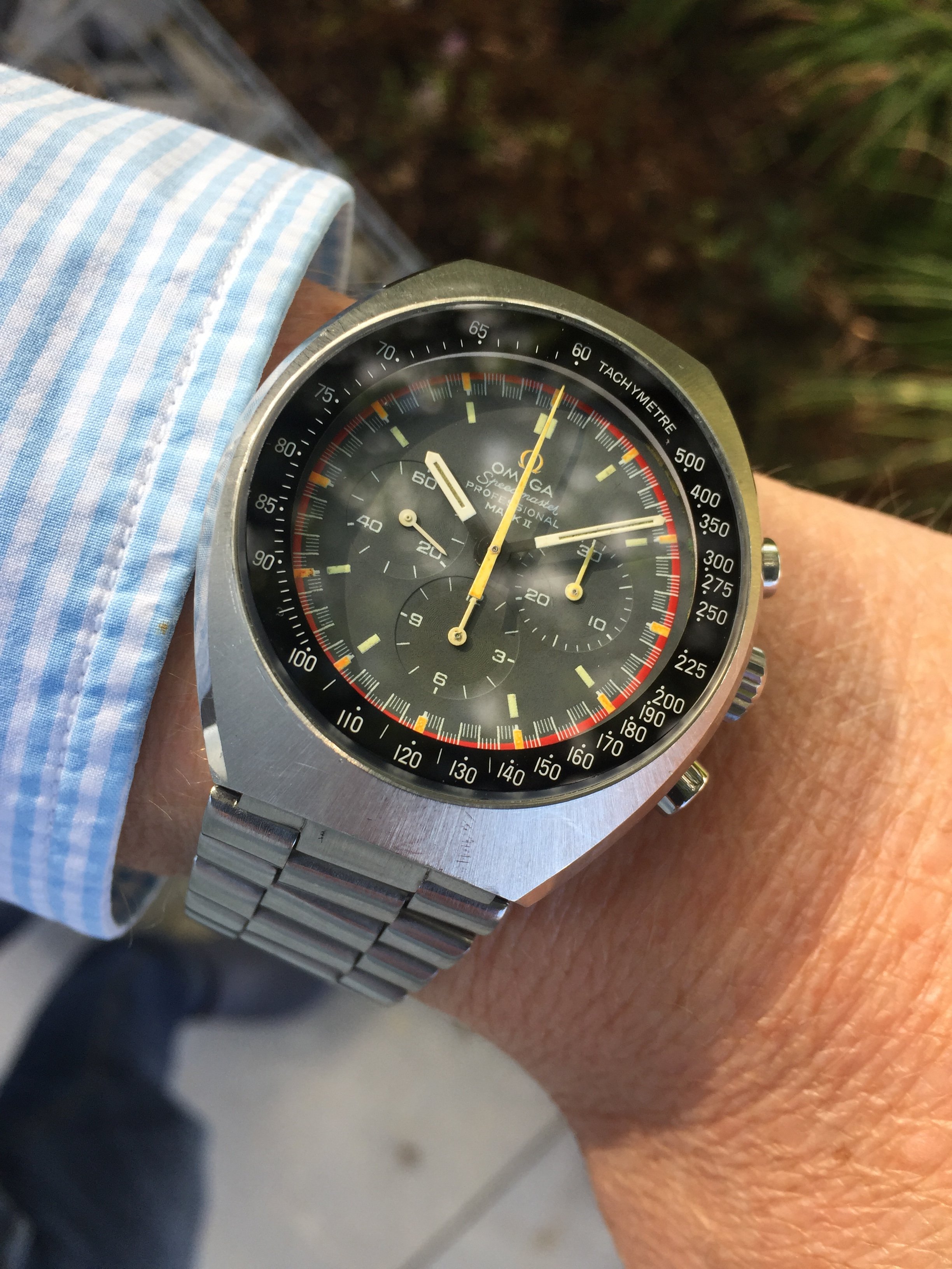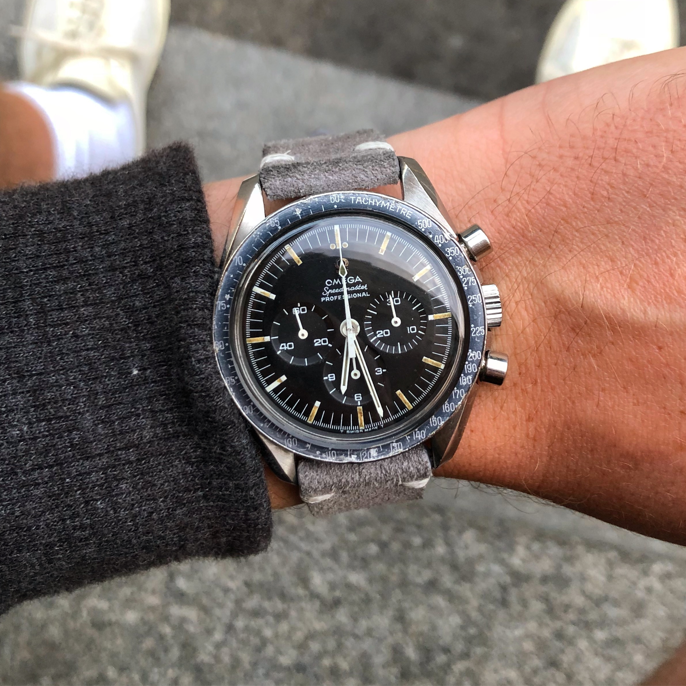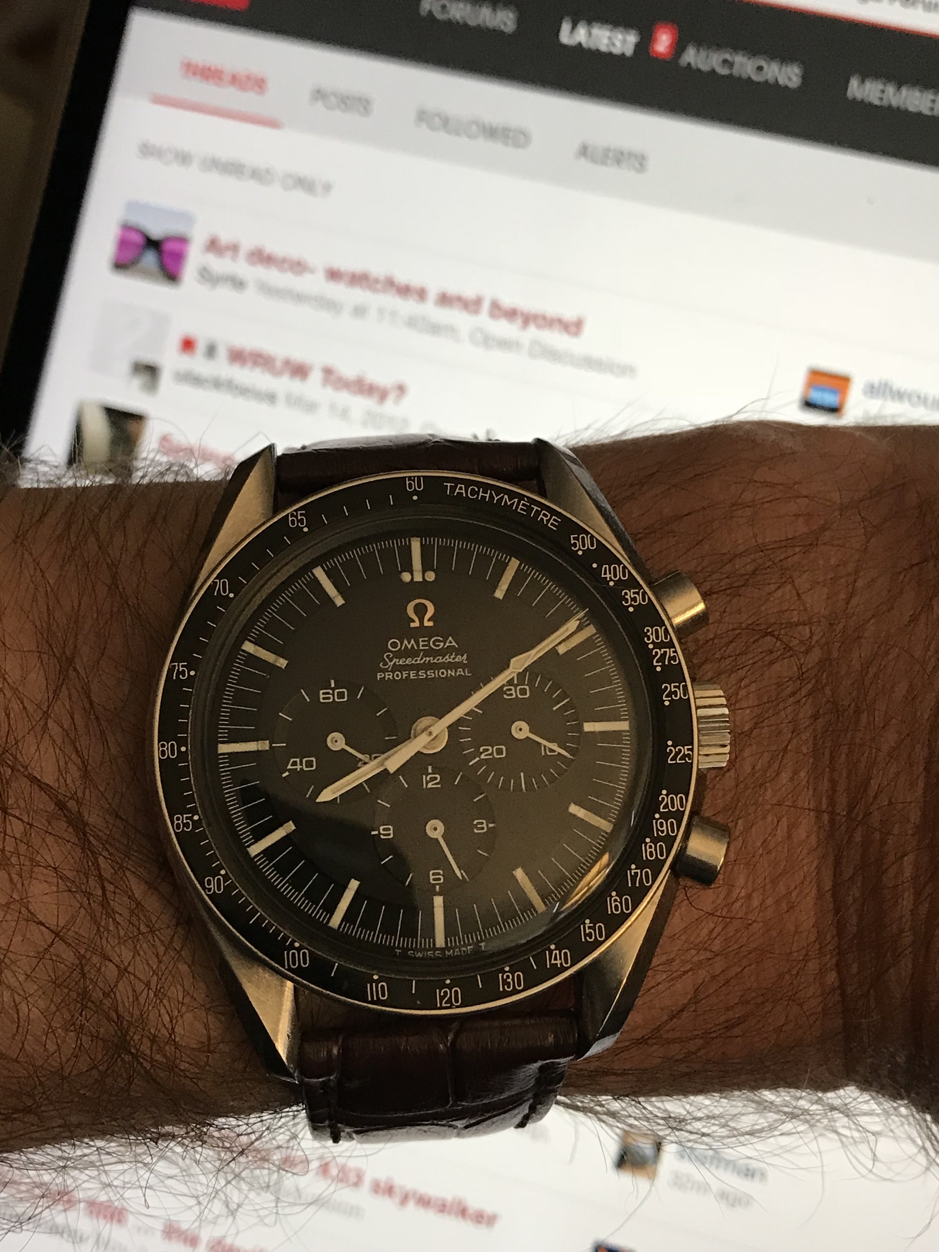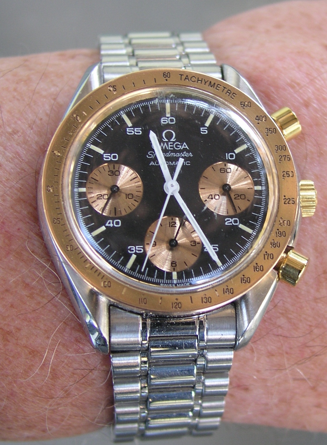 Yet another Speedmaster. My 18-karat rose gold 175.0033 reduced. I鈥檝e owned it for 28 years. Made for the European market (bought in Germany, not by me). Came on a cheesy faux alligator strap which I hated from the get go. Since no rose gold and steel Omega bracelet was available (at least in Canada), I put a steel Omega bracelet on it. My most photographed watch. Forgive me.