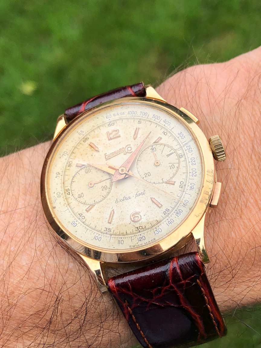 Eberhard Extra-Fort mono-pusher (the lower "pusher" is actually a slider that pauses the chrono). A relatively obscure brand, but popular for their 39mm cases.
