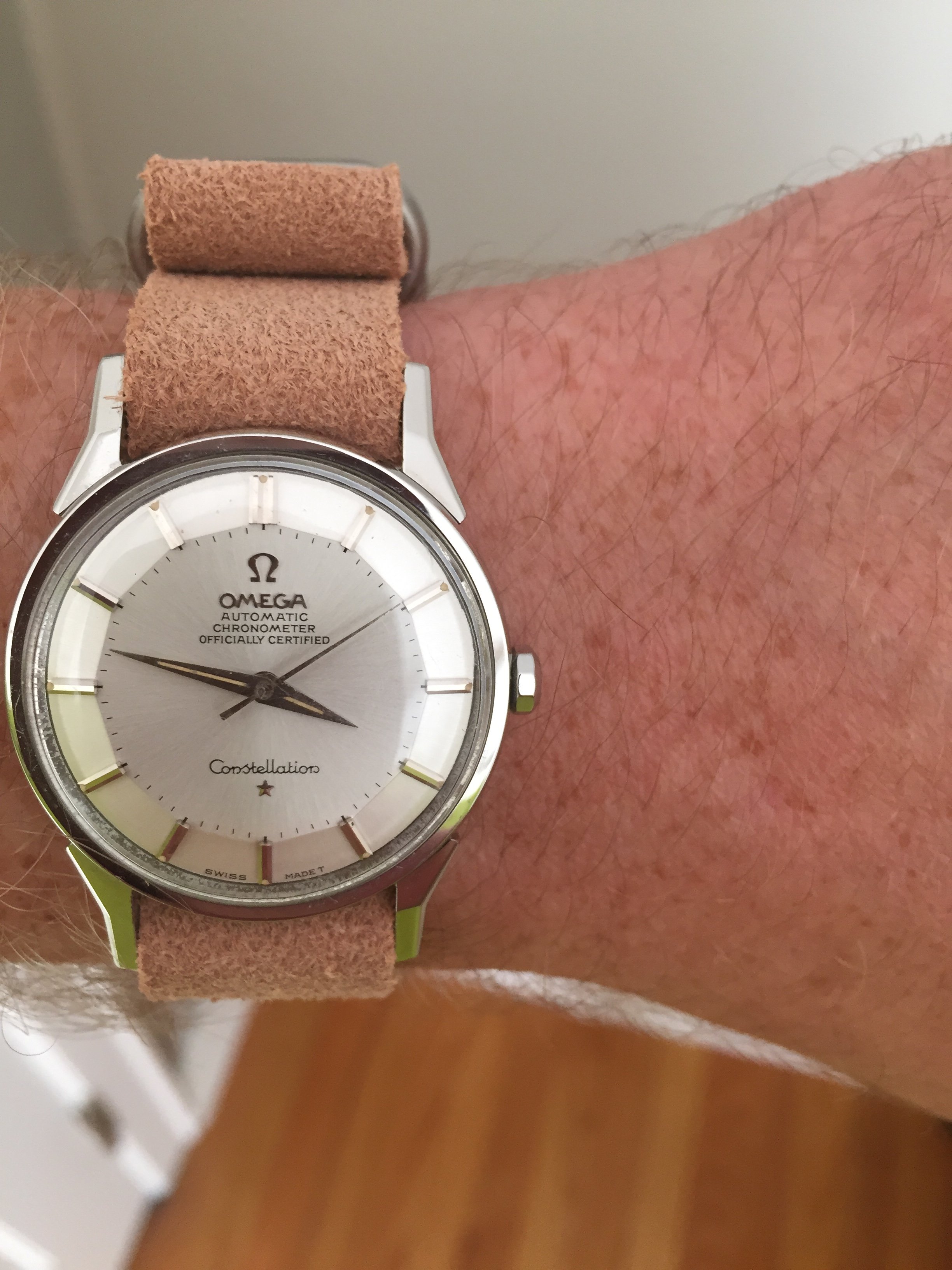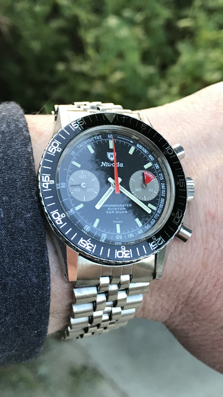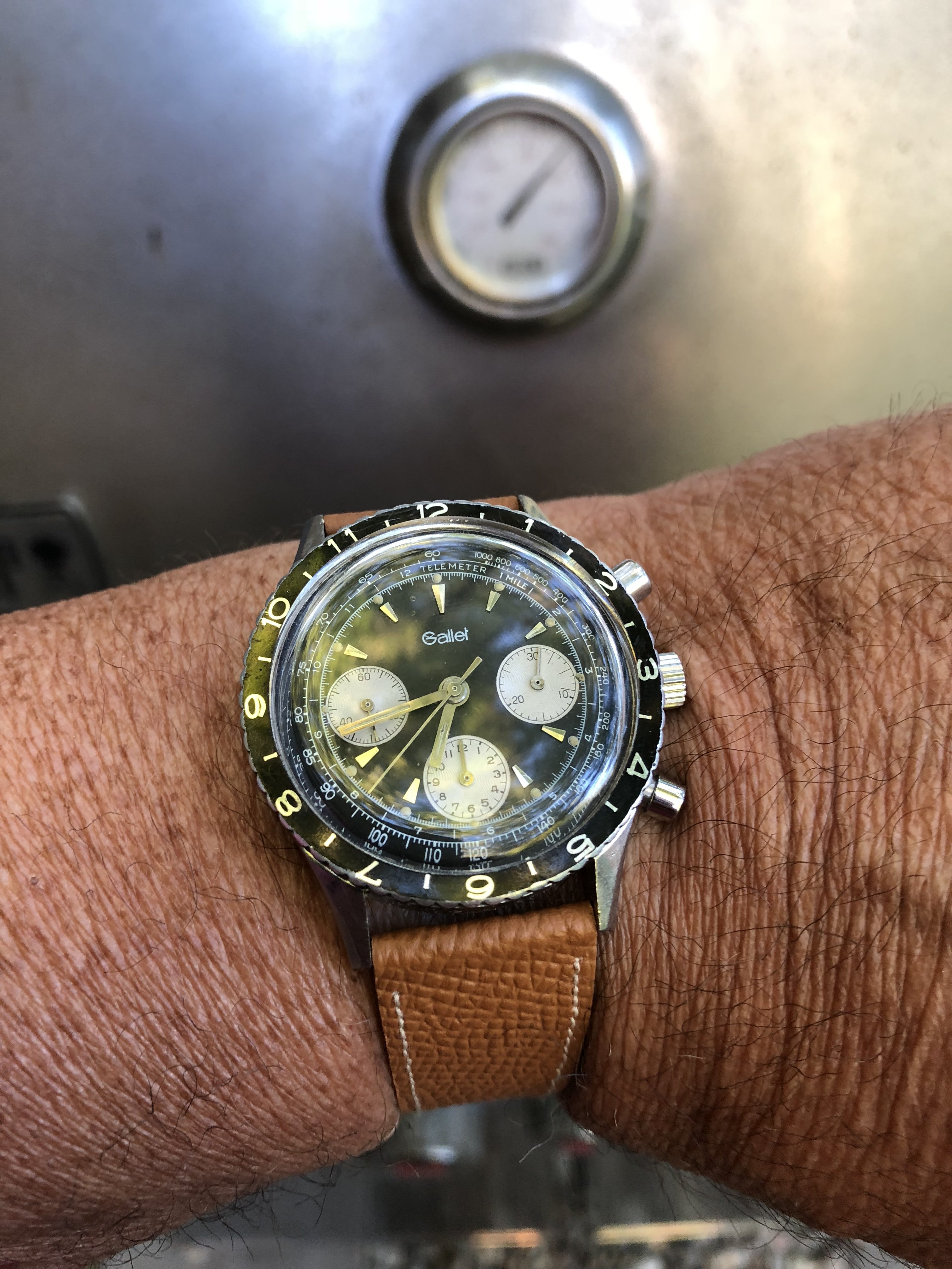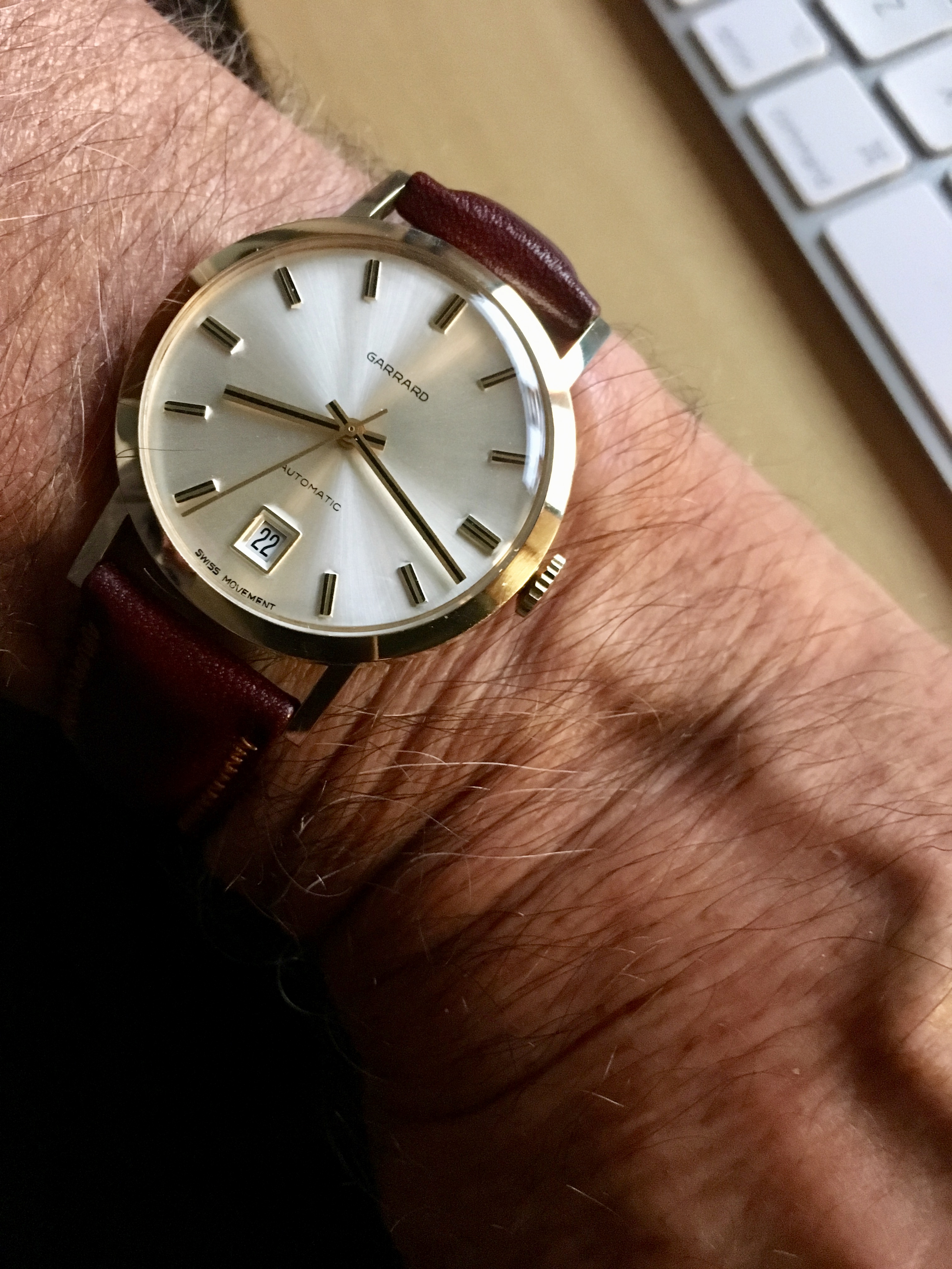 Lost (well, misplaced) and found....my dad's 1940s Movado "Sport", which I stuck in a box when we moved several years ago and wasn't able to find until last night....stainless case with screw down back and rose gold bezel and crown...fifteen jewels, 28mm case diameter, 39mm lug-to-lug, 16mm band.....serviced and "restored" by Movado 25-30 years ago.