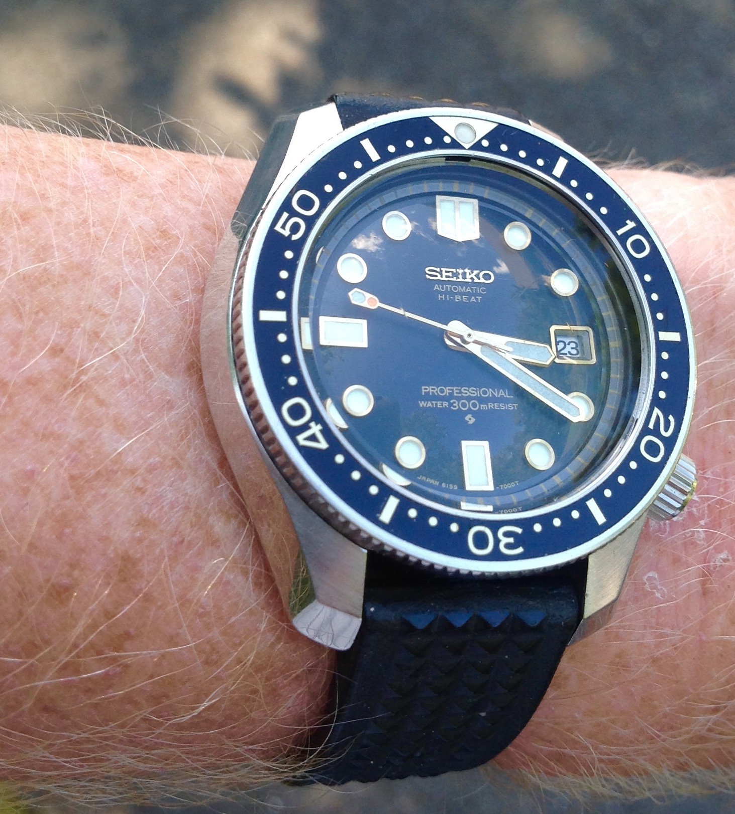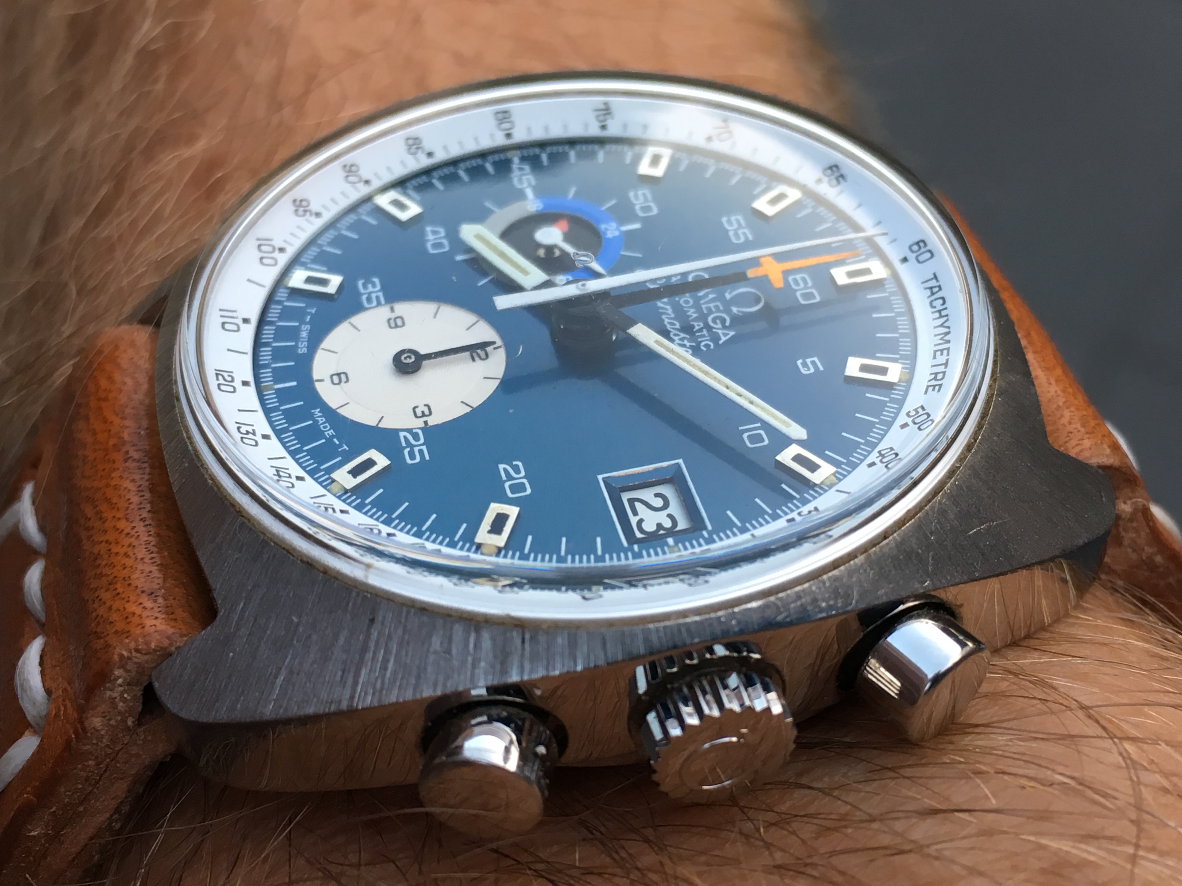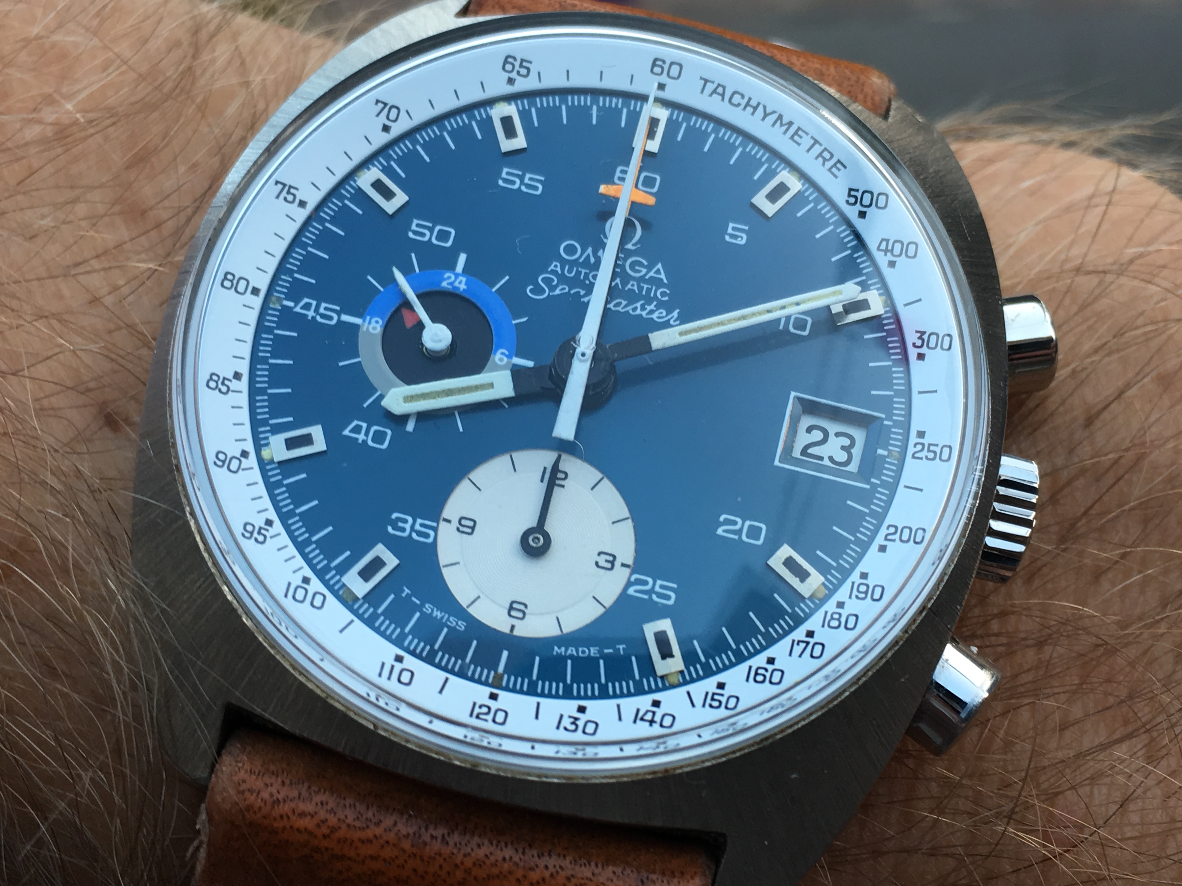 I did replace a flat bottomed chrono hand that was on the watch with the drop end that’s on it now, but still luminova.