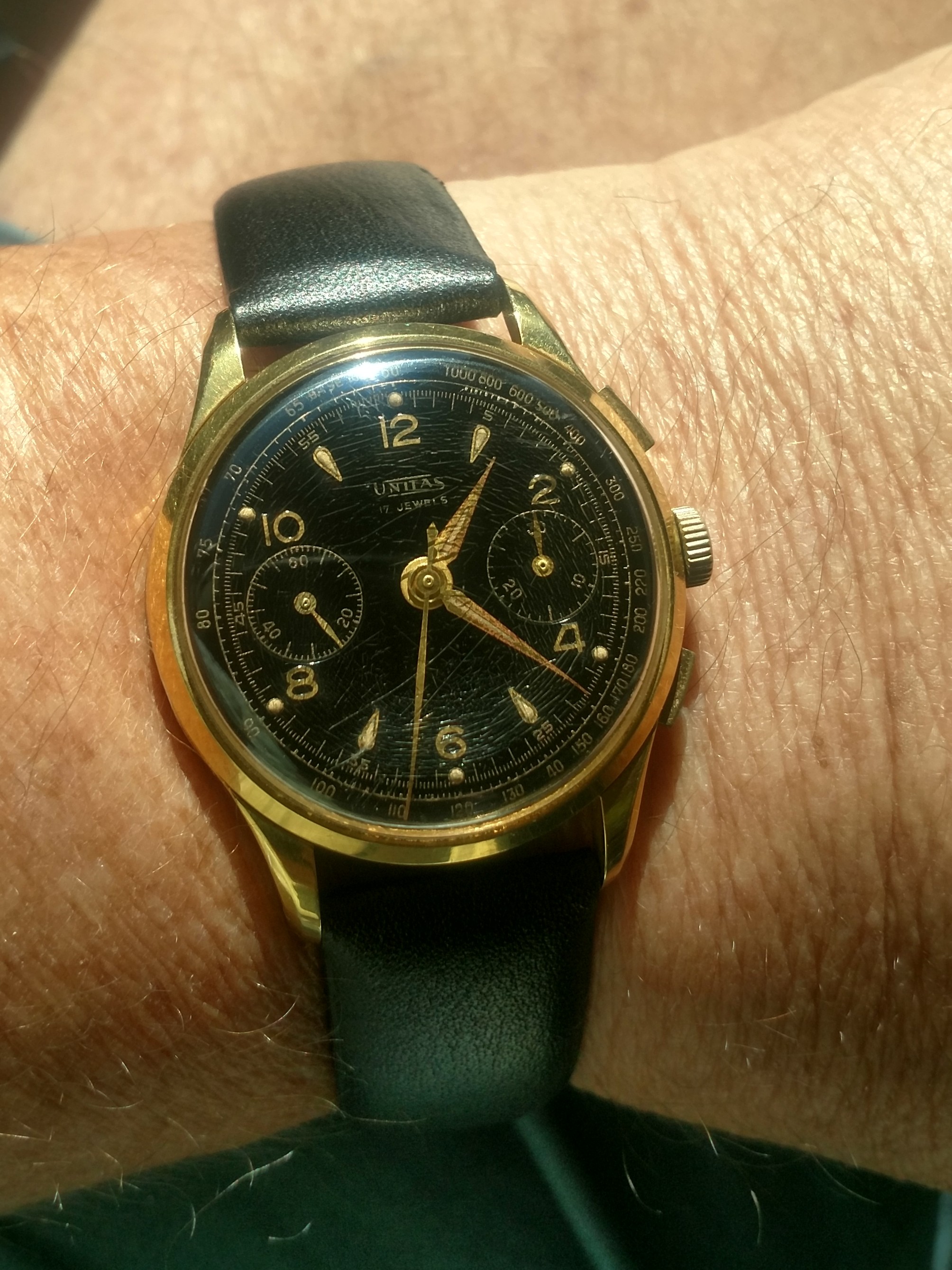 While at the shop, Jack, one of the proprietors, waved this tasty little morsel in front of me. We put a deal together on the spot. Lovely rose gold case, hands and applied Arabic numbers and indices. VJ72 with a high degree of finishing. Been wearing this one today, too.