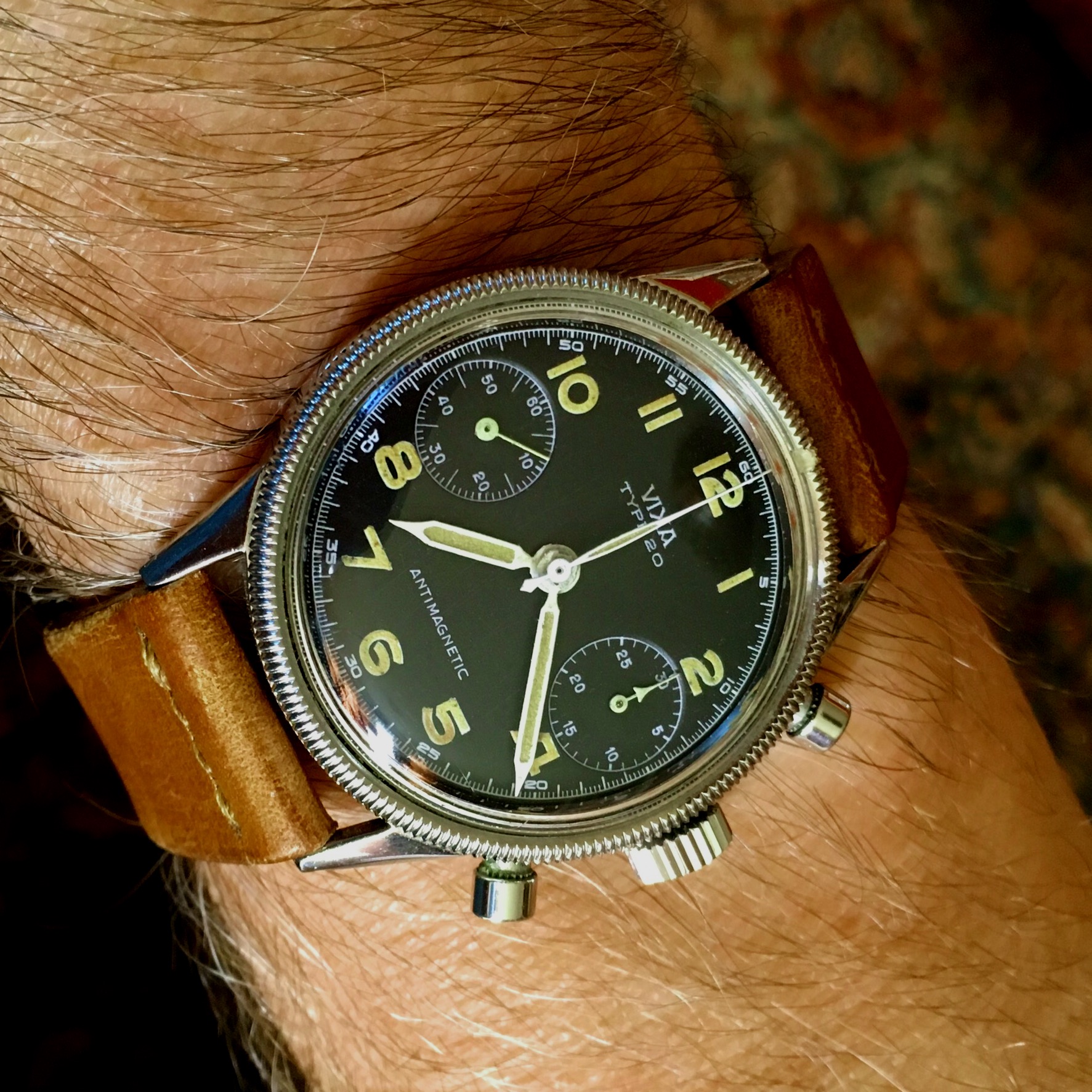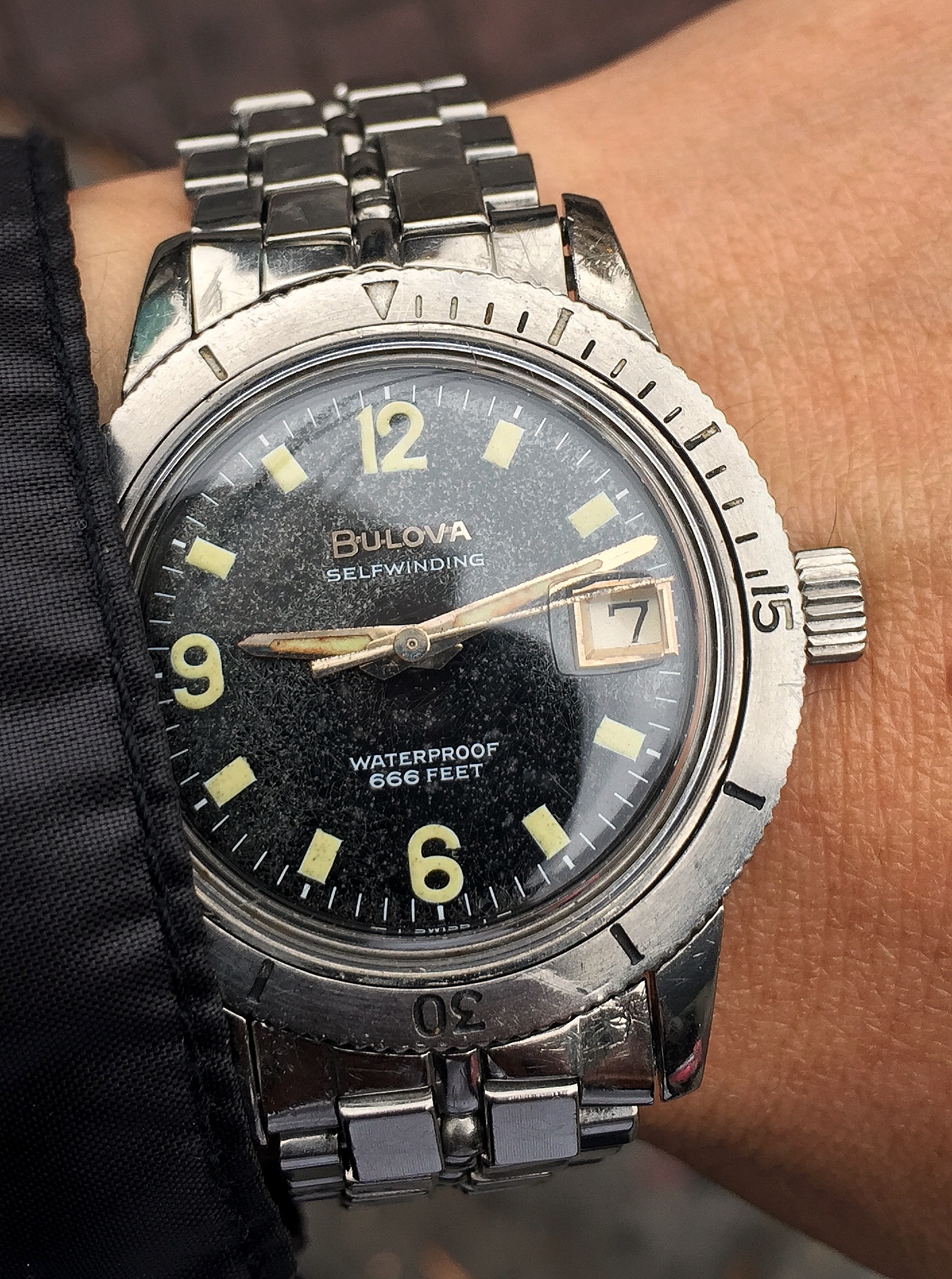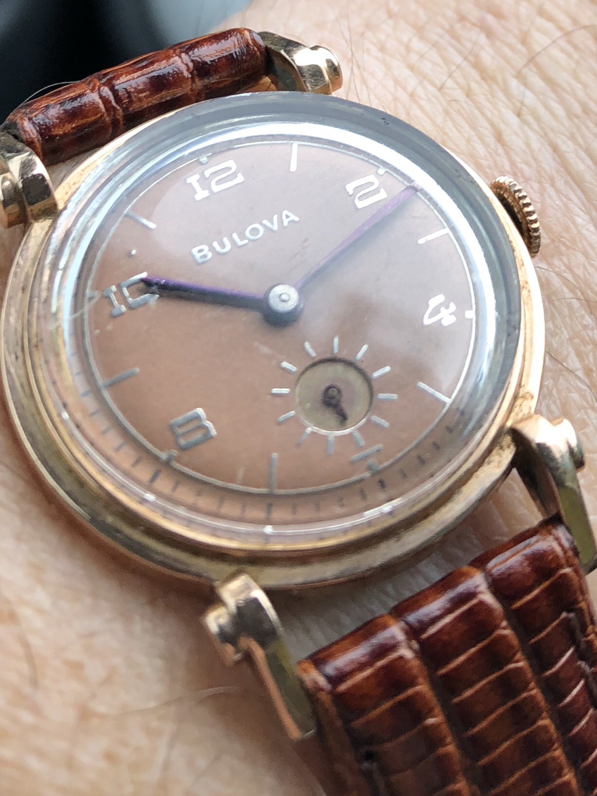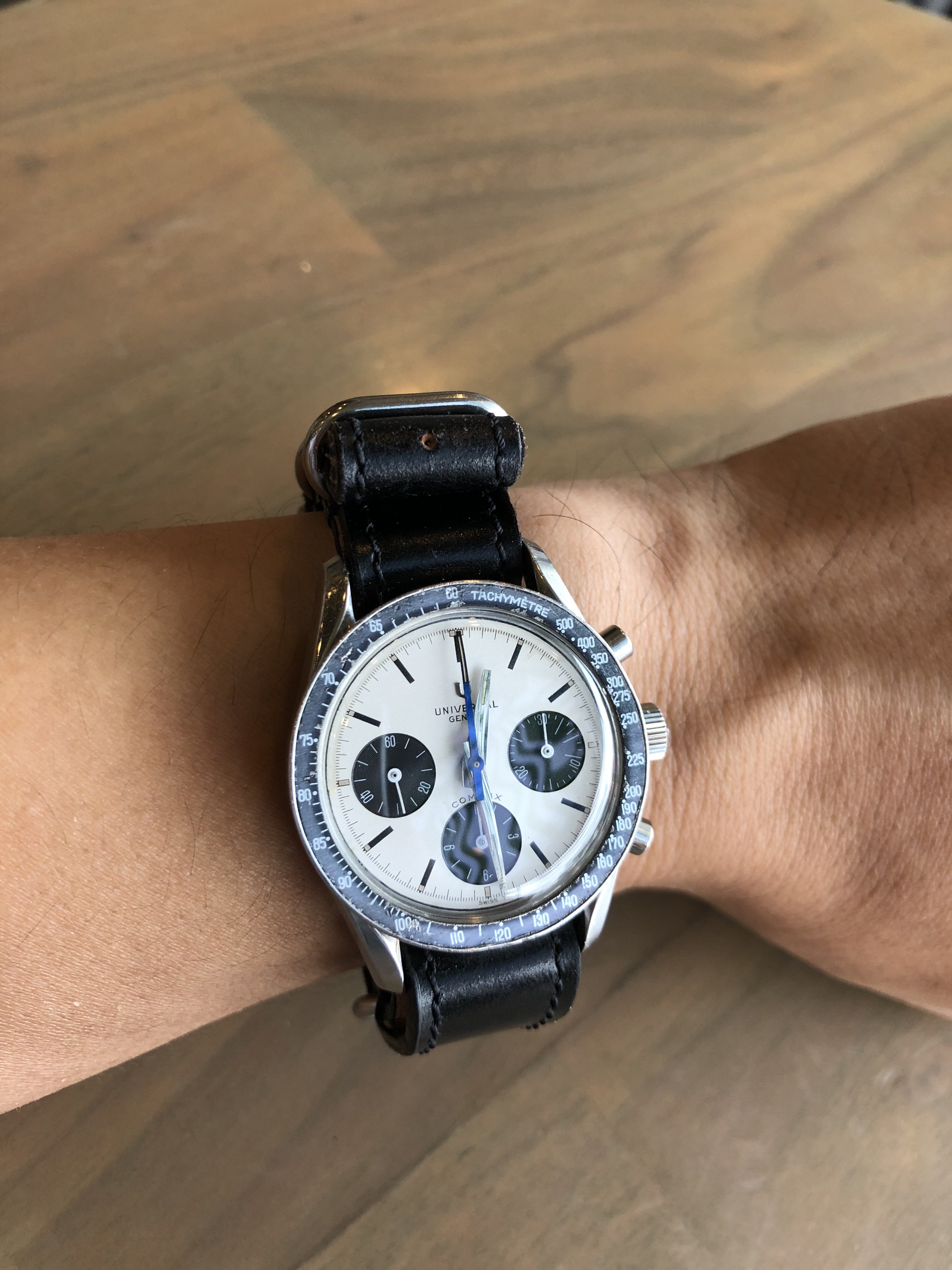 Handsome watch....interesting case design.....the dial color is great and contrasts beautifully with the markers. I have one of these I am working on, but my dial is an off-white....now you have me looking for another one with your color dial.