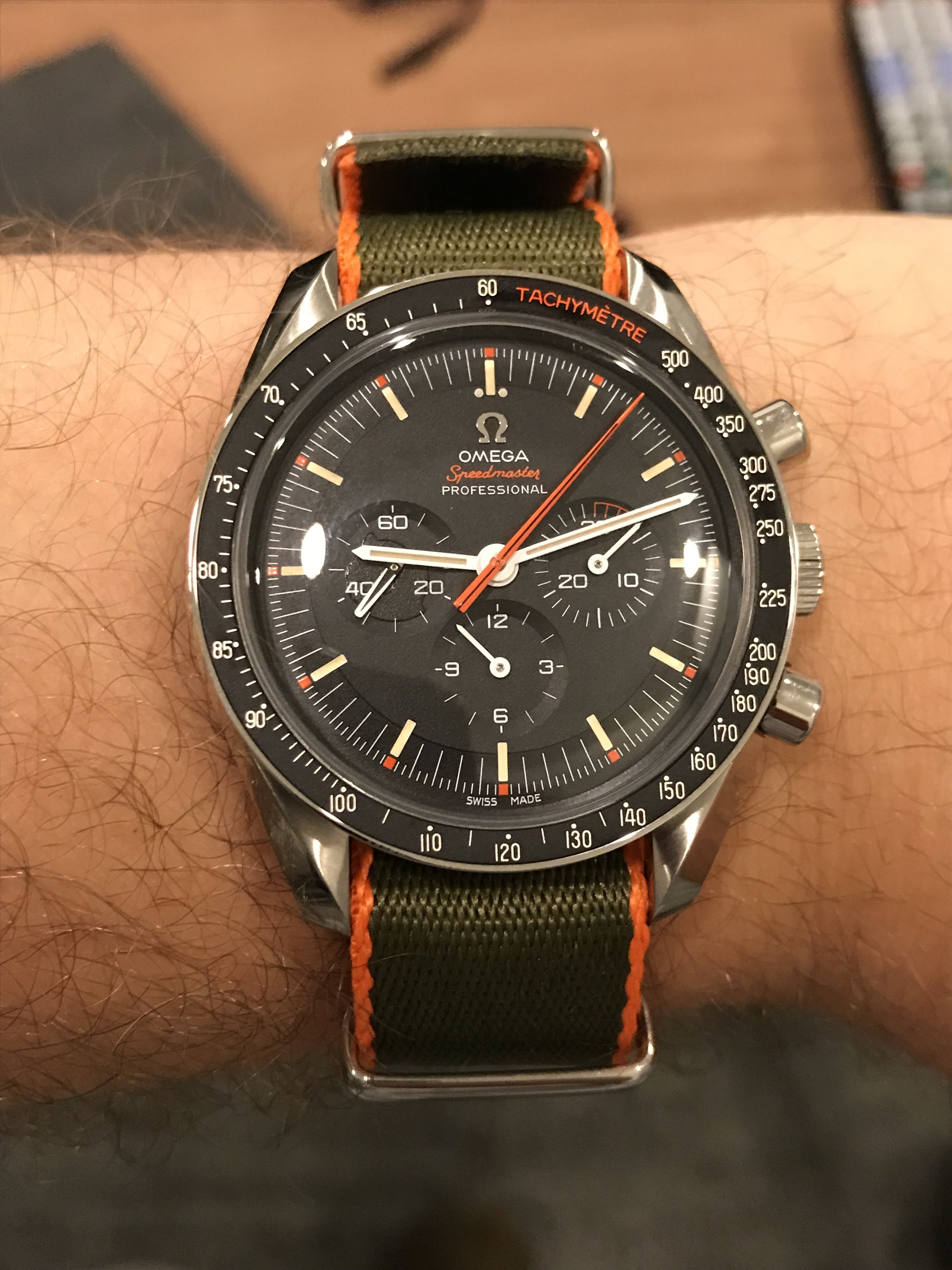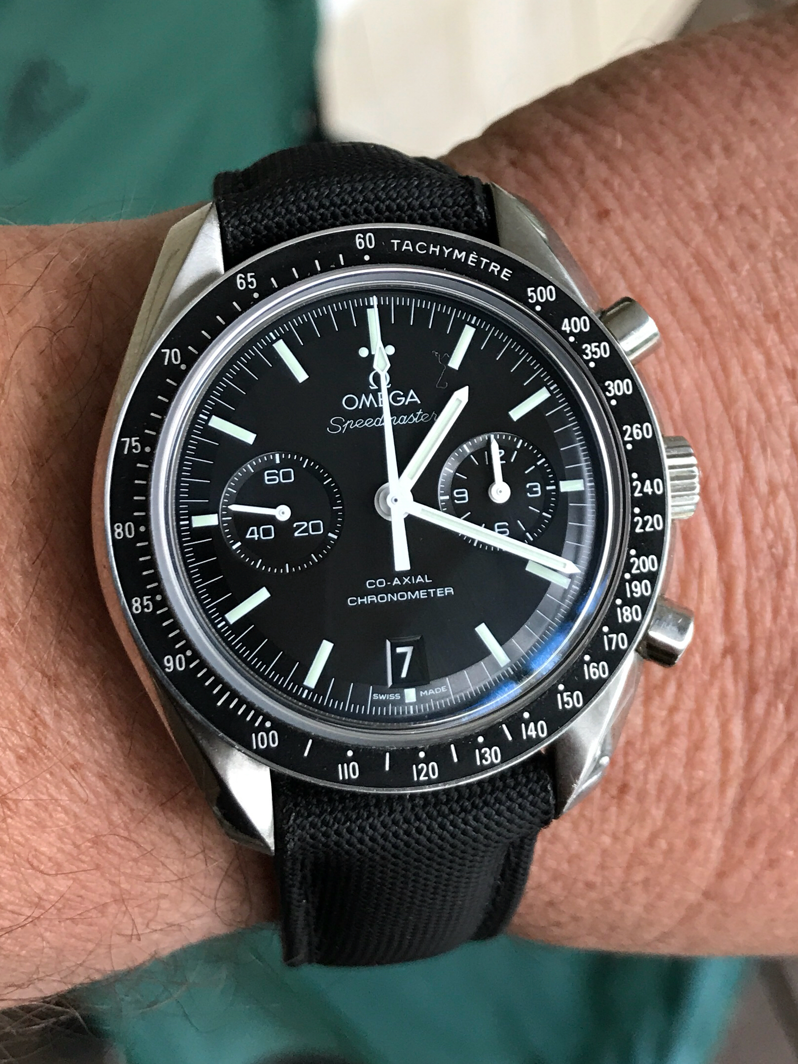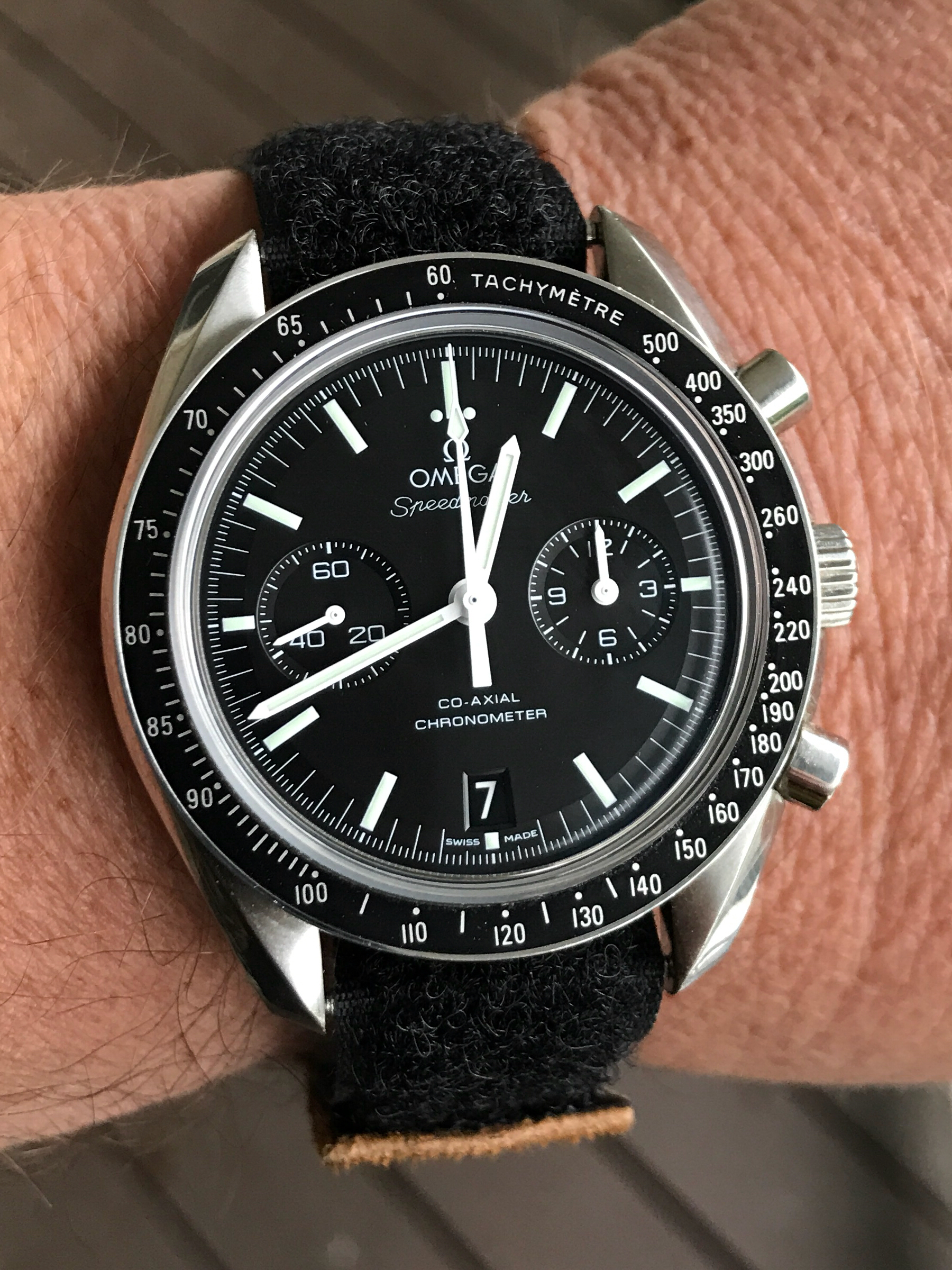 Speedmaster co-axial Moonwatch Chronograph on 20mm Velcro. Yes, I am aware that the 44.25mm Speedmasters take 21mm straps. This one was advertised as 21mm but CheapNatoStraps is full of crap. The suede details are indeed 21mm but the Velcro is only 20mm. CheapNatoStraps is a complete pile of crap. The only truthful thing about them is “Cheap.” Tossers.