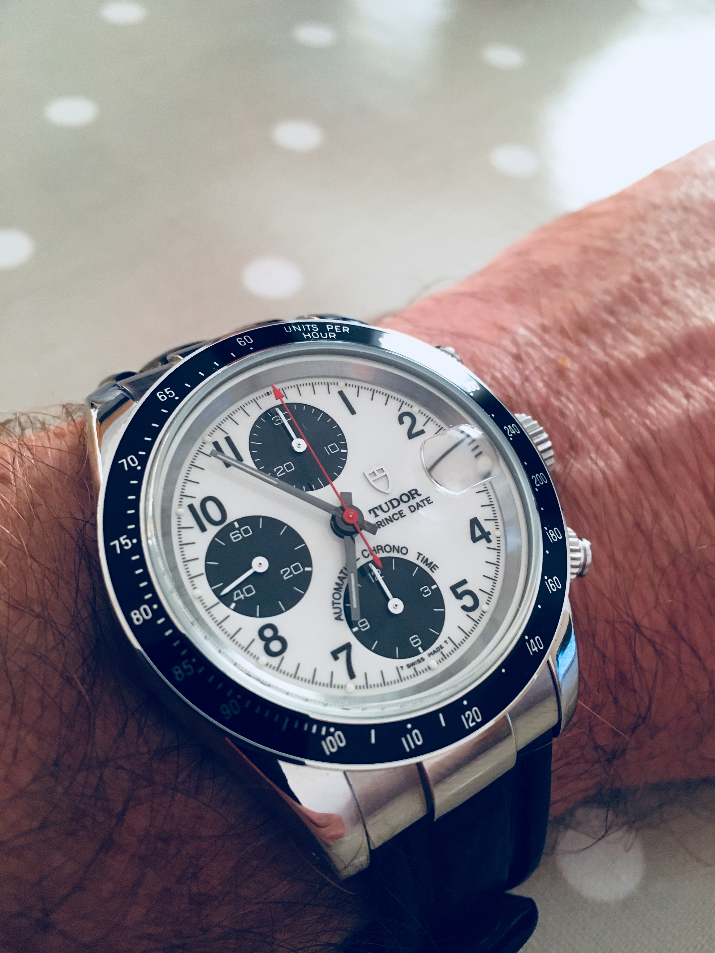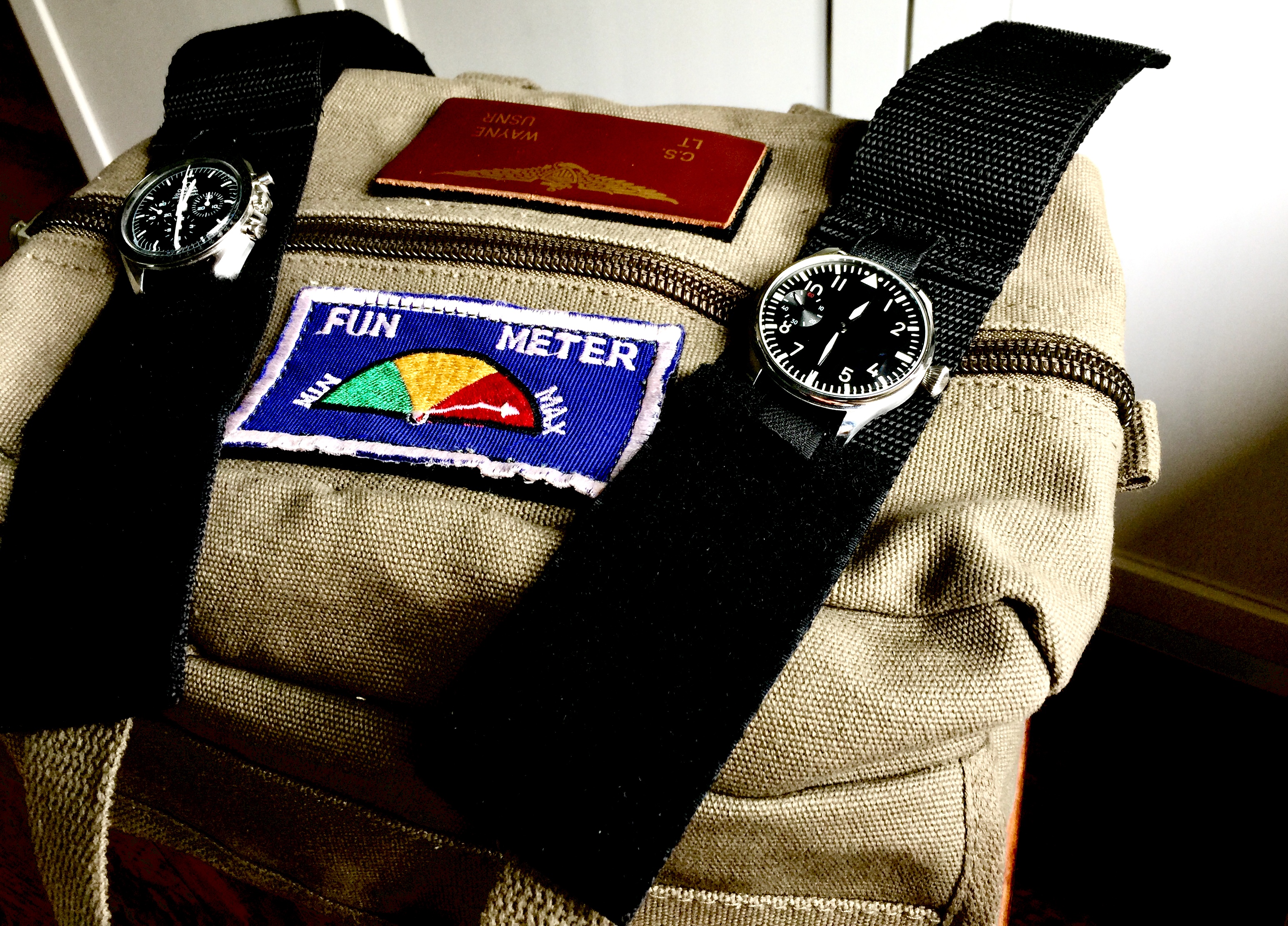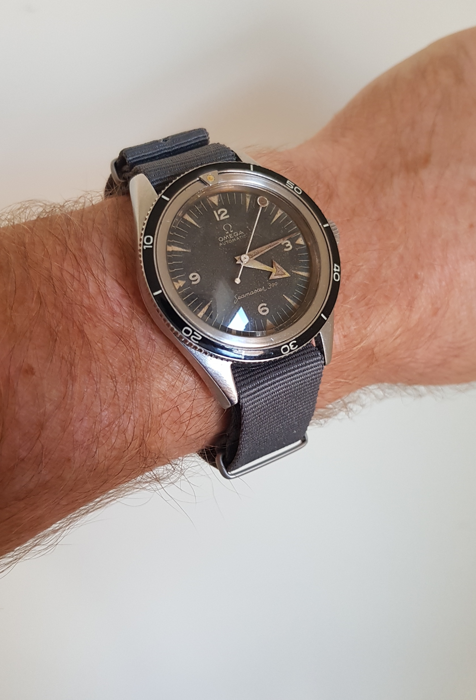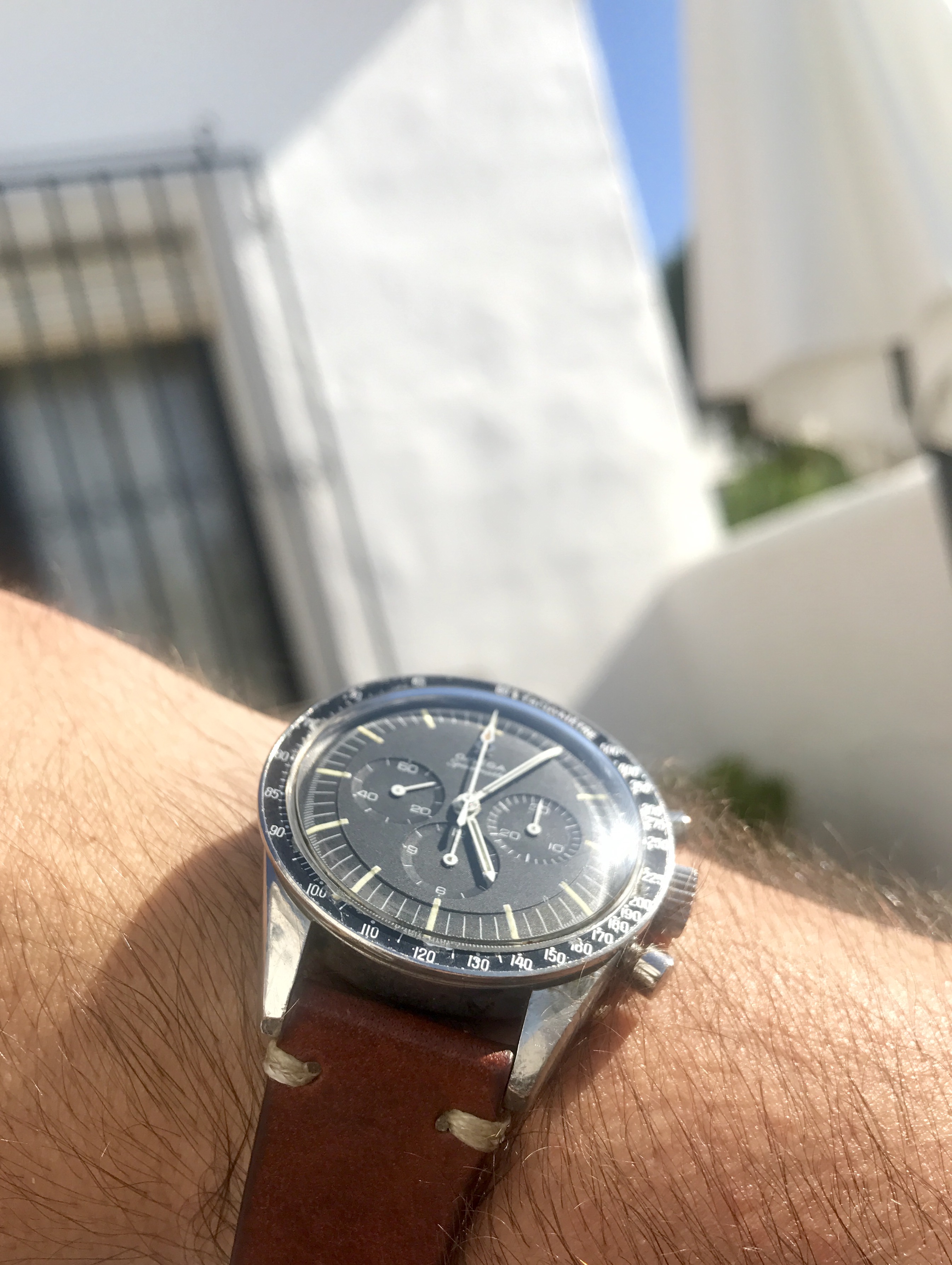 Speedmaster co-axial Moonwatch Chronograph on 20mm Velcro. Yes, I am aware that the 44.25mm Speedmasters take 21mm straps. This one was advertised as 21mm but CheapNatoStraps is full of crap. The suede details are indeed 21mm but the Velcro is only 20mm. CheapNatoStraps is a complete pile of crap. The only truthful thing about them is “Cheap.” Tossers.