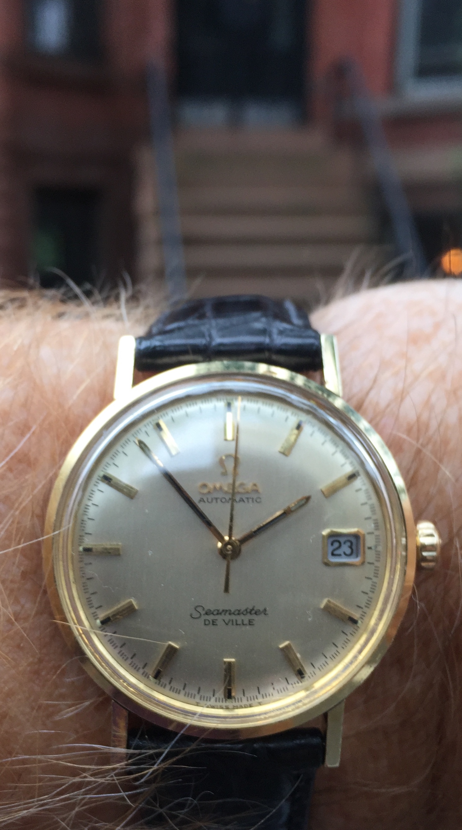Maybe somebody’s grail watch, but not mine. Late 1960s Tissot PR516 that I have fallen heir to. Came without a bracelet. After a quick scrub to remove paint splatters, ultrasonic wash and brush scrub, new armoured acrylic crystal, and a generic crown, it looks better. Solution to generic crown is imminent. Notch the ends of an 18 mm strap (would have preferred black, but didn’t have one in 18mm width), two stainless steel pressure pins, and voila! I do like the slate colour of the dial.