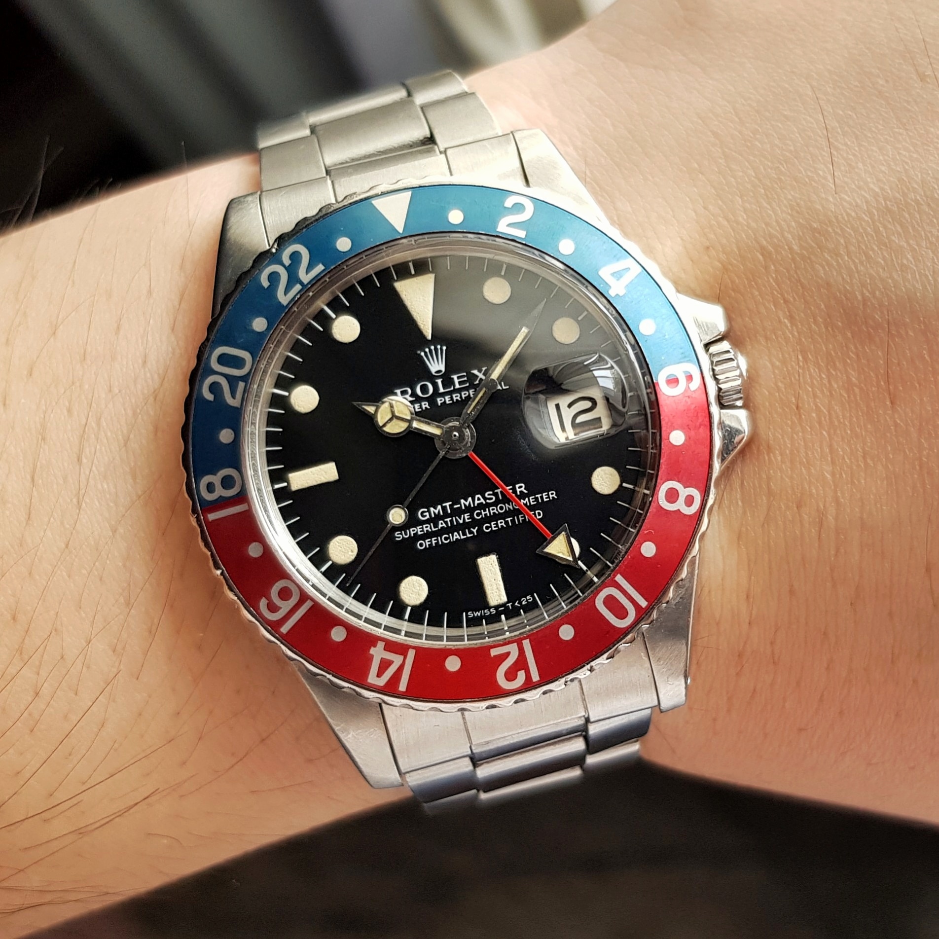As the cheesy dealers say in their listings, "This is no safe-queen!". Very well-worn, banged-up, and faded ... but running and intact (except for the incorrect bracelet). I think the look may grow on me. For now, I'm just going to have my watchmaker do a full service.