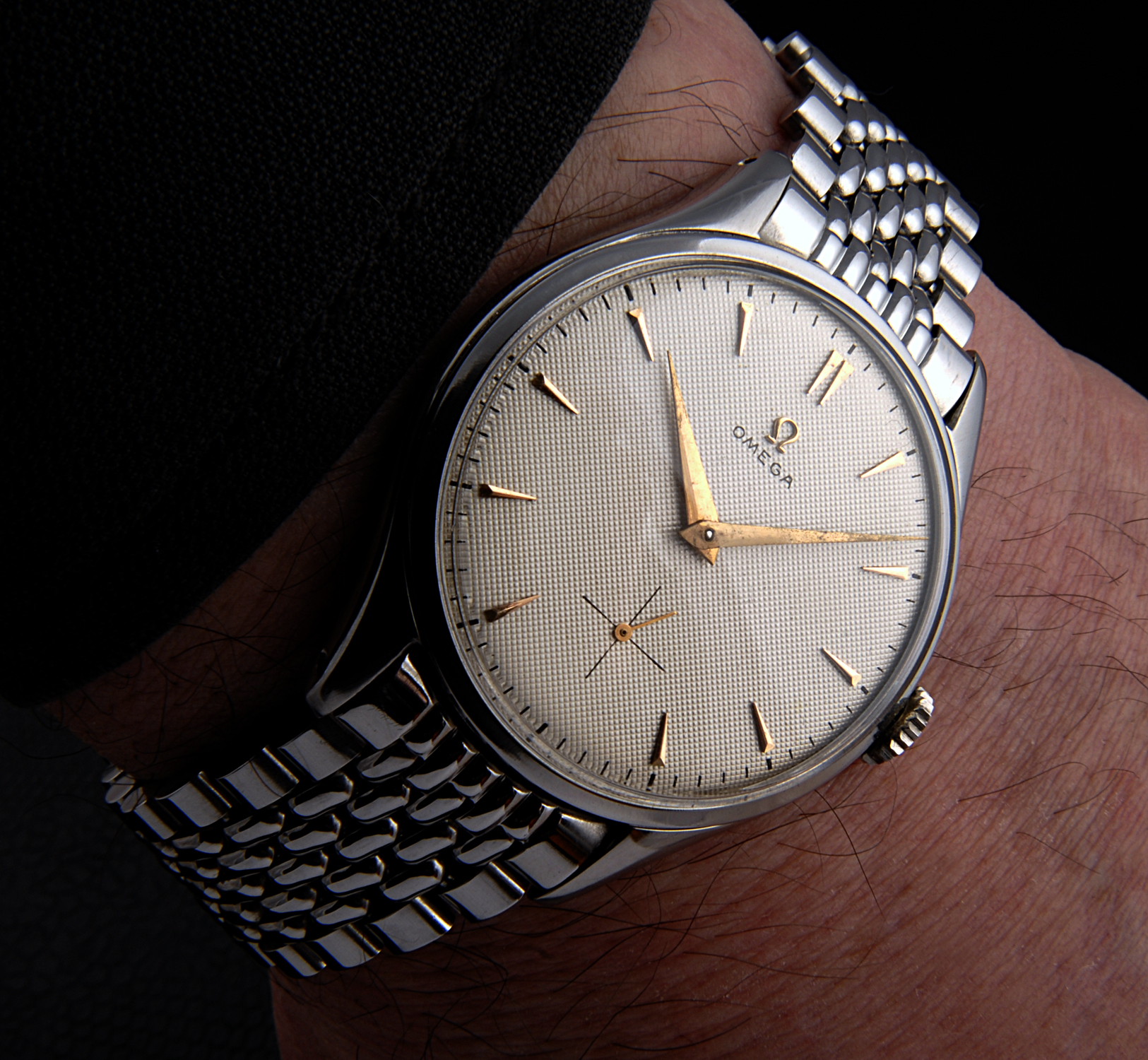 Evidently 'Waffle Dial Day' ! - So whilst marking Student assignments, I shall sport my 1954, 38mm Omega 2505 Cal.266, on frankly the best vintage bracelet, Omega ever produced.