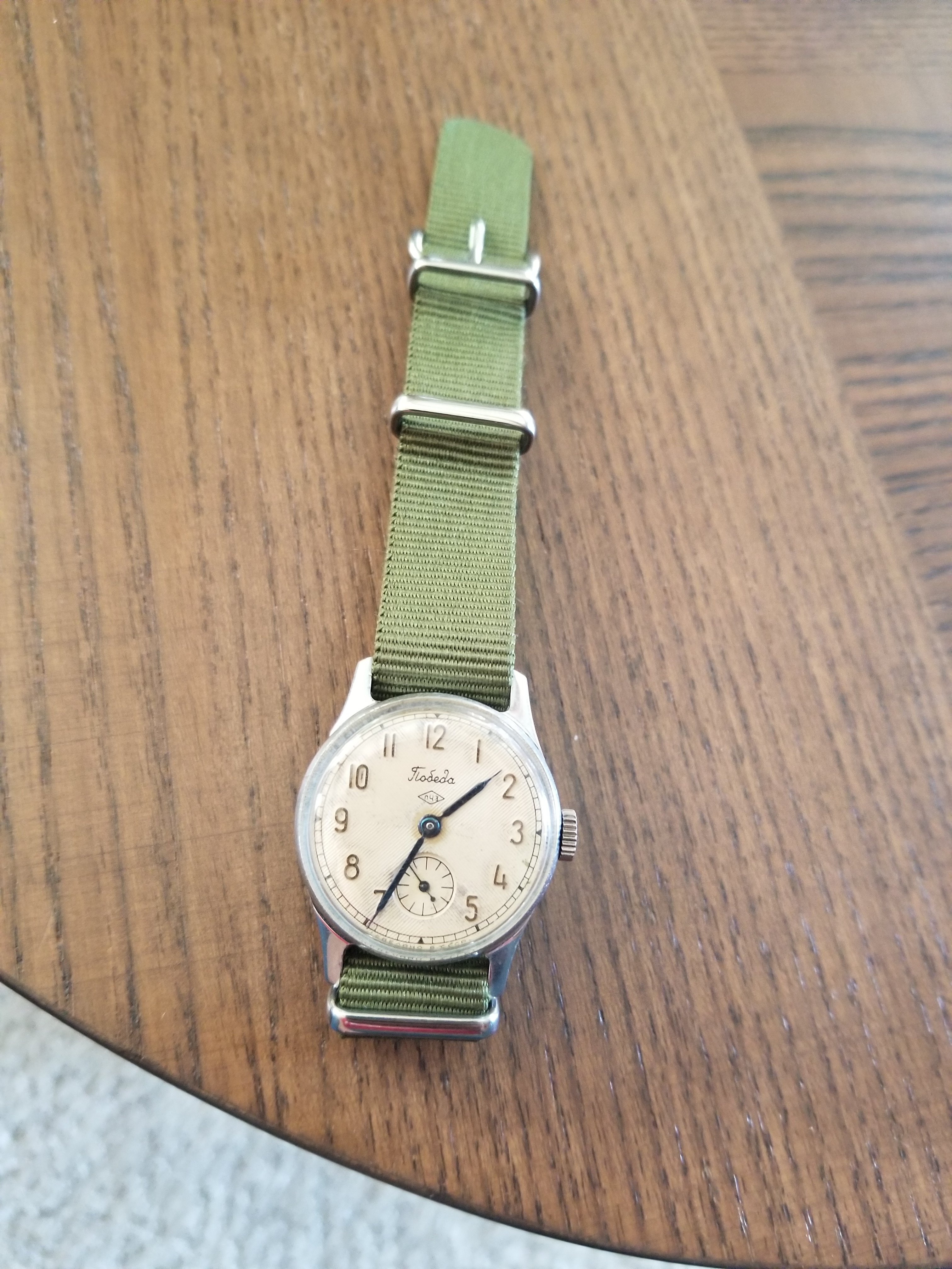 Posts 400 Likes 1,430 haqq777 ·Nov 2, 2018 Pobeda manual wind today. Built in the 1st Watch Factory in Moscow in first quarter of 1949. Had it fully serviced. Runs +1 sec/day. Not bad. Wears very small even on NATO and smallest in my collection, but hey, it is a great conversation starter.