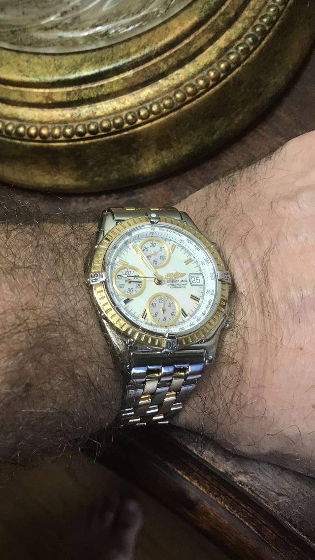 Posts 825 Likes 8,248 Njnjcfp88 路Nov 25, 2018 Avec votre faveur.... my only Breitling watch- Chronomat circa 2000 ... the MOP dial gives off a rainbow look... really like my only blingy watch.