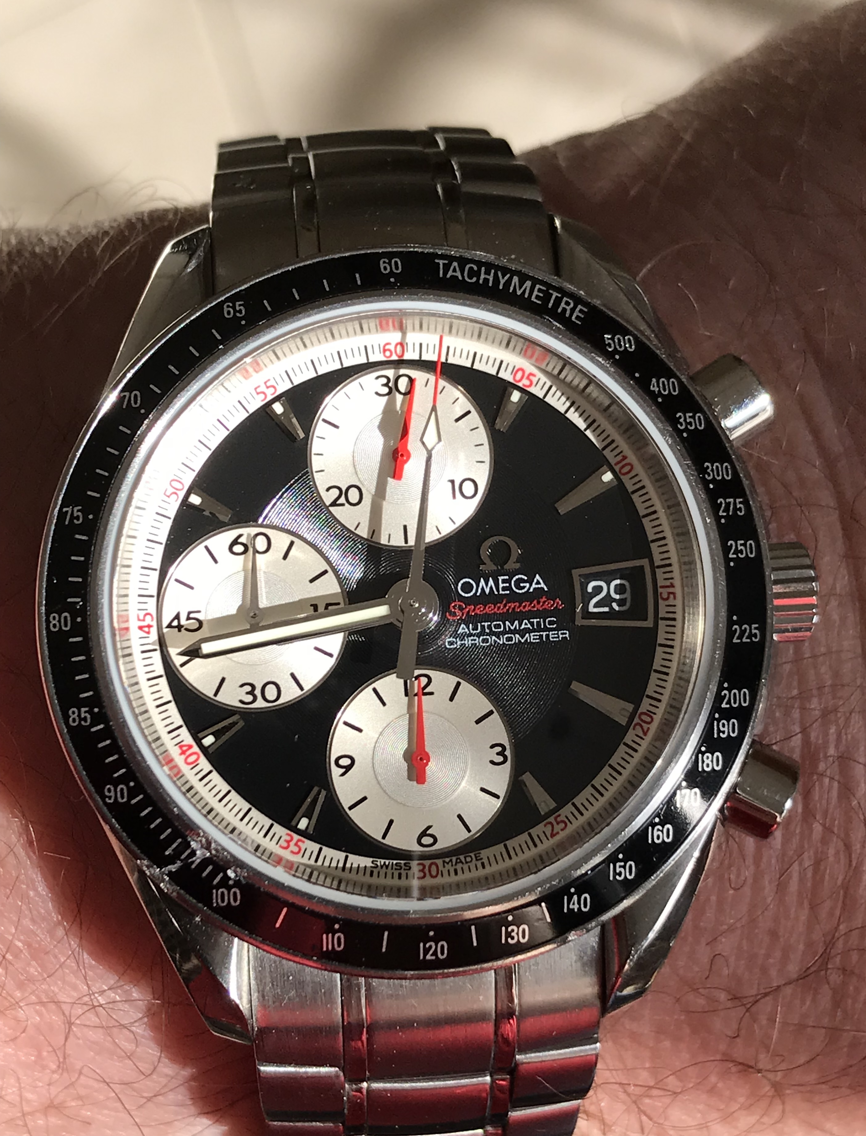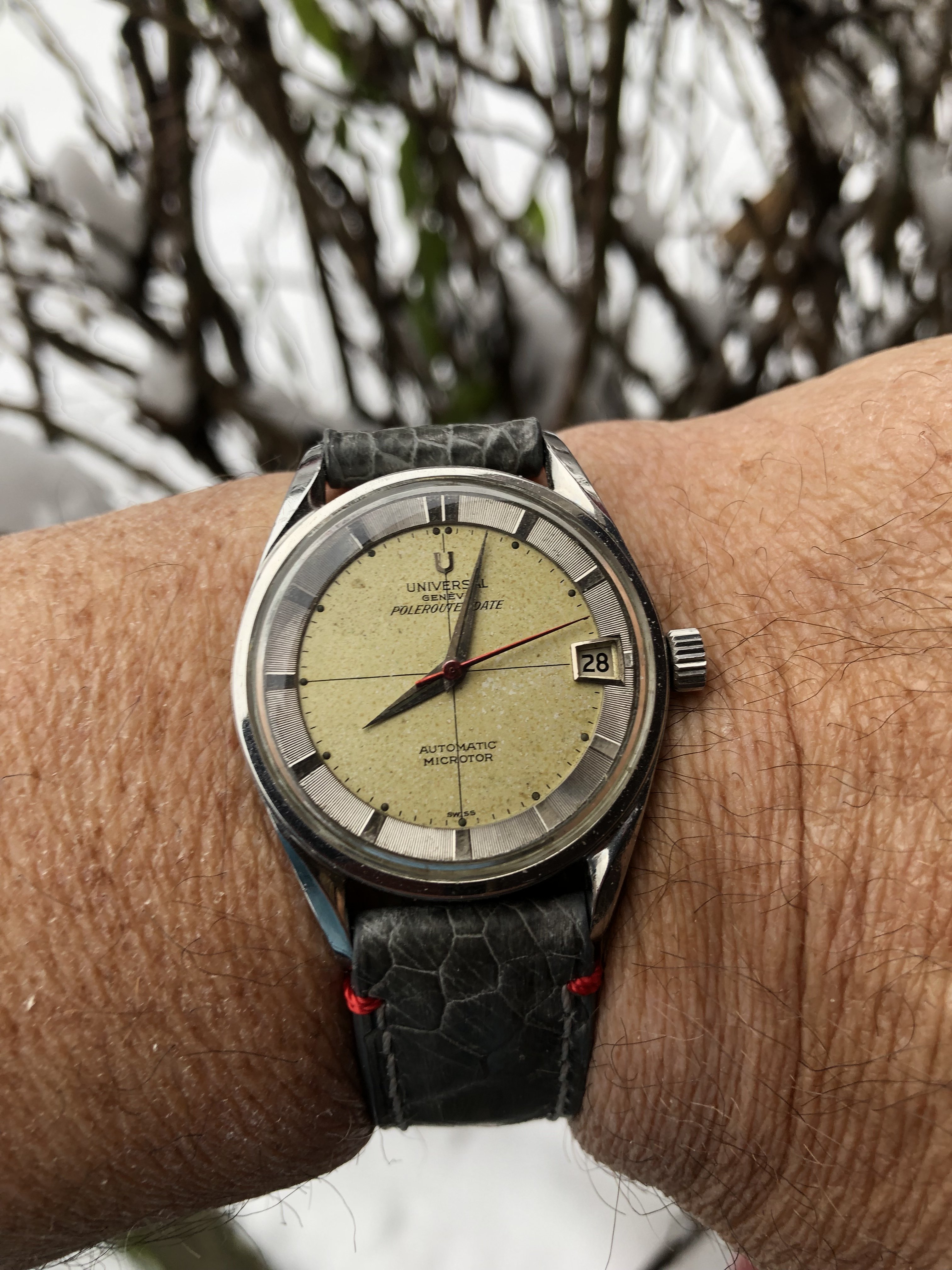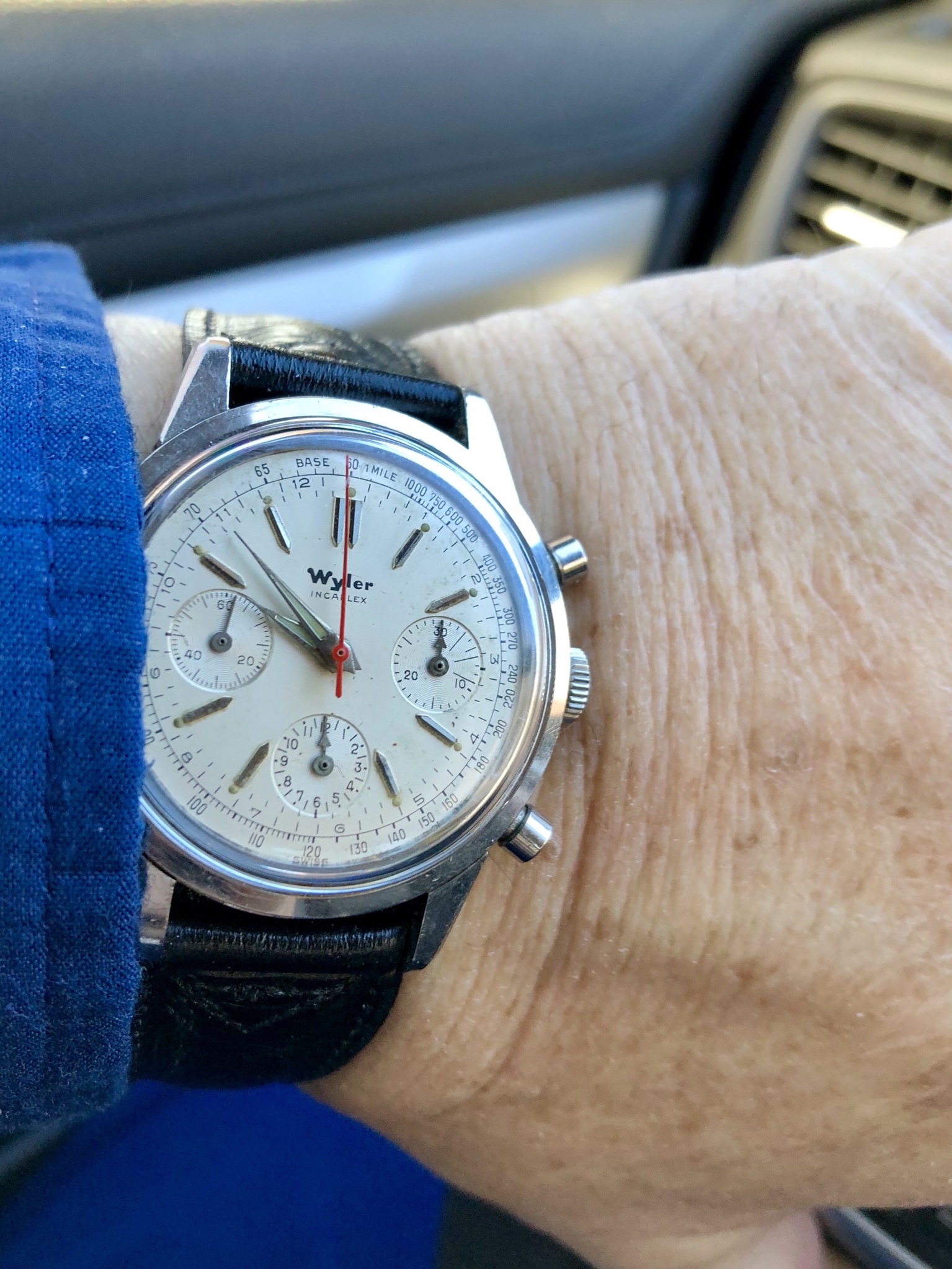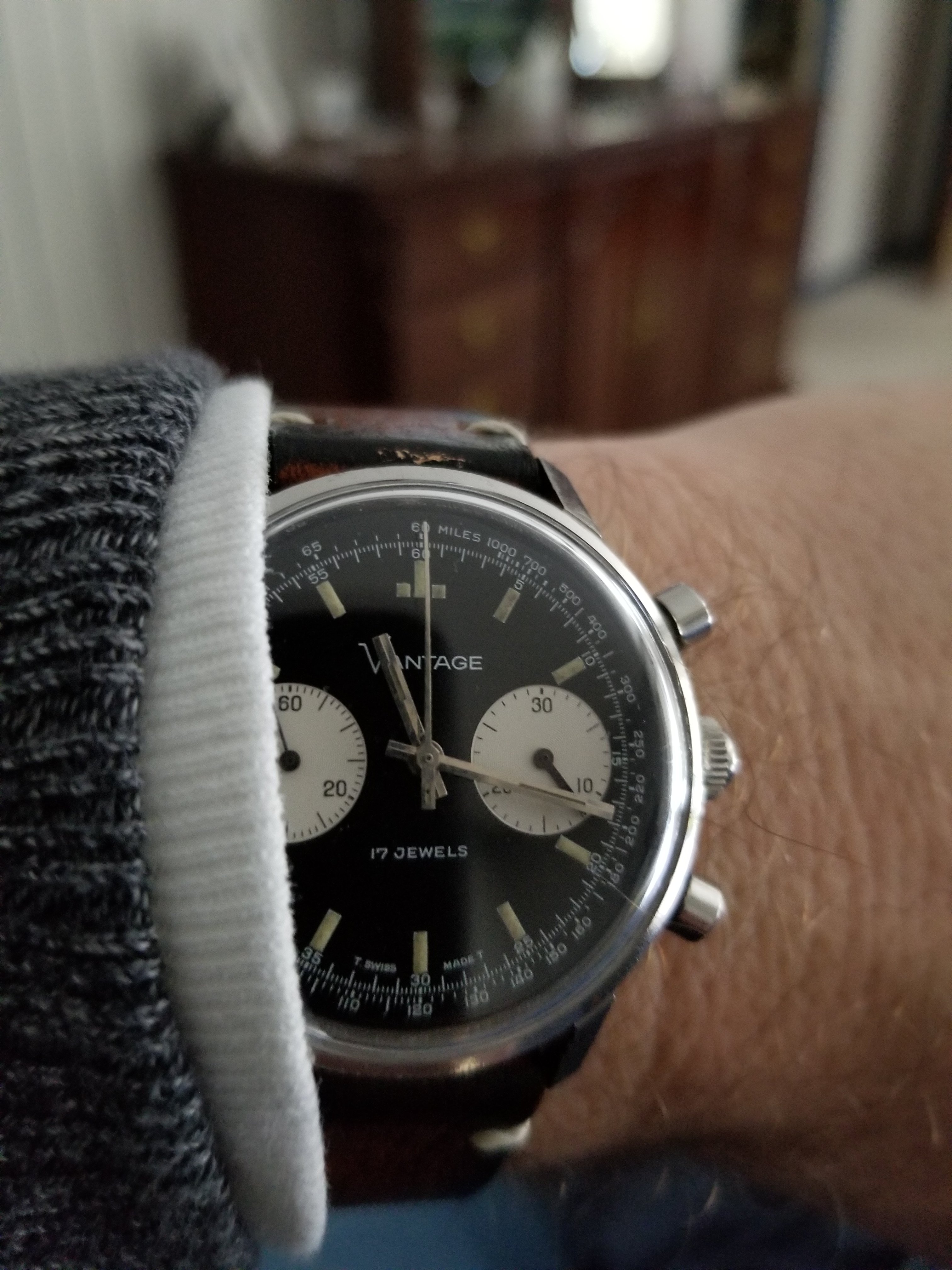 My most recent buy, a Vantage, by Hamilton, reverse panda. Waiting on my watchmaker to catch up with previous watches I have already brought in, so I can have it serviced as the chrono does not work properly. Seller was a stand up guy though and agreed to pay for the service. Originally, I thought the crown was a replacement, but have since found pics of 2 other Vantage chronos with this same crown, so thinking that is too many to just be a coincidence. But, I would be interested in any feedback.