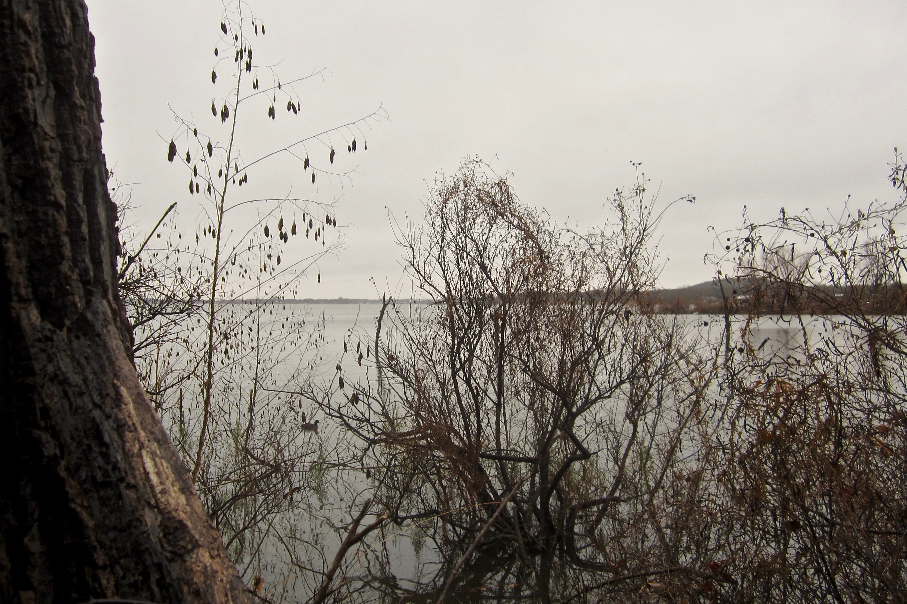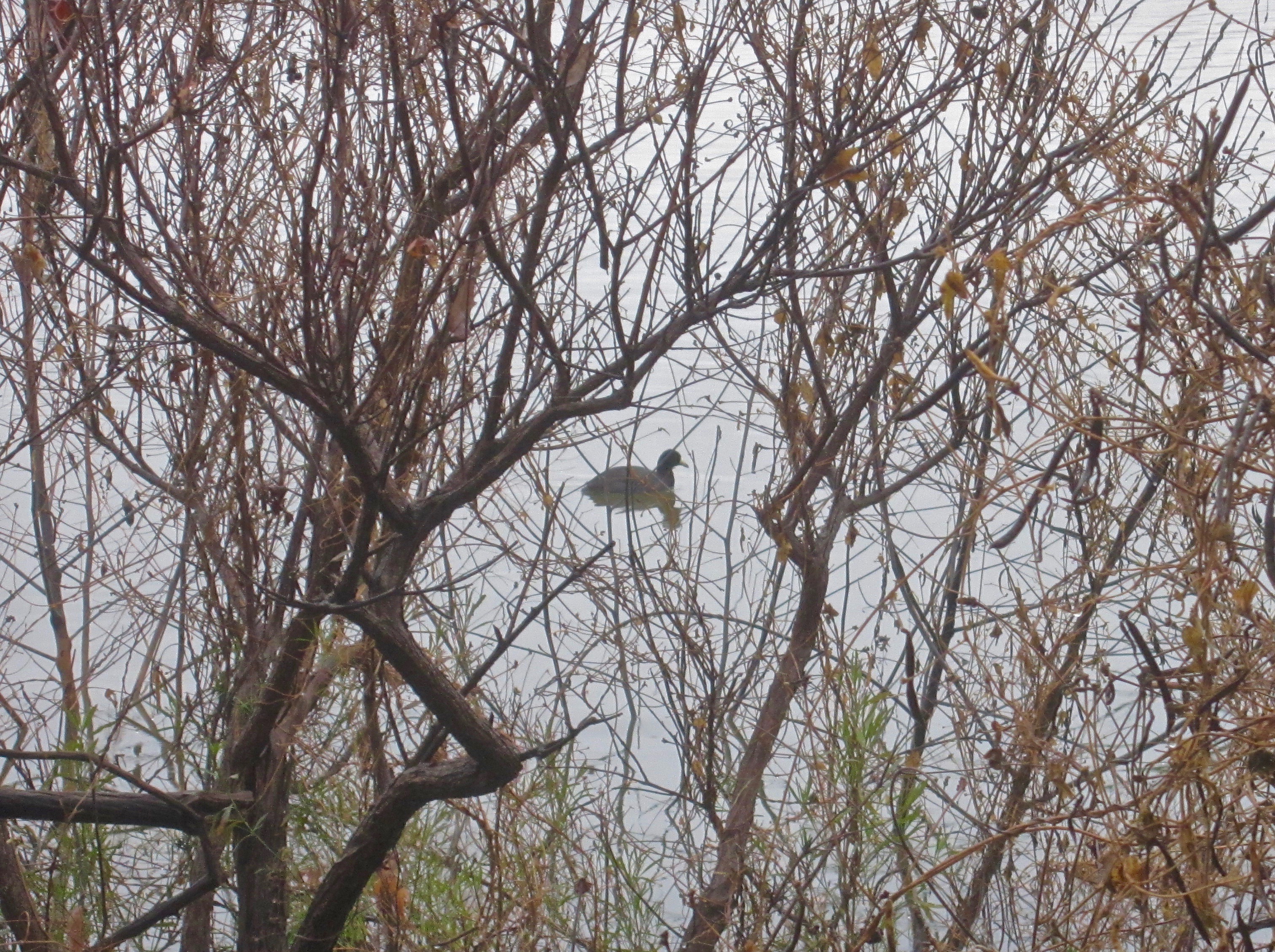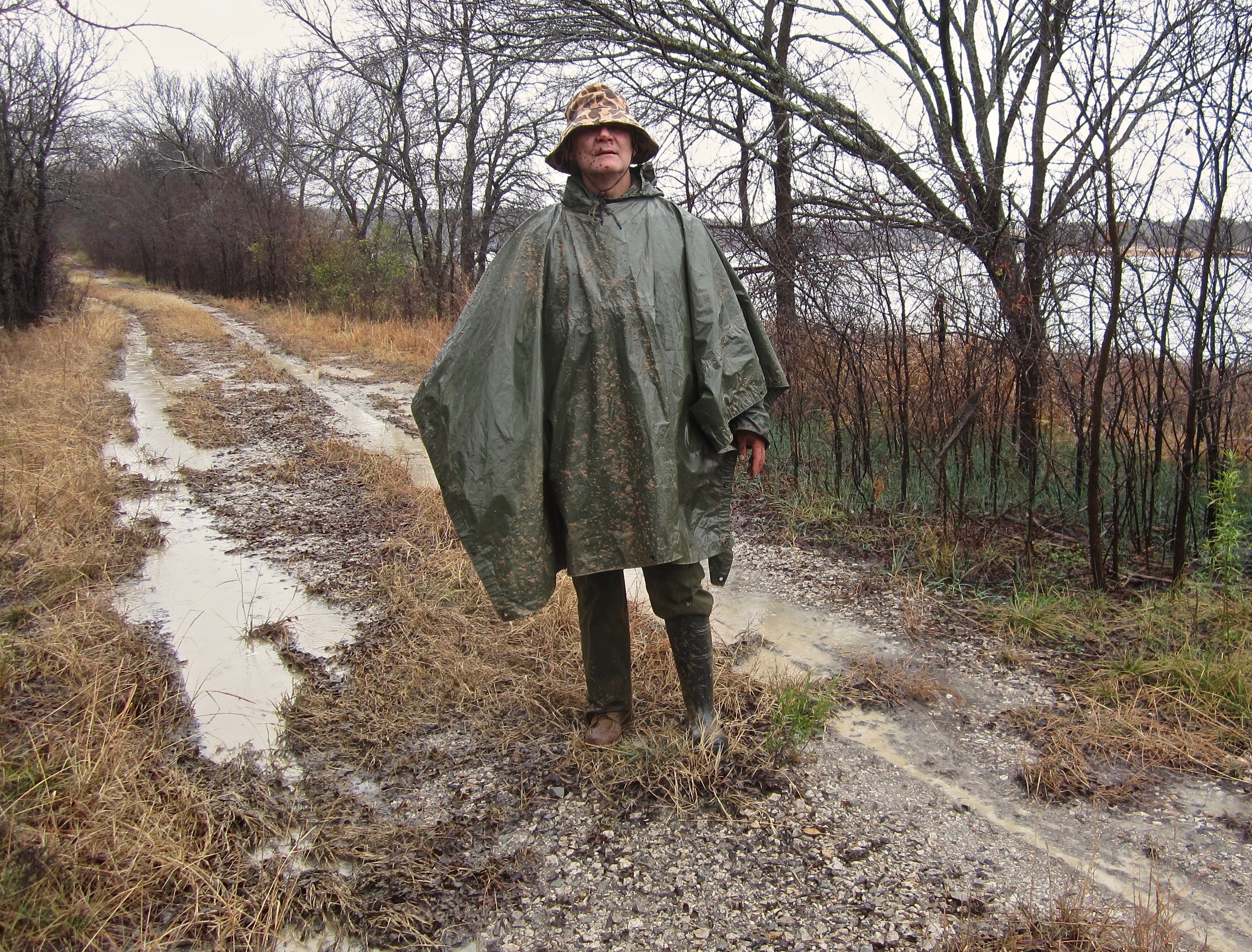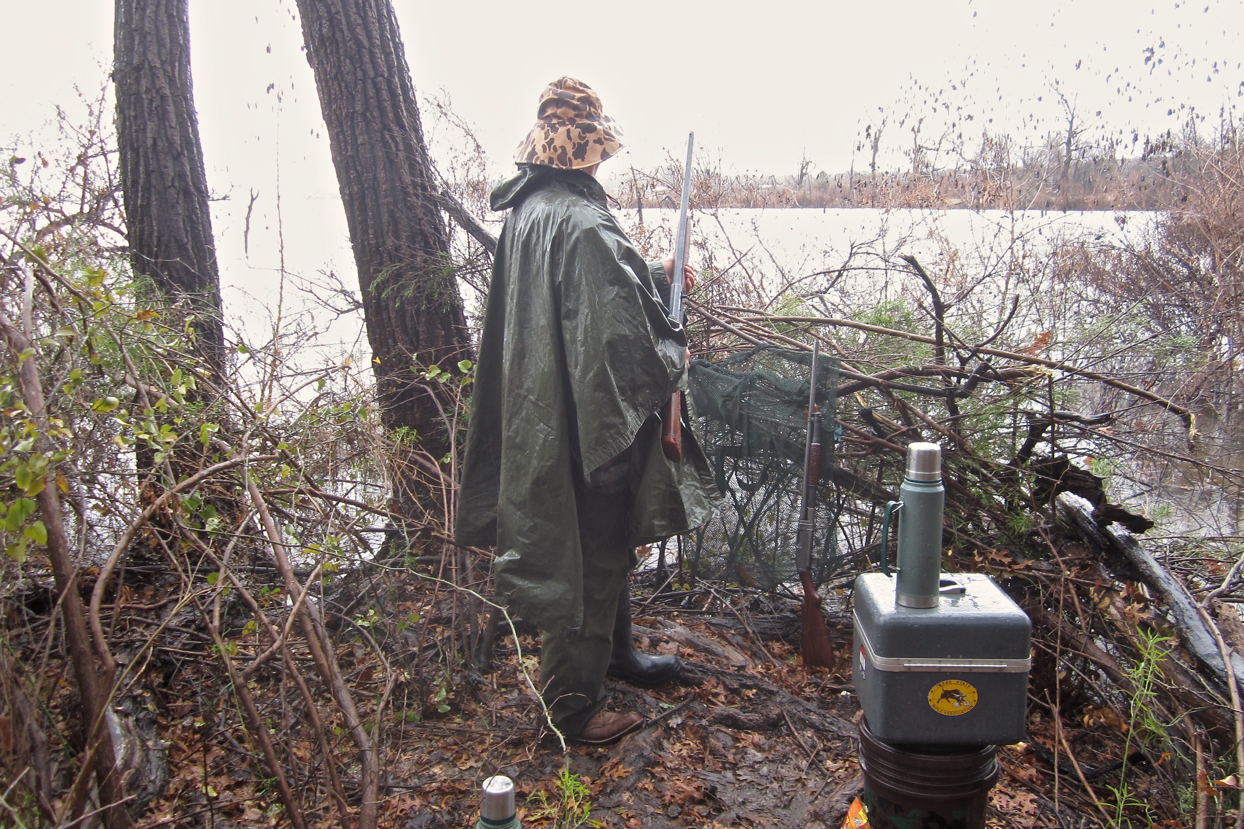 Duck hunting Saturday on our old place on the lake. Digital camera only dried out enough this evening to retrieve photographs and still won't turn off without removing the battery. Rain and 34F all day. Roads a morass. Vehicle stuck twice. Grabbed a pair of rubber boots in the pre-dawn darkness only to later find out that Mrs. noelekal's size 7 had been paired with my size 12. Someone stole four dozen decoys and my waders out of the old lake cabin so only had a half dozen decoys left available. Ducks weren't flying. Only saw six for the entire day and they only laughed derisively at my duck calling efforts. No shots fired. All in all, a grand day out.