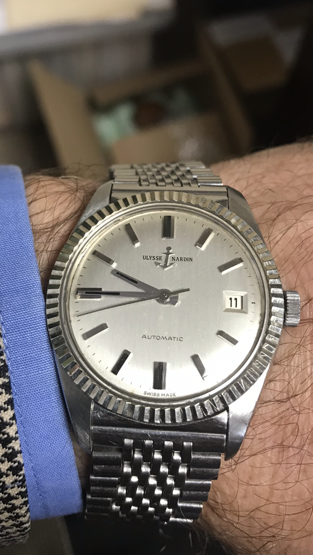 Posts 825 Likes 8,249 Njnjcfp88 ·Dec 11, 2018 Just got this 36mm circa 1969 Ulysse Nardin. Ref. 10922 ...the gilded N11K J movement keeps time very accurately. Love the 18k white gold bezel. Reminiscent of the Datejust ..So worth the $1600 I paid for it. ...
