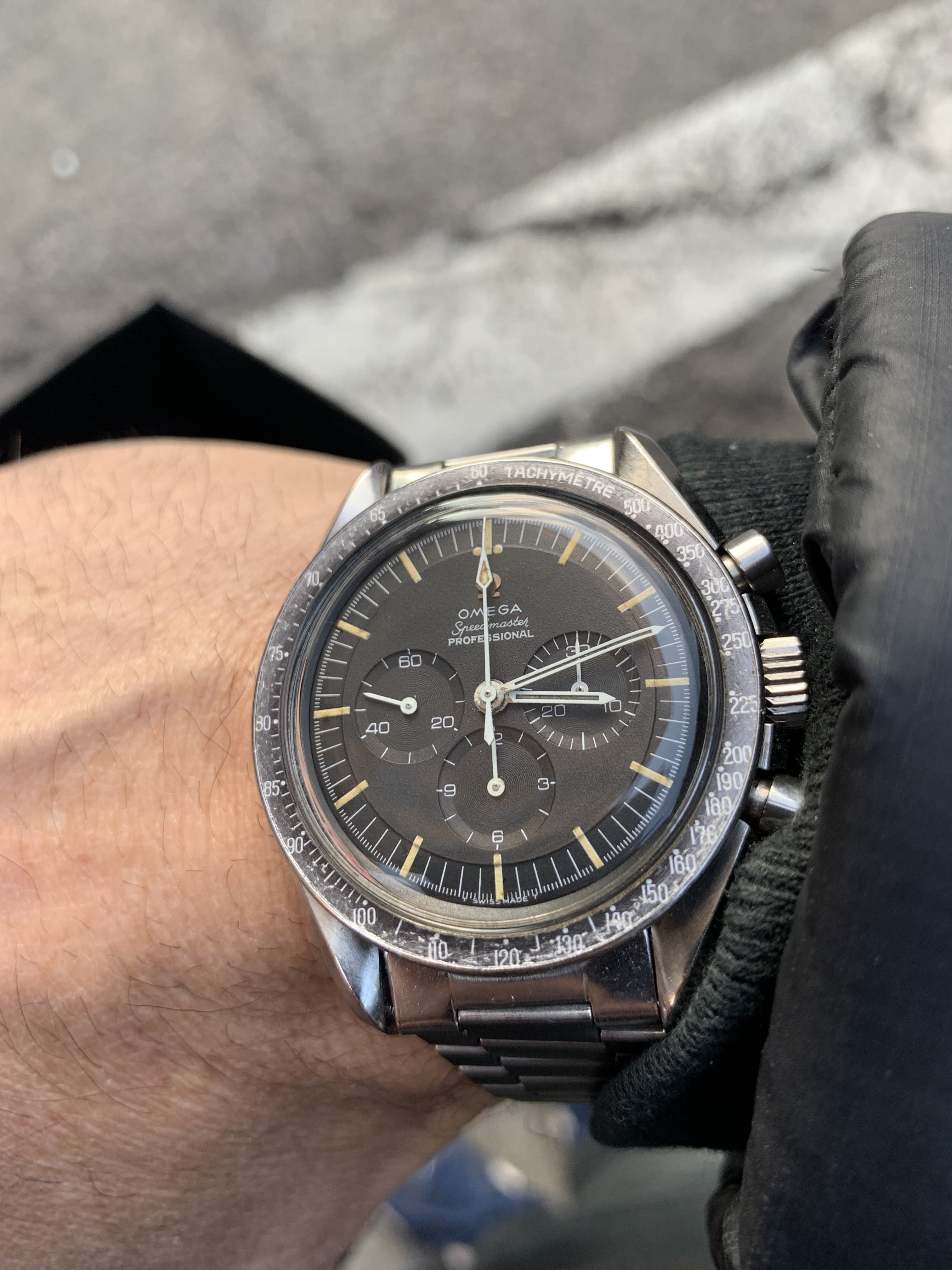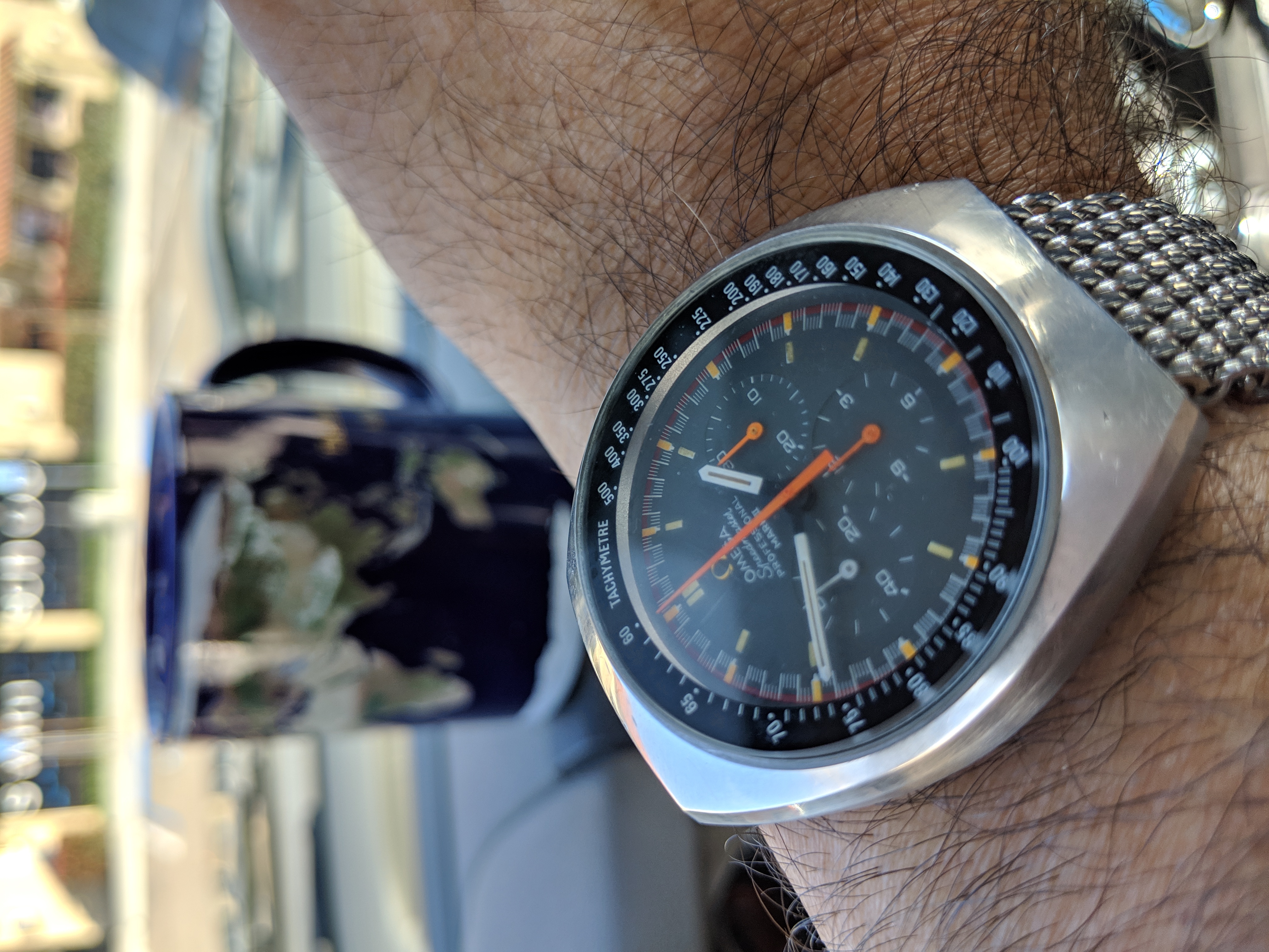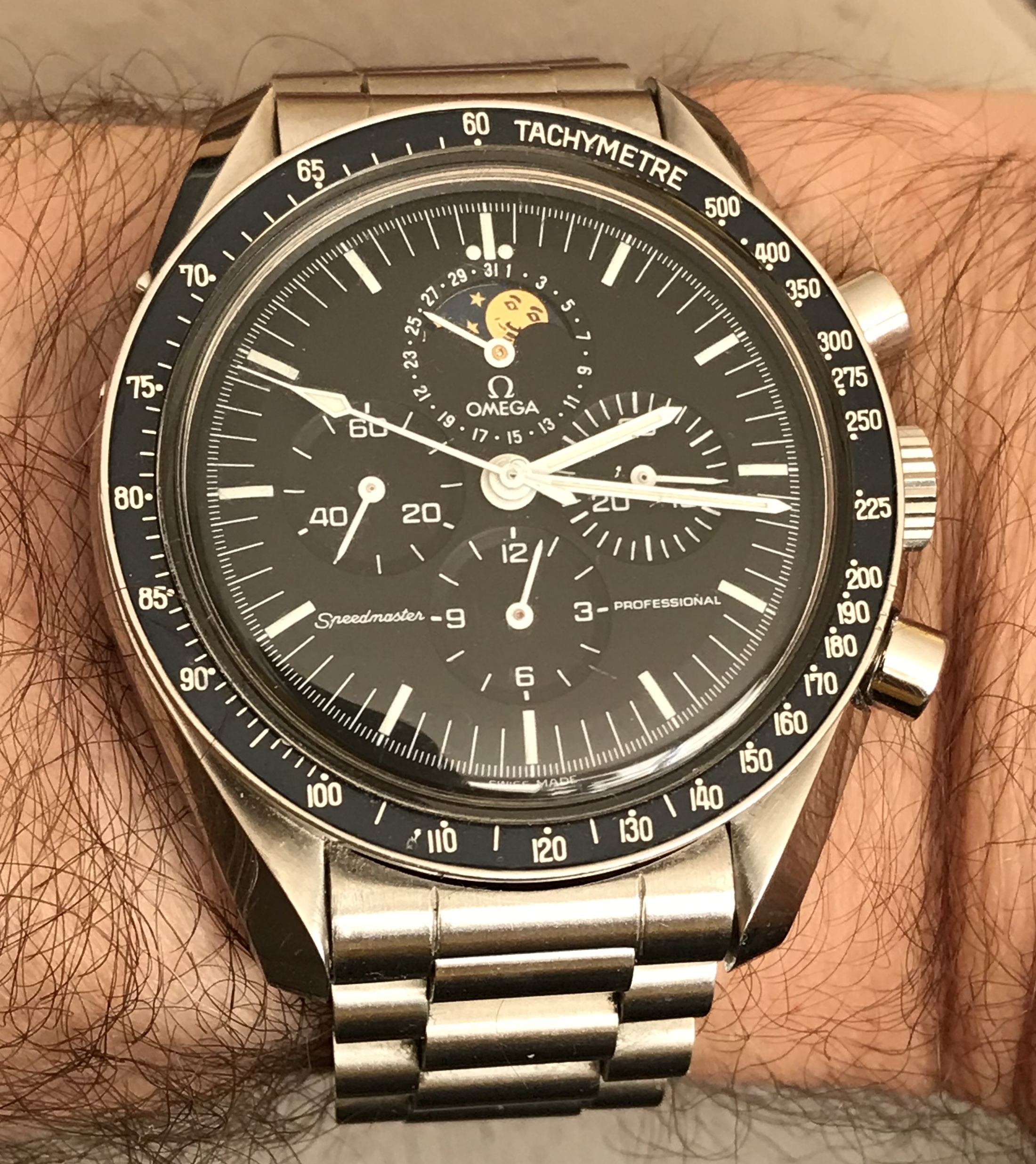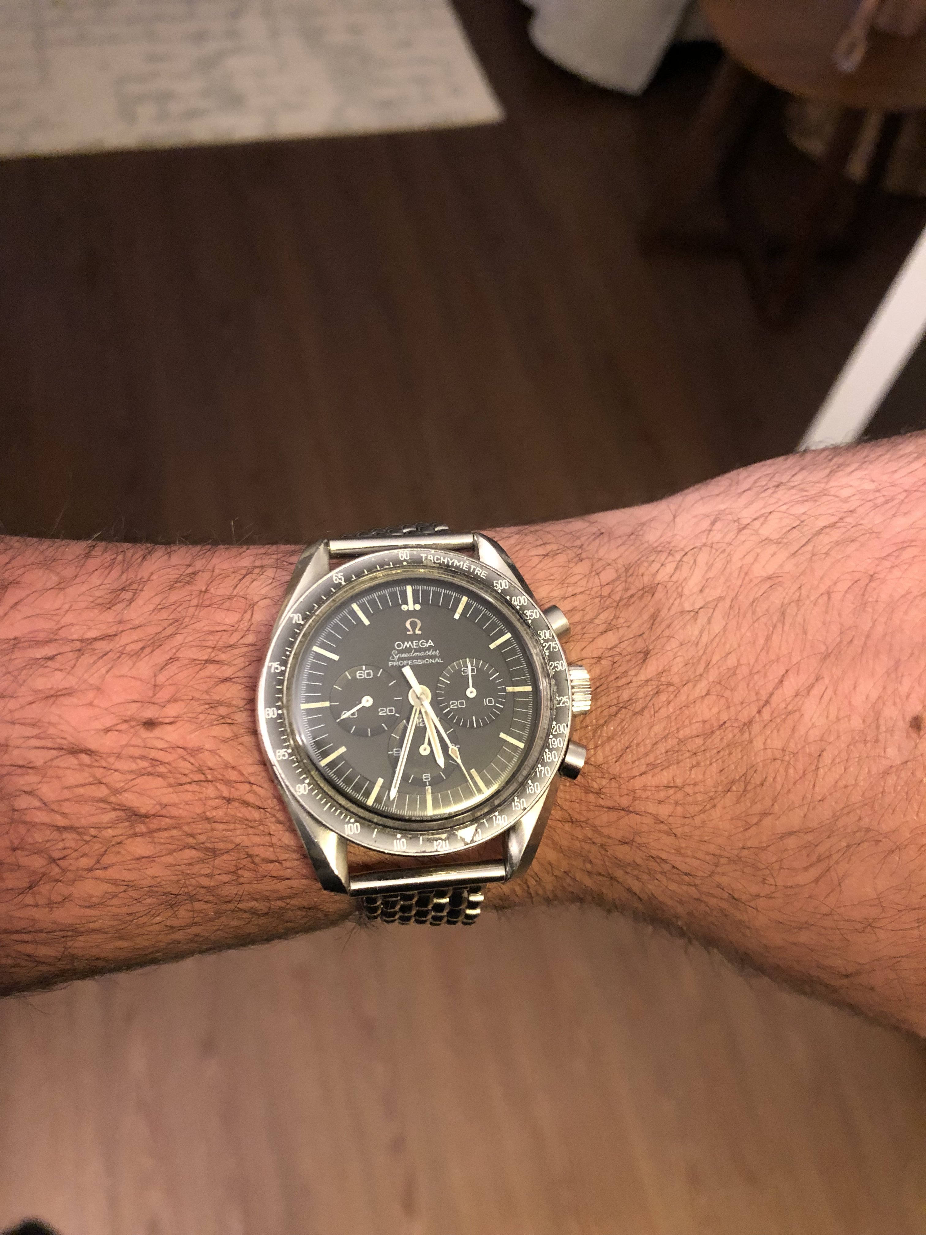 It’s in a completely Omega service set up. Service luminova dial (but early - see the number of hash marks in between the second markers to compare with later ones) and luminova hands (the chrono seconds hand should be flat bottomed, but I like the old fashioned style), in a service Omega Speedymoon case.