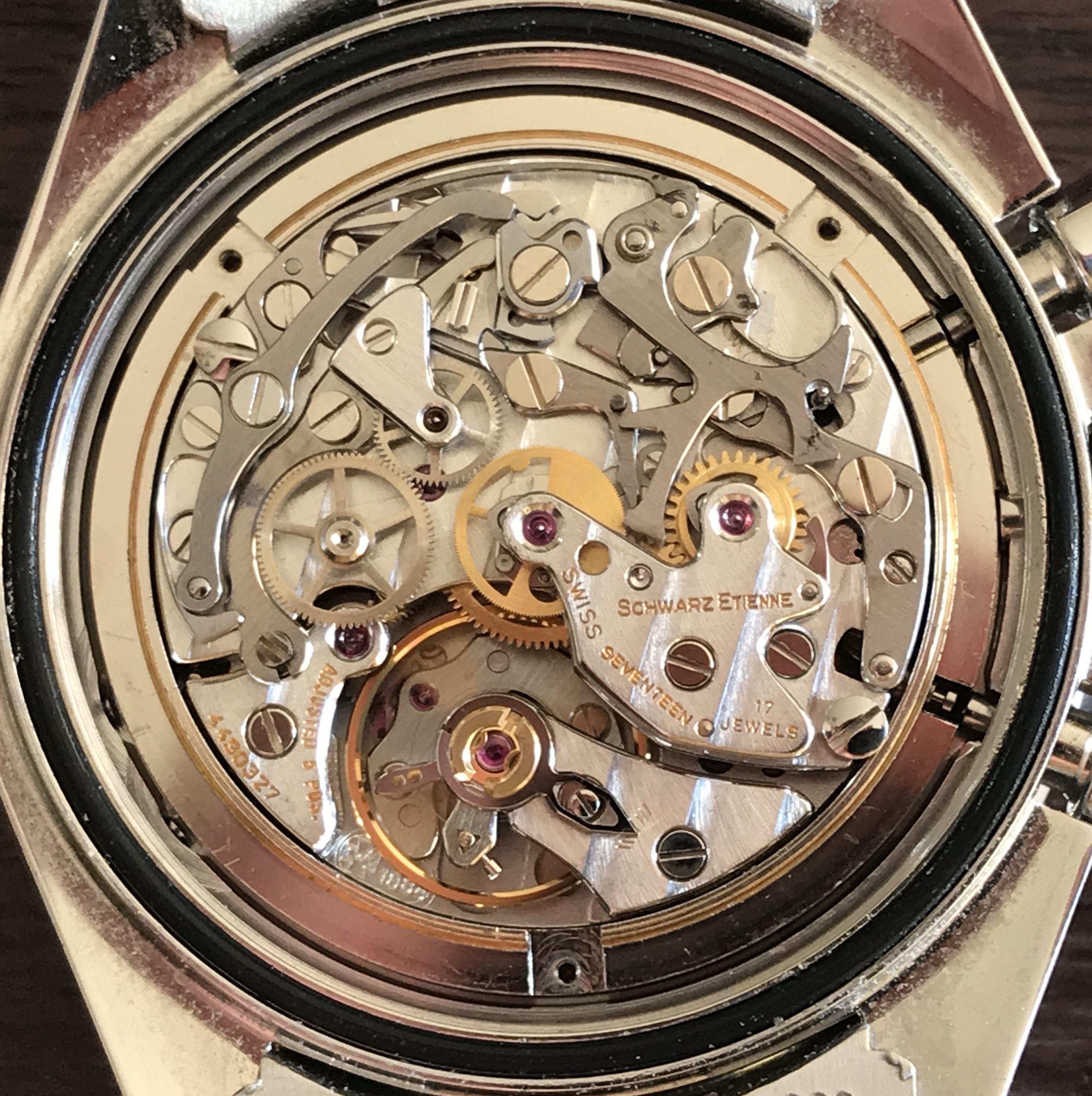 I finally got around to opening it, to take better shots of the Lemania (Schwarz Etienne prepared) movement.