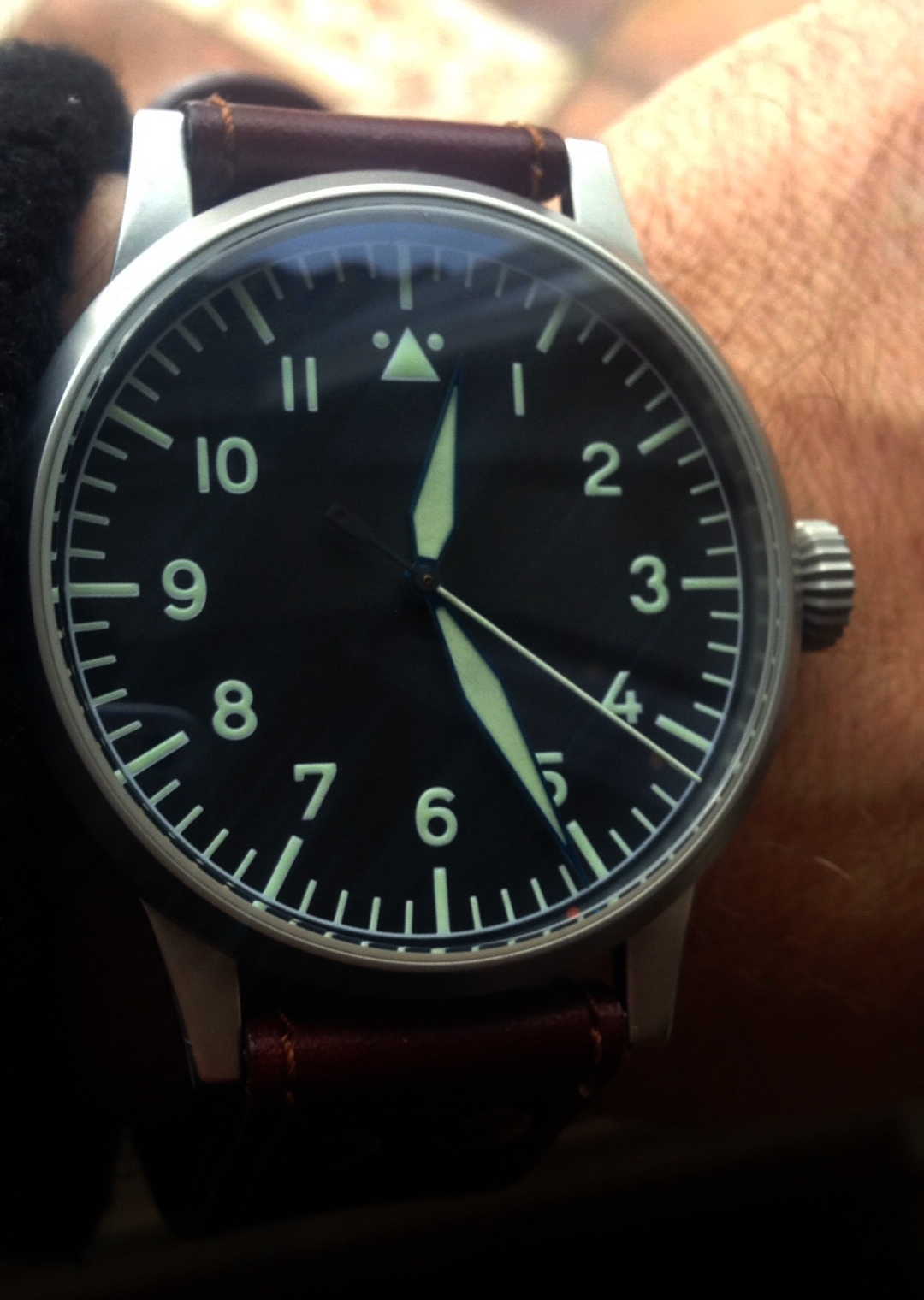 My only "tribute" watch. Laco "flieger" WW2 handwound caliber ETA2801-2 "Top Grade". Had to take a movement shot to demonstrate how small it looks in the 45mm case....