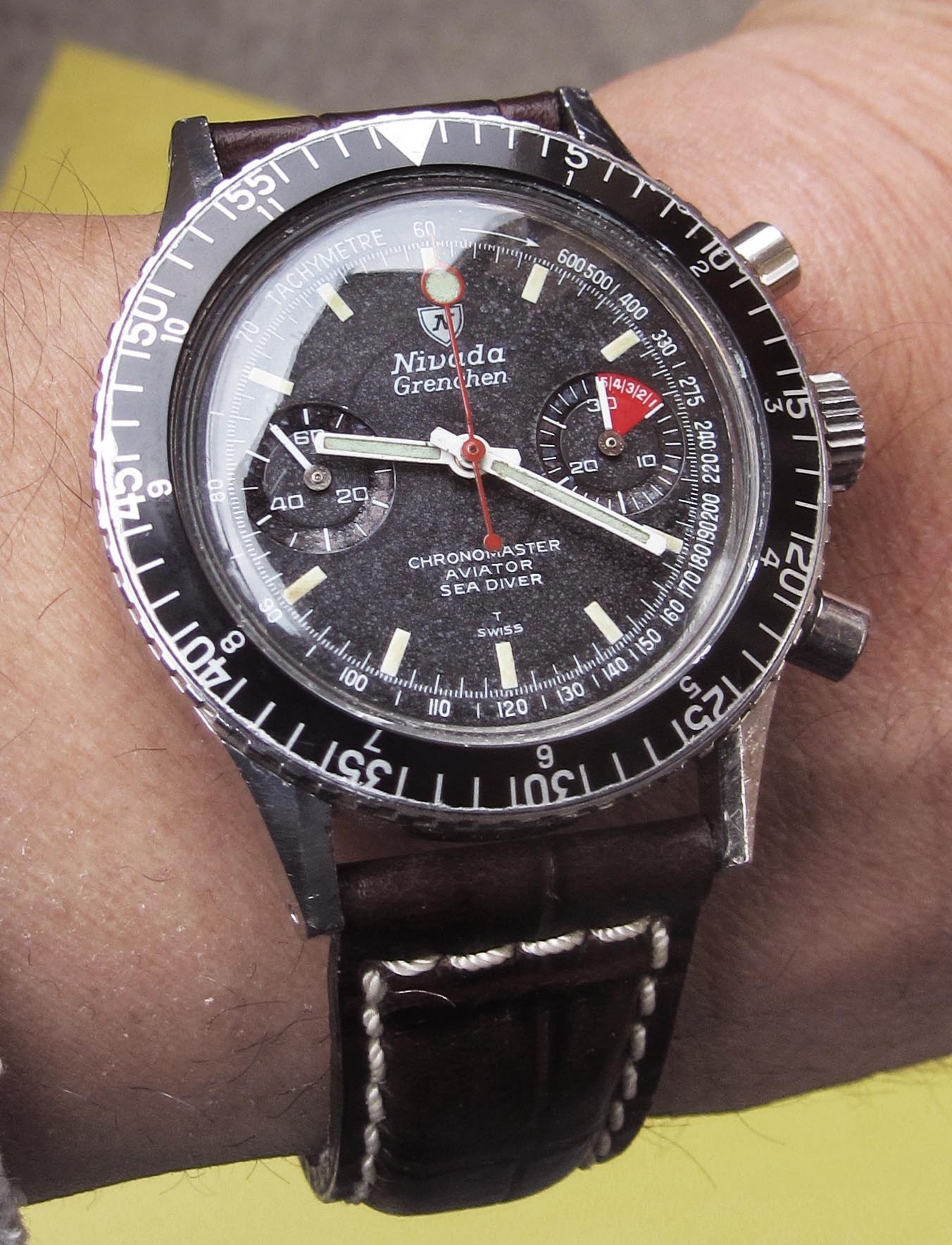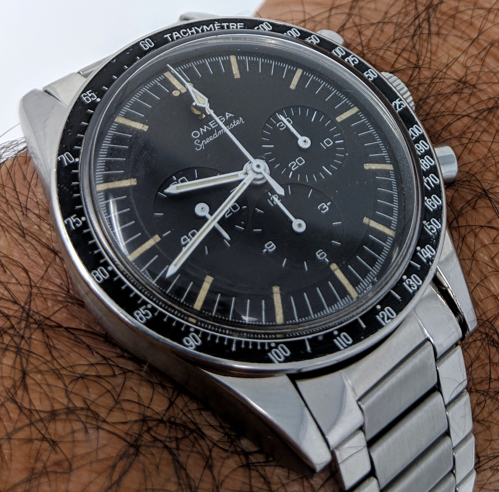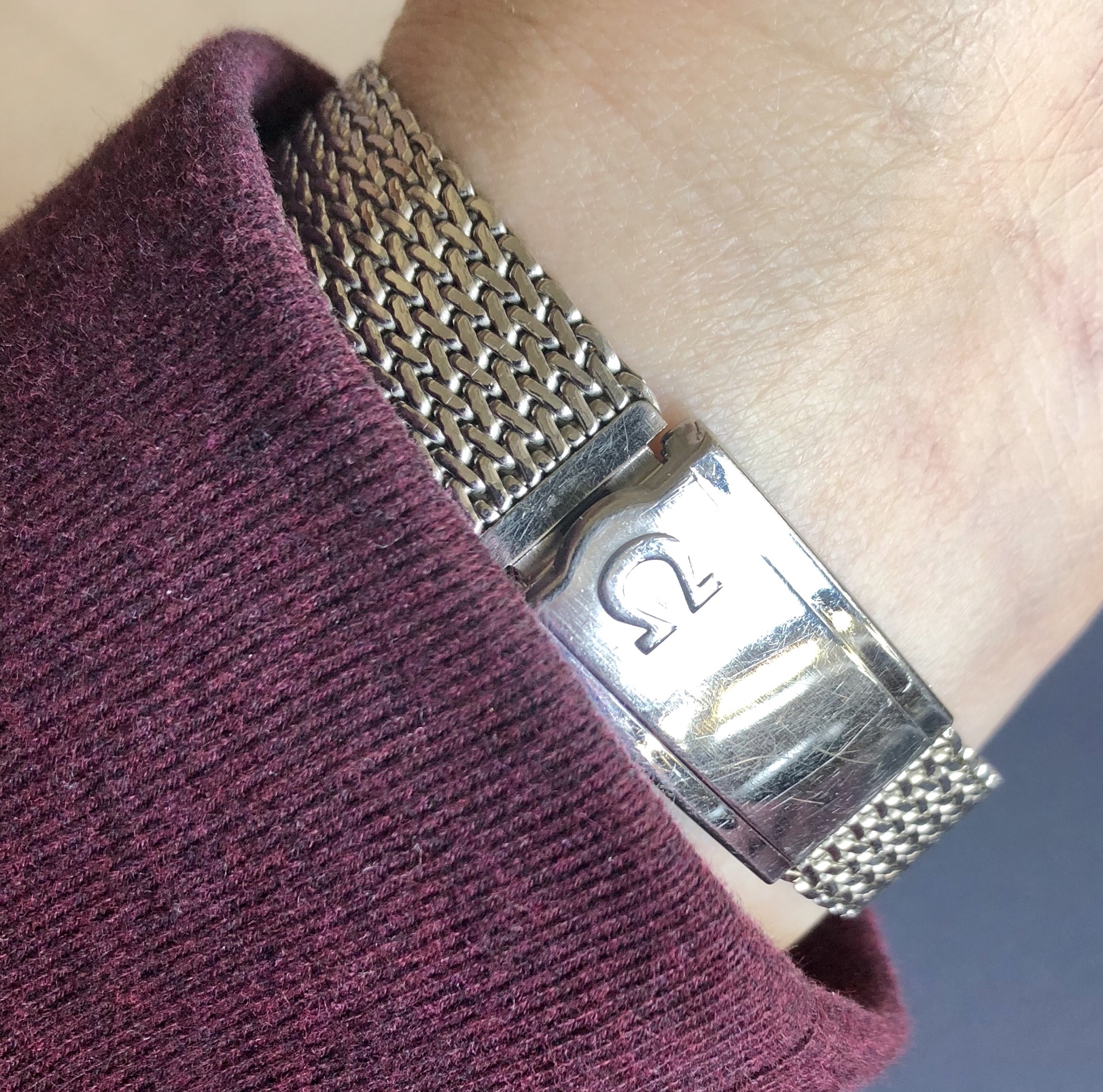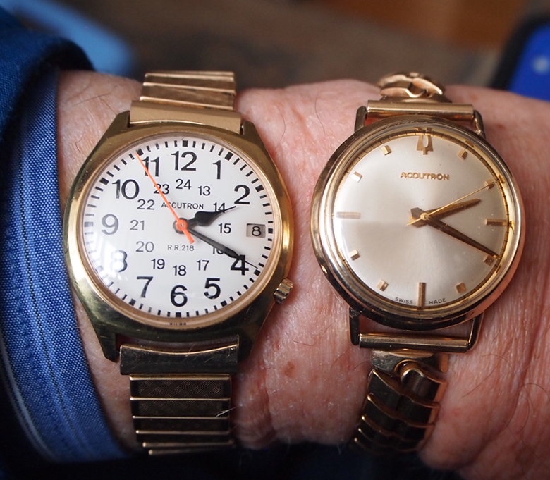 What am I wearing today? Well, more than one. These are two of 7 or 8 Accutrons I have added to the collection since Christmas. The one on the left is a 218 model with date and 24-hour Canadian railroad dial. The one on the right is a 214 model from 1962. The case is one not often seen. It is a karat gold shell over stainless steel. The case came to me with no movement, and was rough. Two badly bent lugs, one cracked. My goldsmith friend declined the repair of the cracked lug, so I came to my shop and warmed up my silversmithing talents and my acetylene torch, and fixed it myself. Last time I showed this (several days ago), it was on a leather strap. But I have since retrieved a period correct gold filled “scissor” type expansion bracelet from my stash, and I prefer it. The dial newer, and is not original to this case. The hands are period correct Accutron.