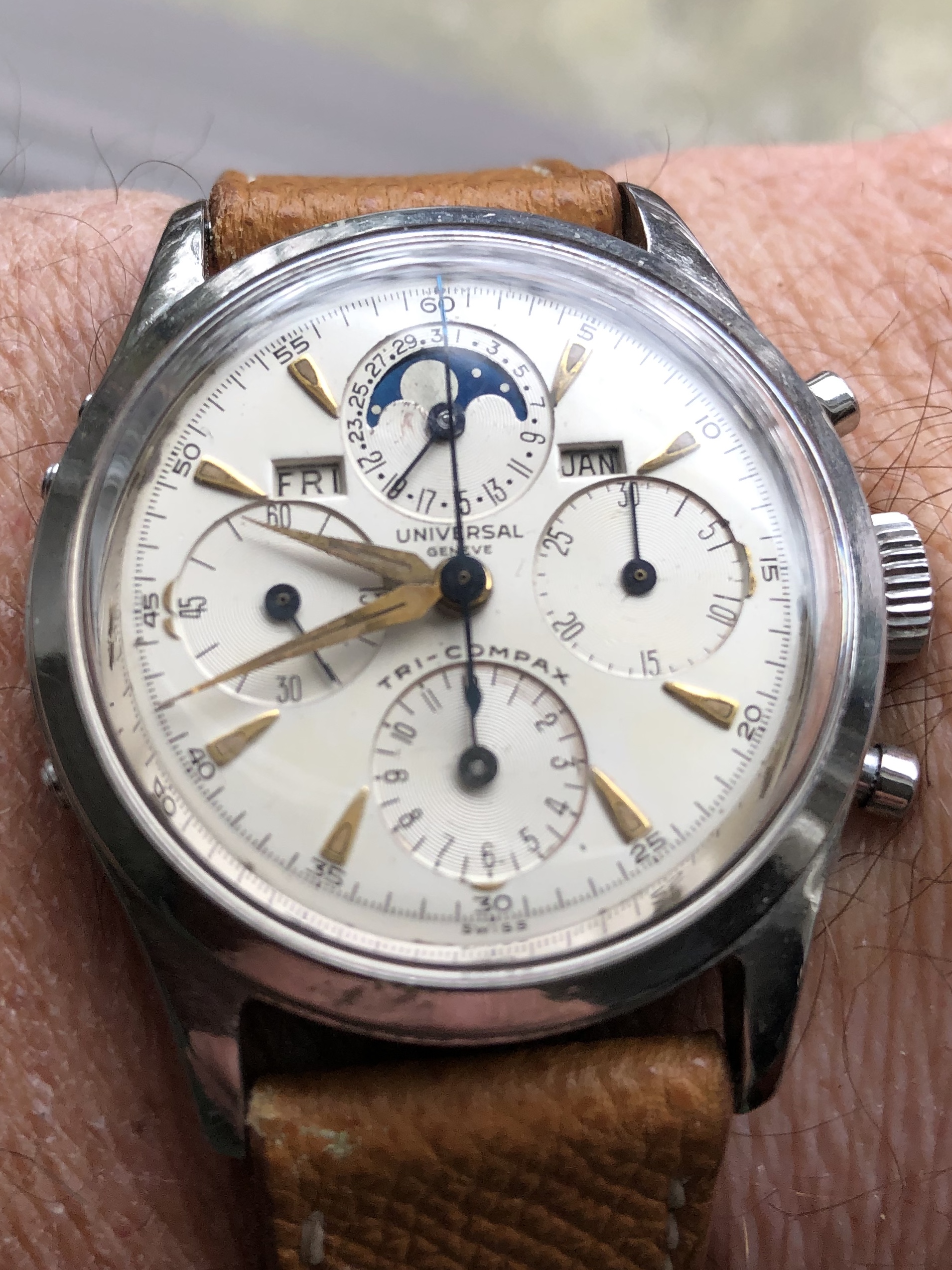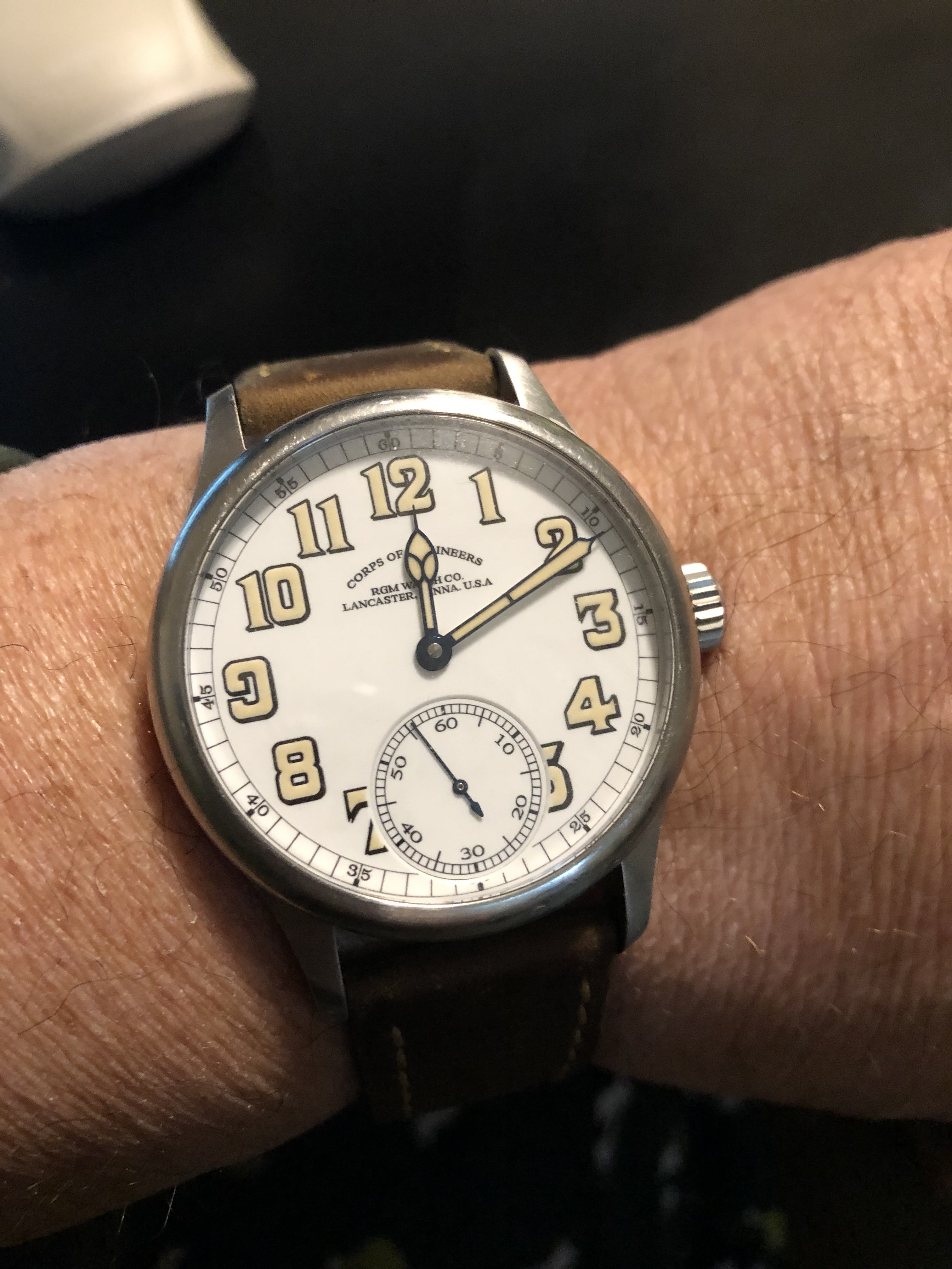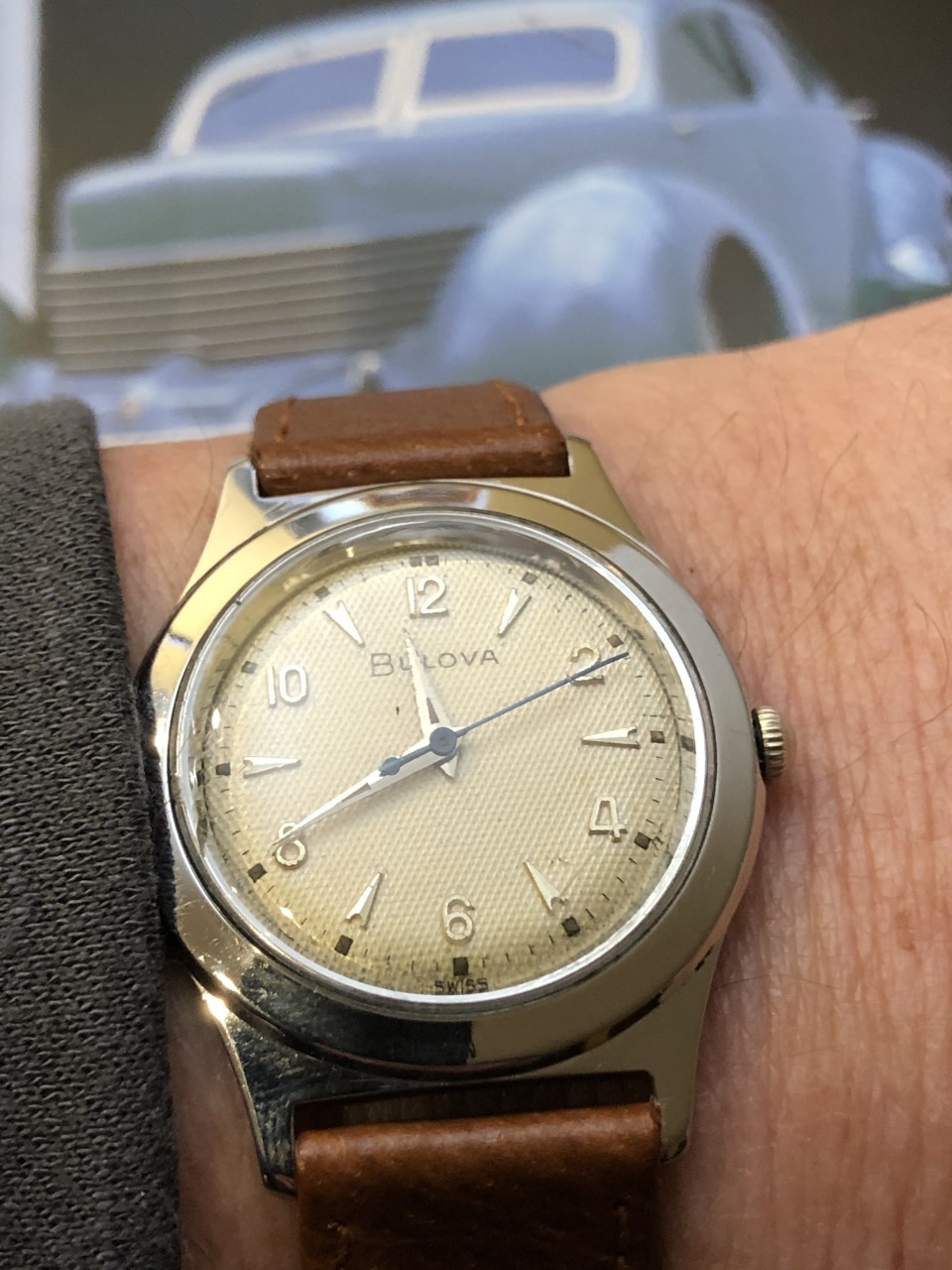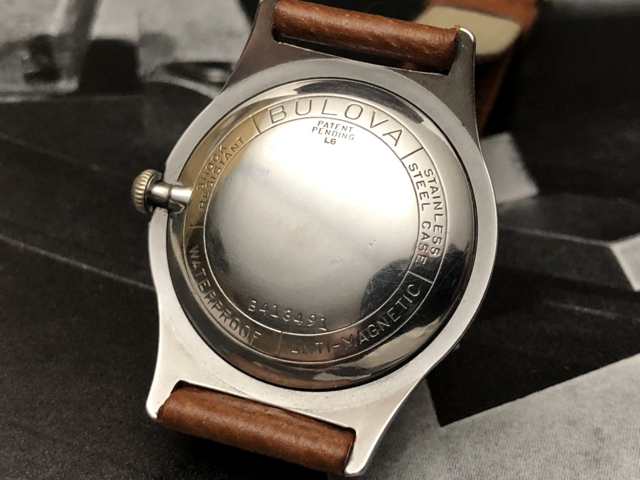 1956 Bulova, not certain of the model, a "Phantom", perhaps....love its clean lines and simplicity....just shy of 34mm diameter, 42mm lug-to-lug, a bit over 9mm thick case back to top of crystal....Swiss seventeen jewel 11ACC movement.