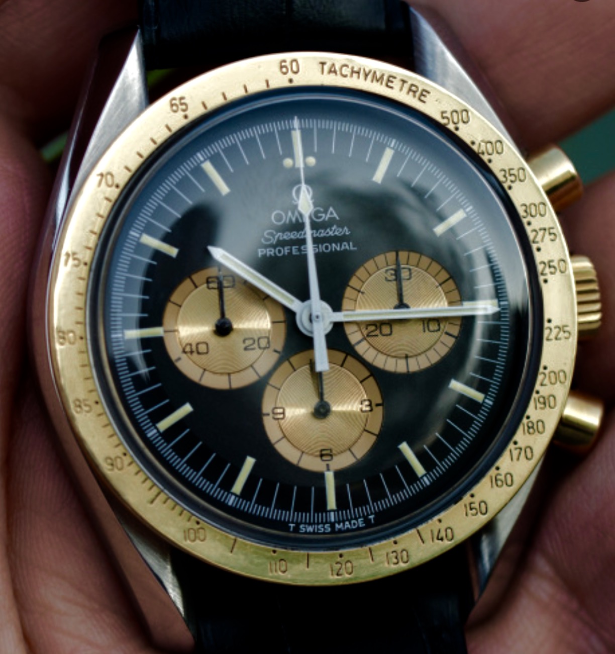 - 18K solid gold Speedmaster on strap (27 CHRO C12 Jubilee on thin ostrich and plated tang buckle)