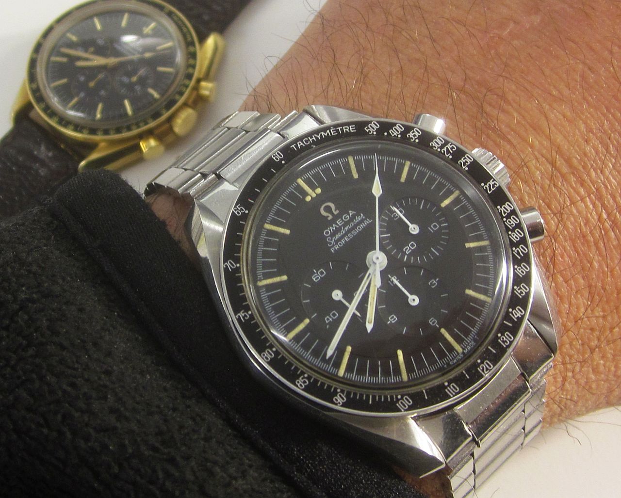I shall wear the Moonwatch, but they're really within a skosh of each other. Just shows that the gold adds to the weight of the head by about the amount a flat link bracelet...around 30g...which may not be as much as some would intuitively think. YaY!