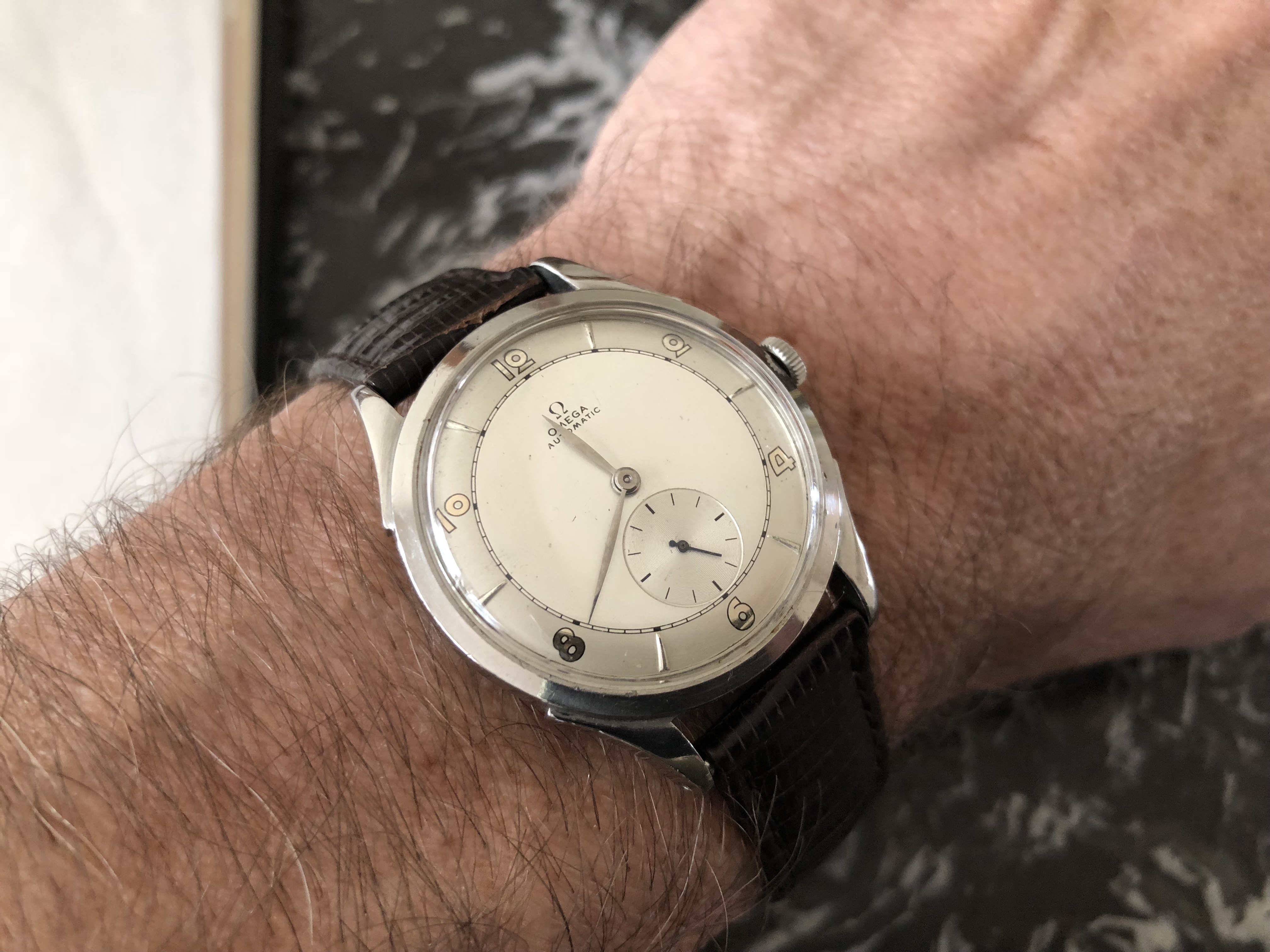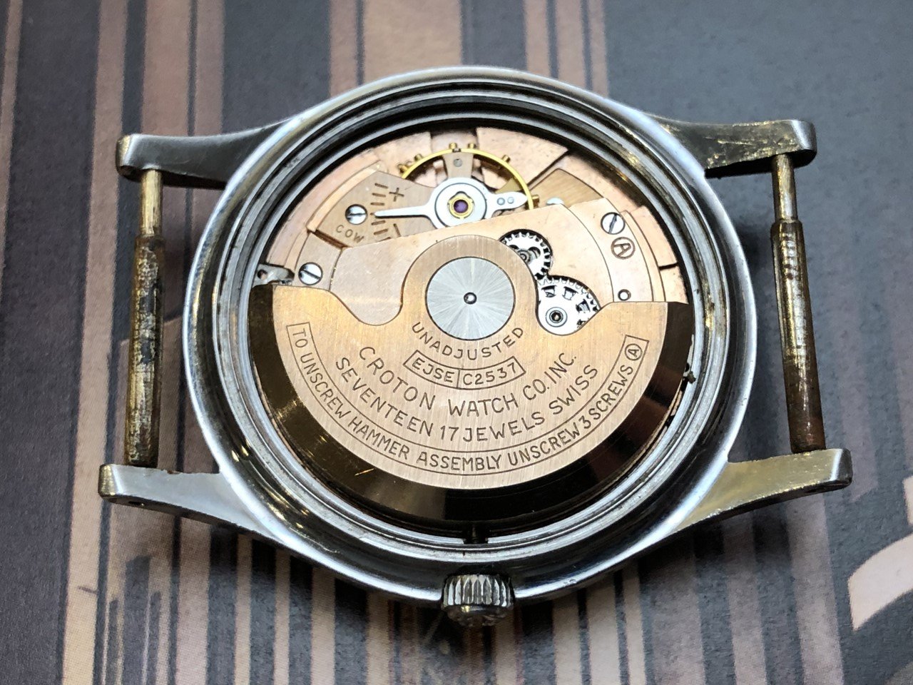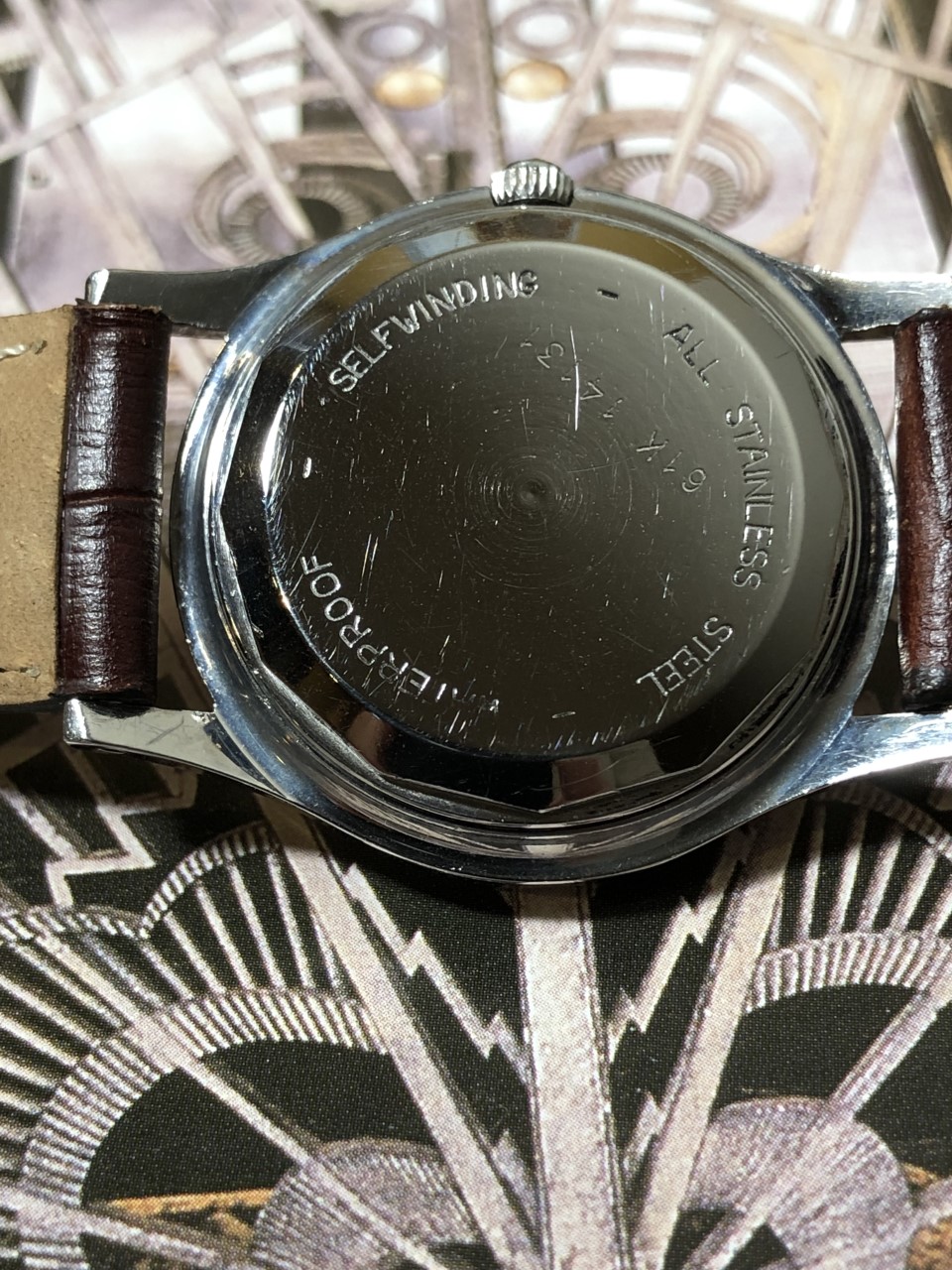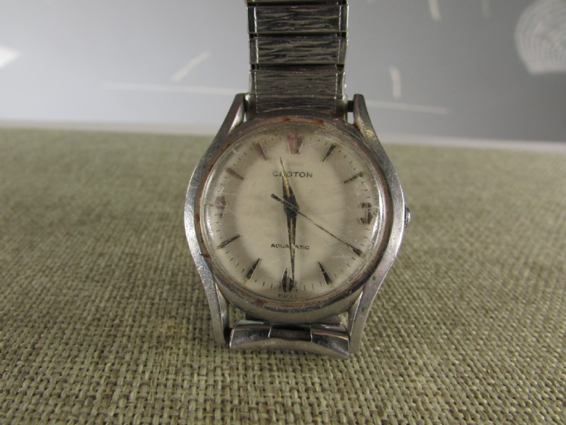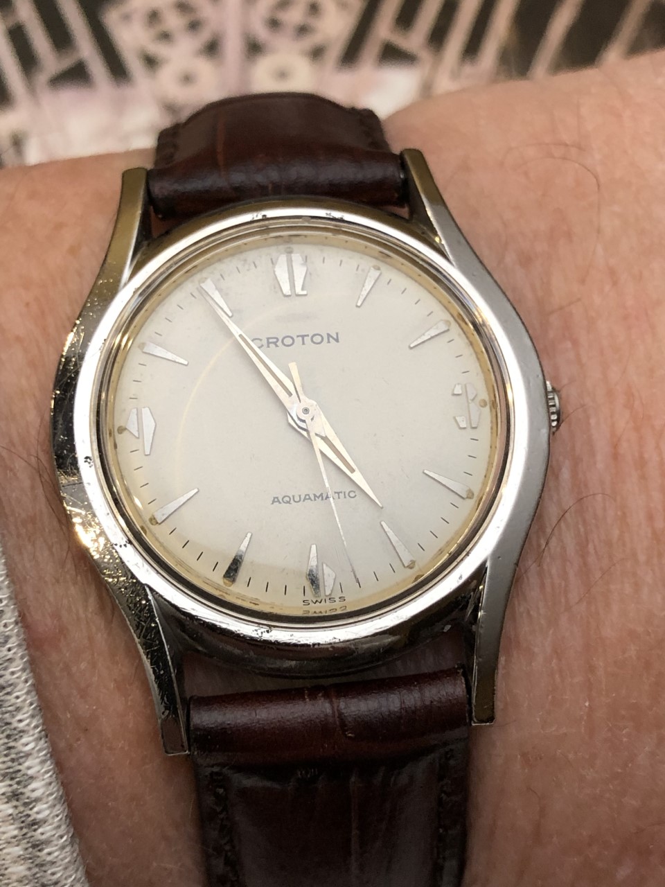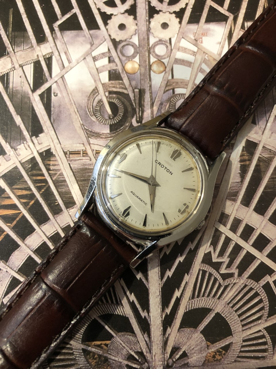 1950s Croton Aquamatic just back from WM for clean up and service. I admit, I bought it for the stylized numerals. A number of these Aquamatics have found their way into my collection. I have found these automatics to be nearly indestructible and very accurate timekeepers. This one is all stainless steel with a screw down back, 33mm diameter, 41mm lug-to-lug, 18mm strap.