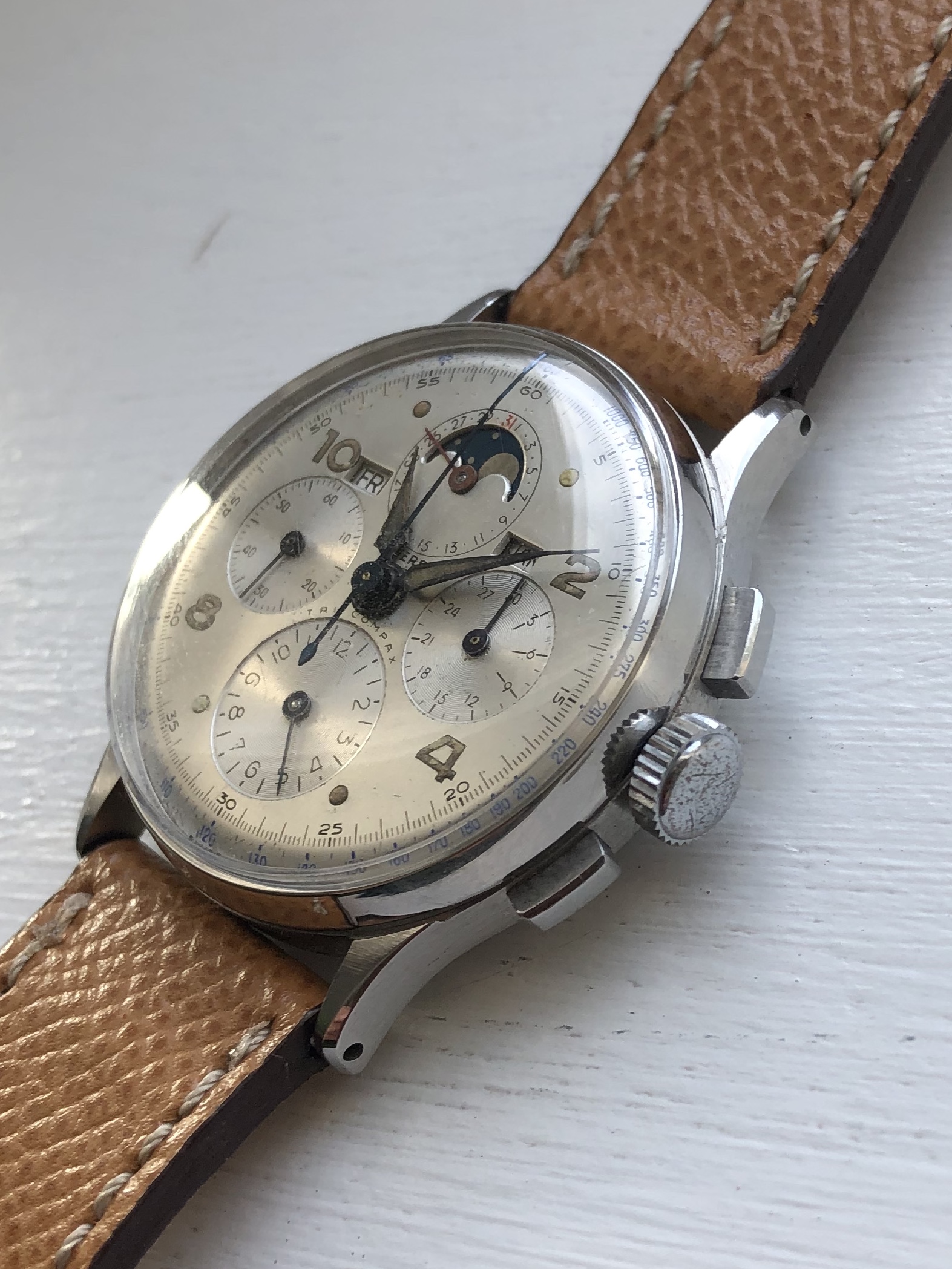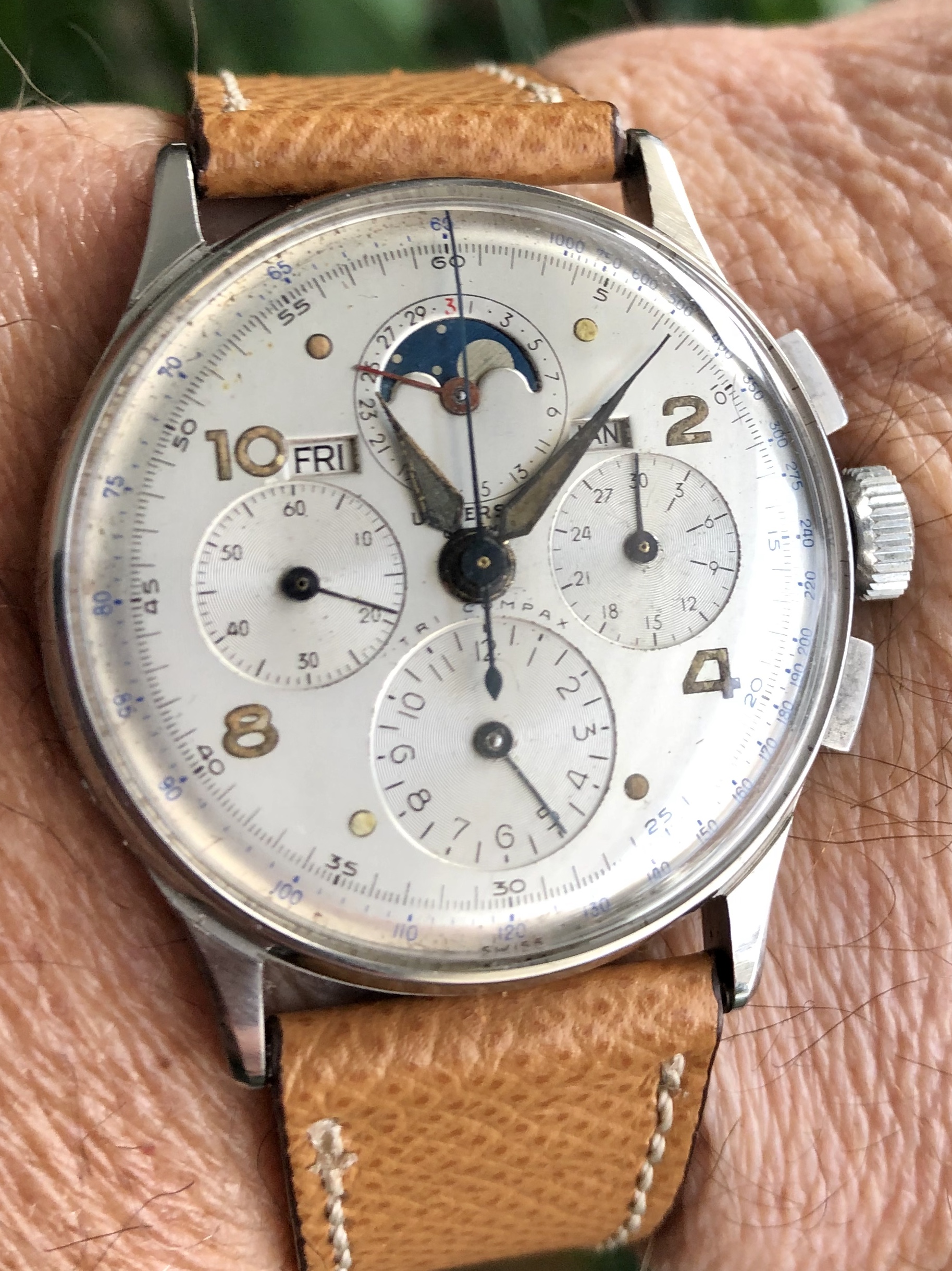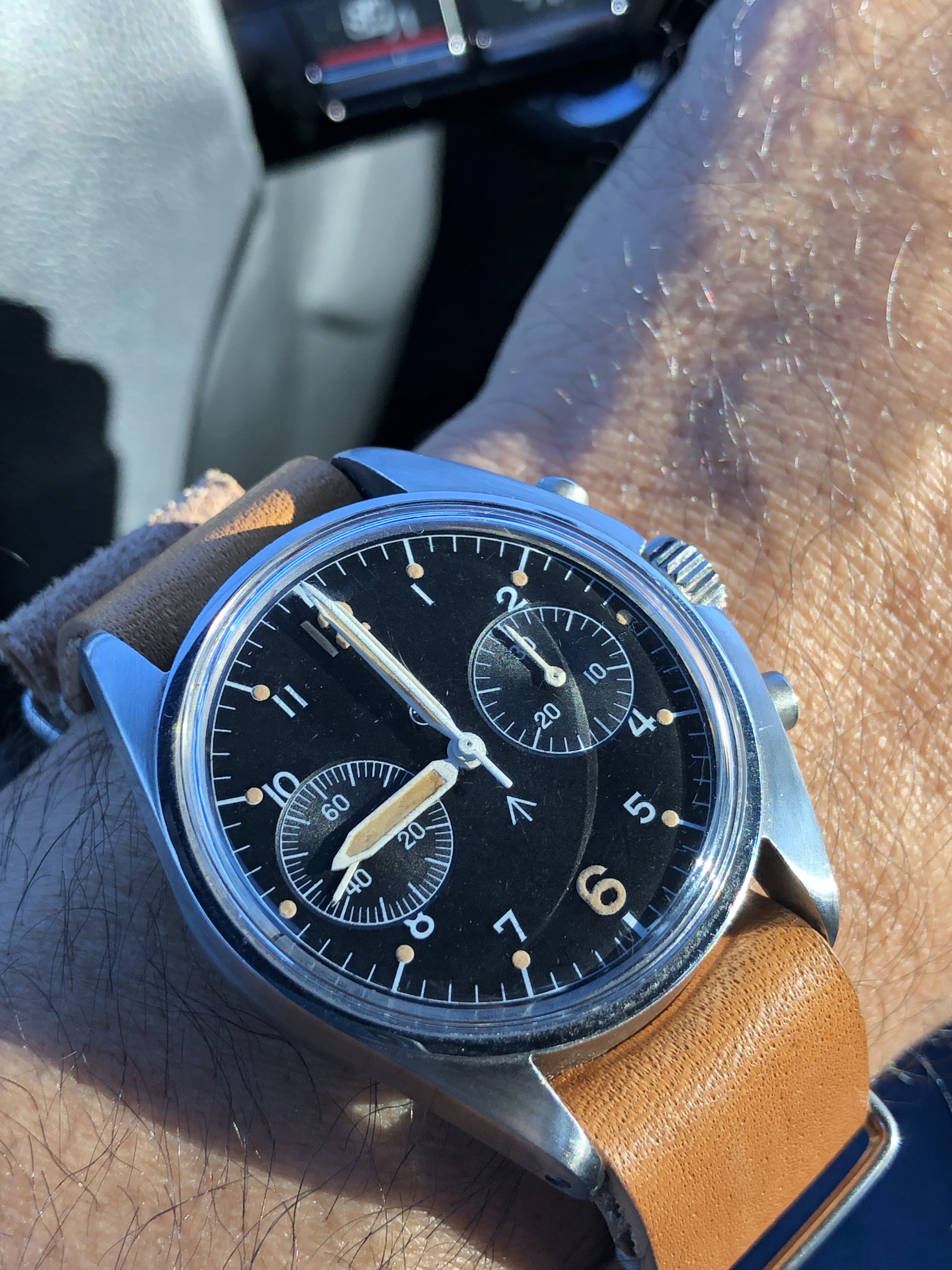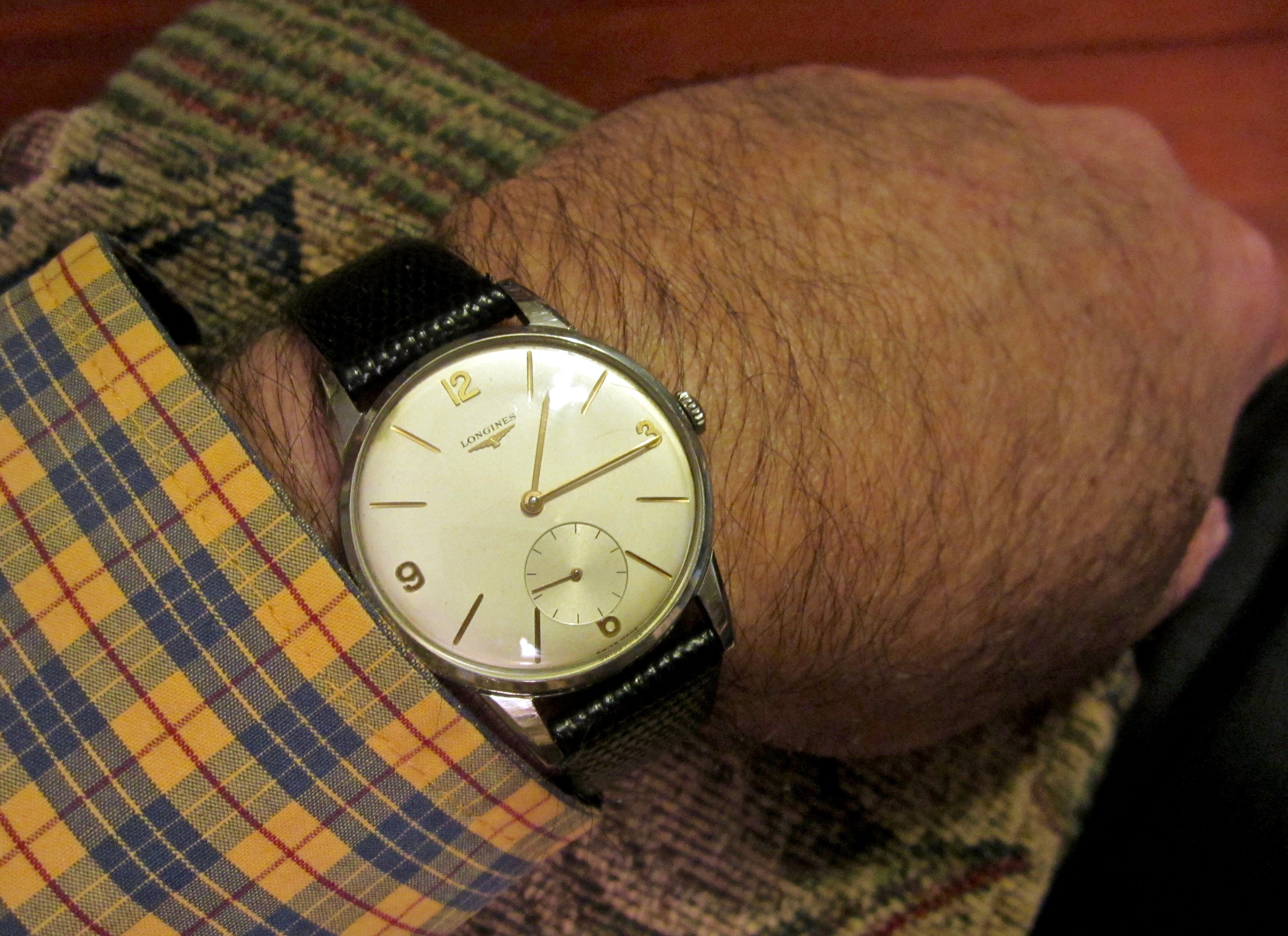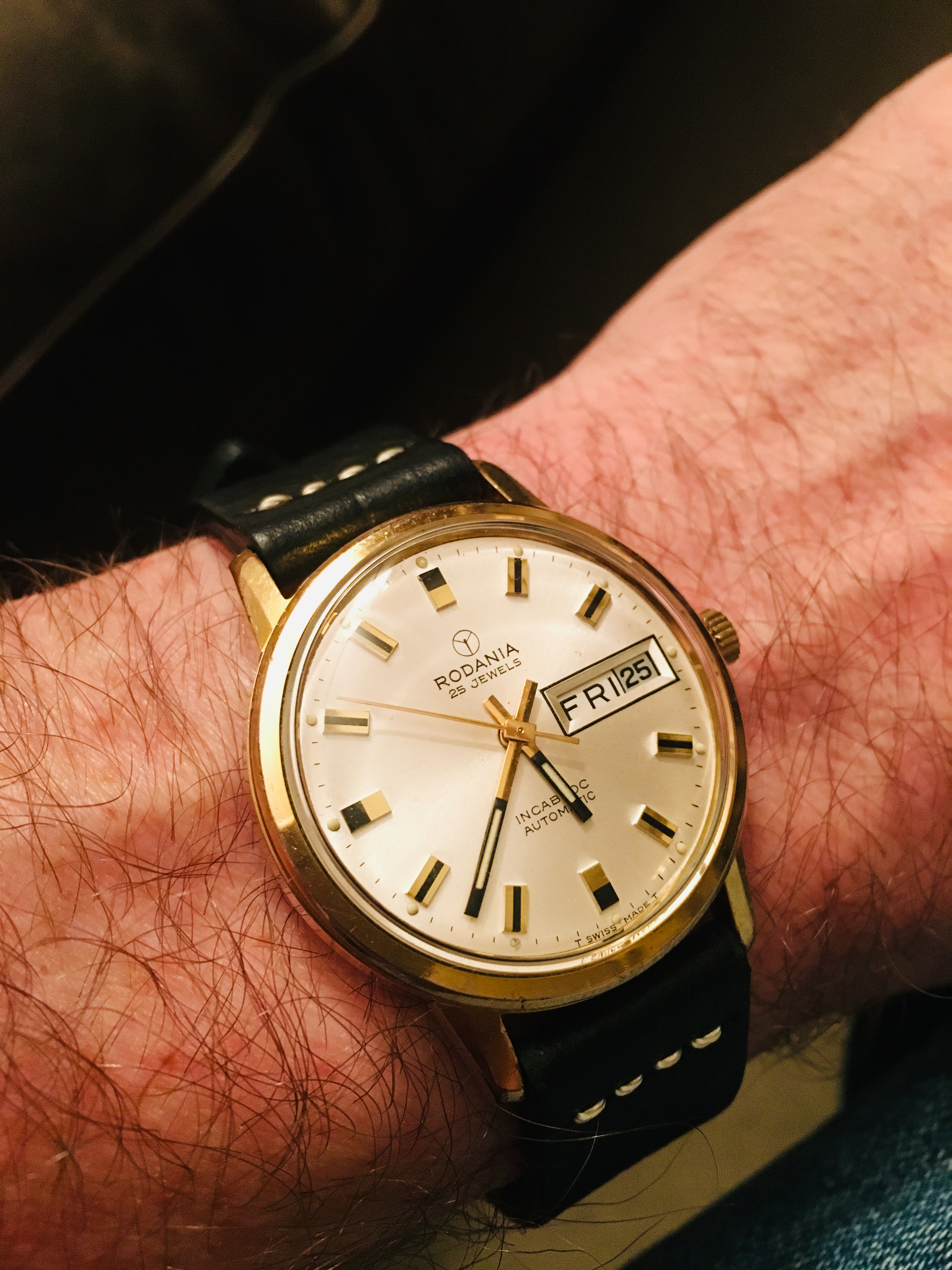 1950s Croton Aquamatic just back from WM for clean up and service. I admit, I bought it for the stylized numerals. A number of these Aquamatics have found their way into my collection. I have found these automatics to be nearly indestructible and very accurate timekeepers. This one is all stainless steel with a screw down back, 33mm diameter, 41mm lug-to-lug, 18mm strap.